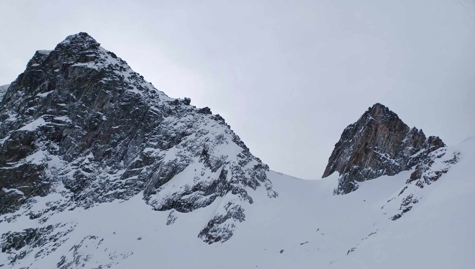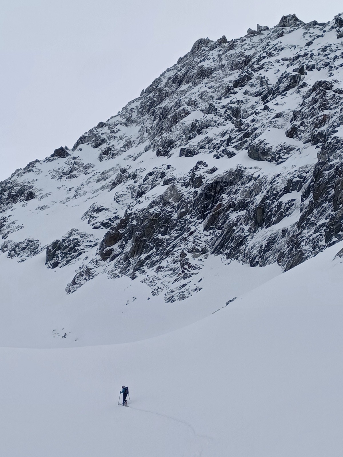 Nous rejoignons rapidement le col de la Valloire où s'étend une nouvelle vallée "inexplorée". La descente est faite prudemment en passant au travers des nombreux lacs (Glacé, Noir, Blanc). Etant parti pour une boucle, nous remontons la combe W qui mène au col d'Arguille. Nous longeons l'impressionnante face N du Rocher d'Arguille, comme un un air d'ailleurs... La glace est présente au col, quelques marches taillées permettront de le rejoindre sans encombres. Le vent forcit, nous ne tardons pas à dépeauter pour éviter le refroidissement puis nous filons au col du Tépey.