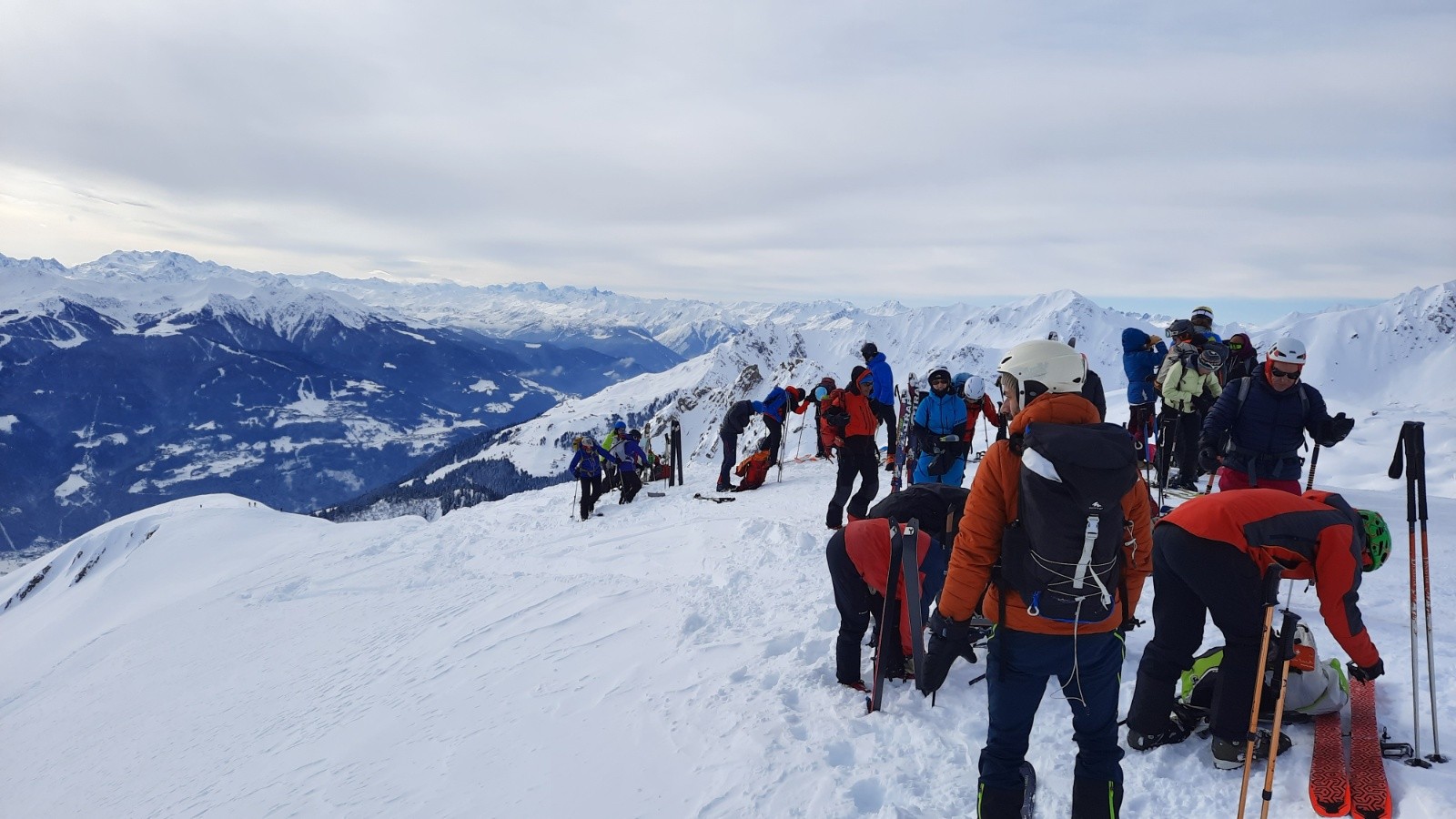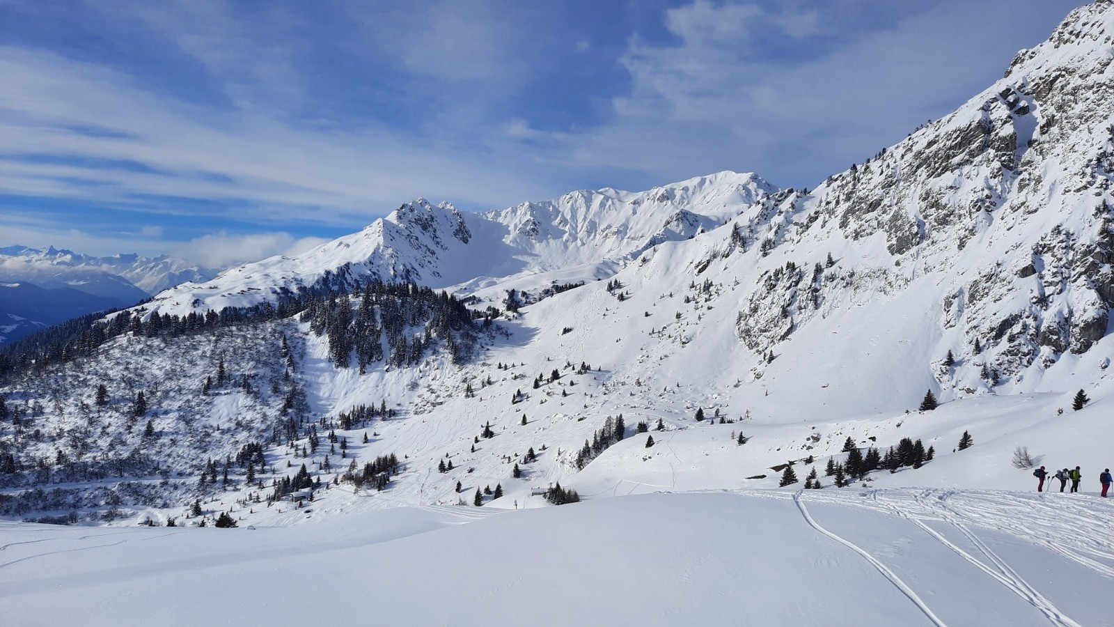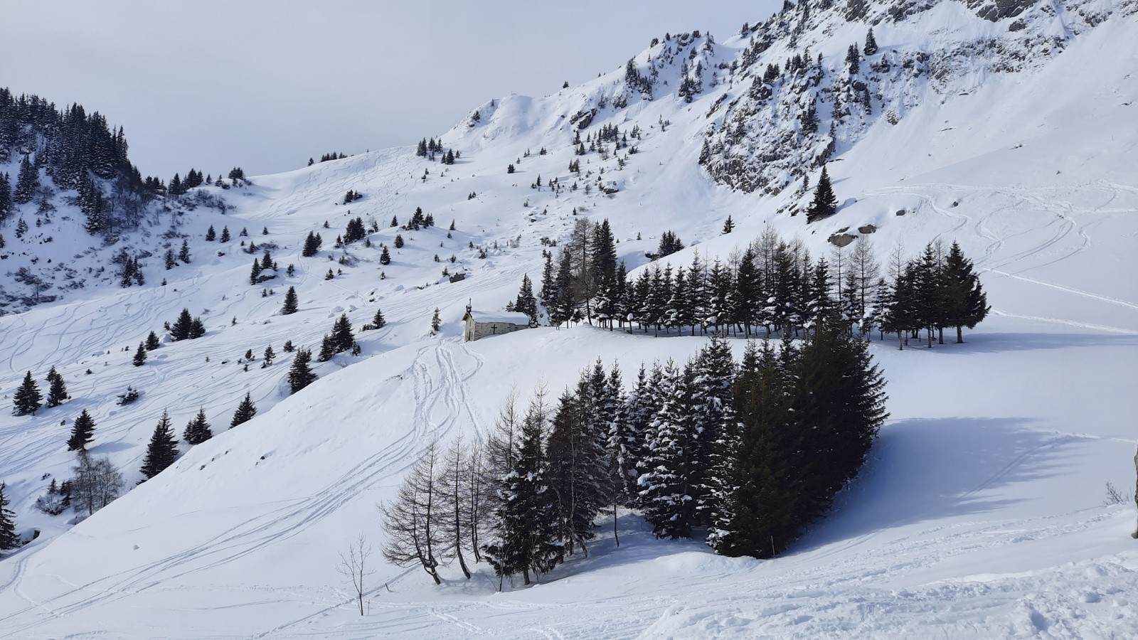 Horaires : Montée 8h45-12h00. Sommet juste assez venté pour donner envie de repartir sans tarder. Descente 12h15-14h30 abritée et entrecoupée par un pique-nique et un exercice de recherche de DVA/sondage aux chalets de Chambrier (1900m)