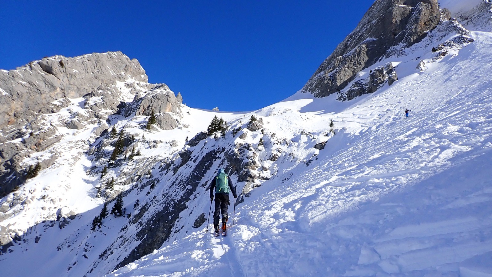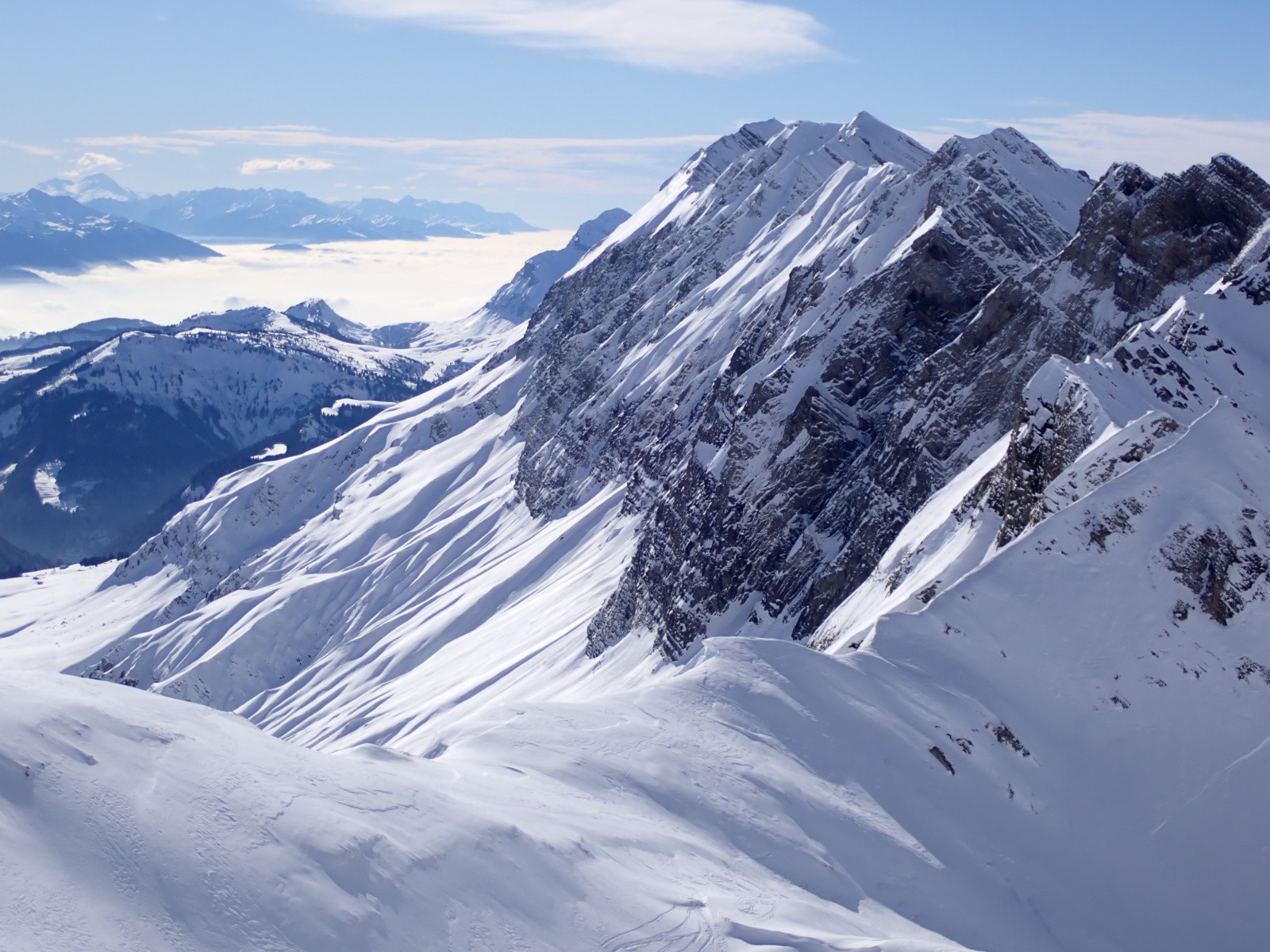 Travaillée par le vent sur le flanc N de la combe, donc décevante: alternance croûte /poudre.