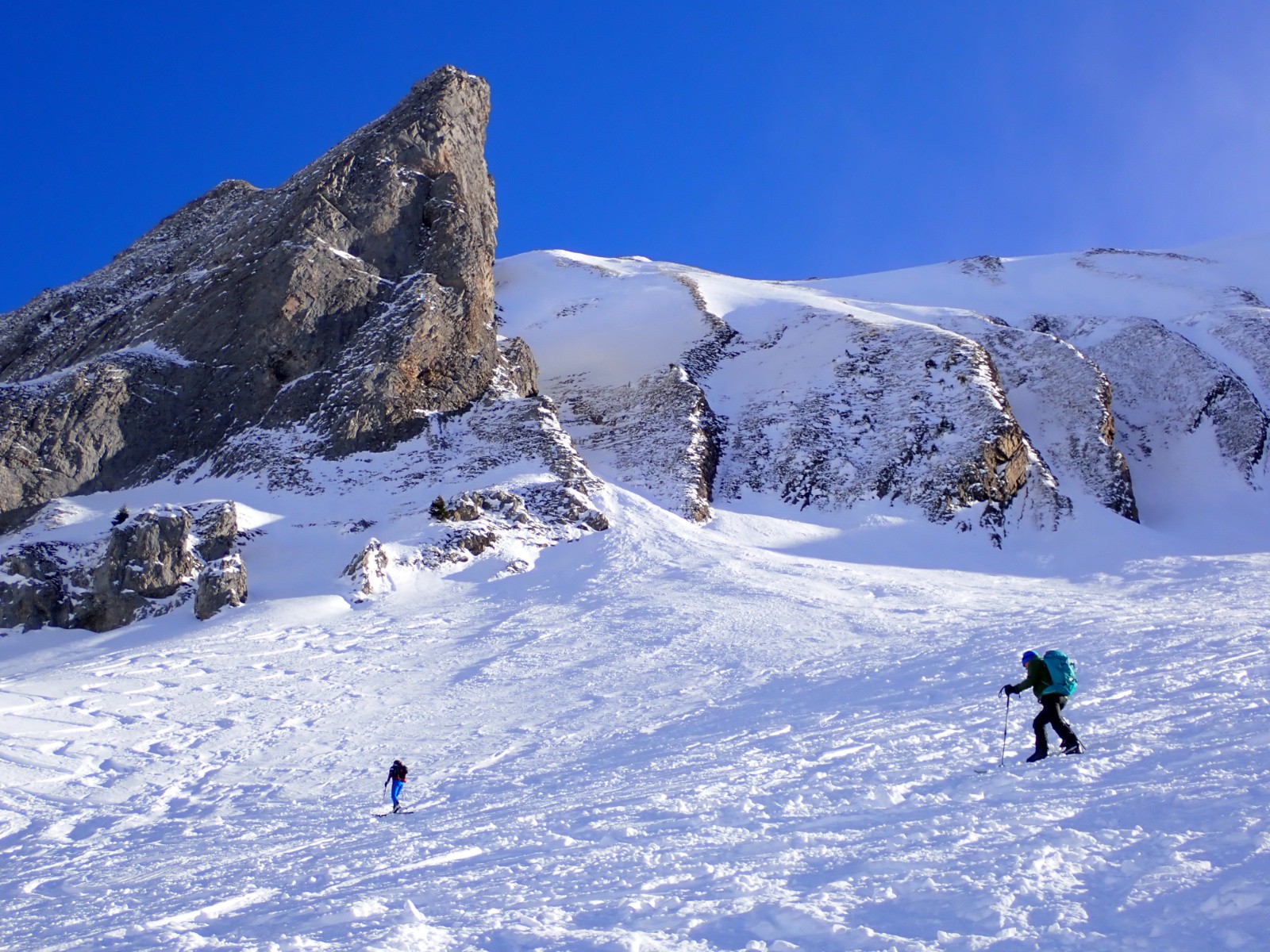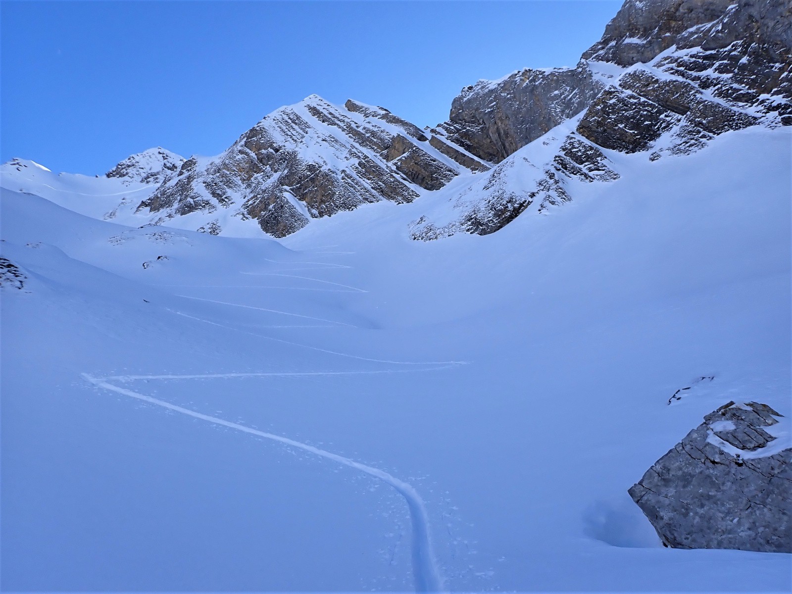 Au centre de la combe, bonne poudre franche en skiant les zones de neige à surface lisse.