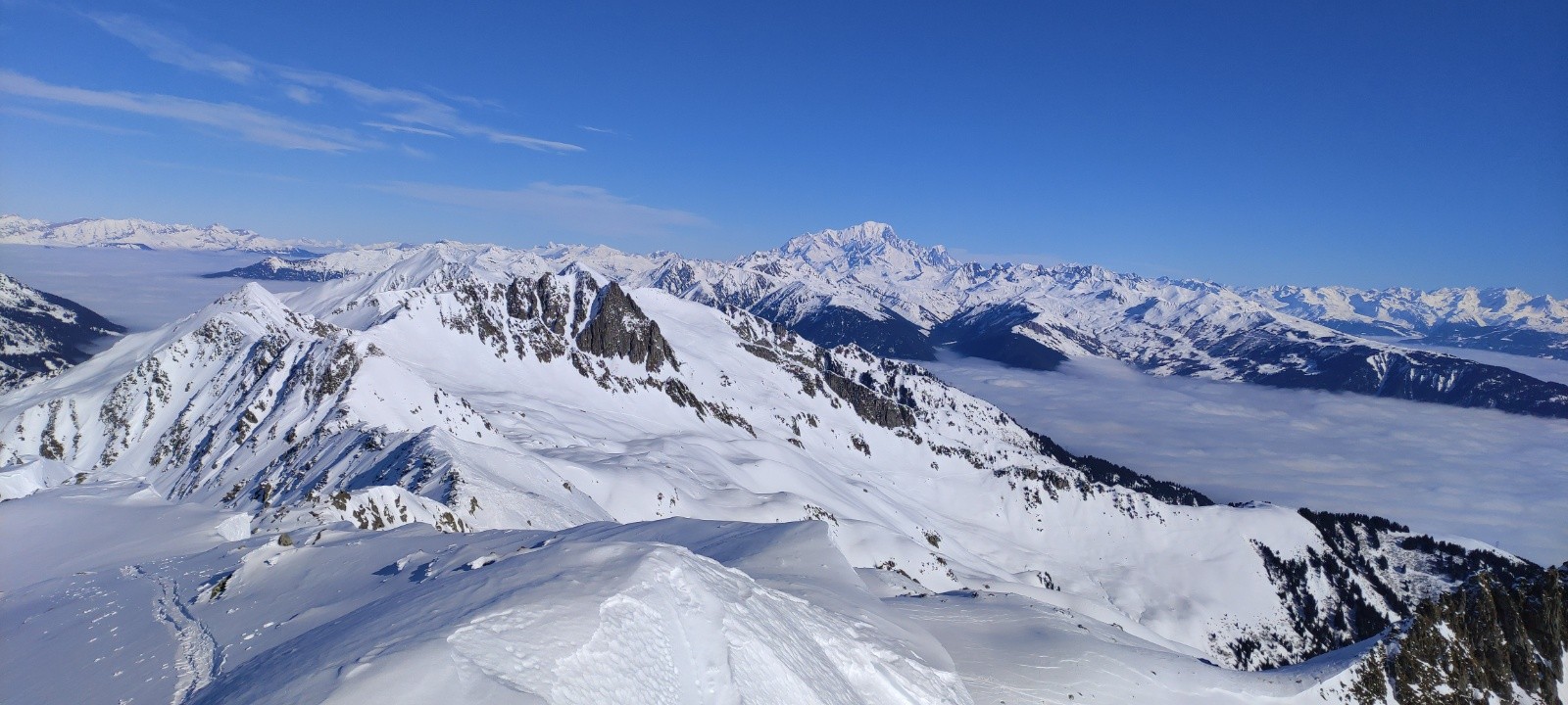 Itinéraire suivi : Montée combe de Bridan, crête à ski couteaux nécessaires, descente couloir Est frette en bonne conditions légère mi poudre sur neige assez dure, redescente comble de Bridan bien trafollée mais encore quelques passages en poudre, casse croute au soleil vers 2000m puis grosse chute de température vers 13h30 , retour glacière en rentrant dans la mer de nuages (~1800m) pour retour parking