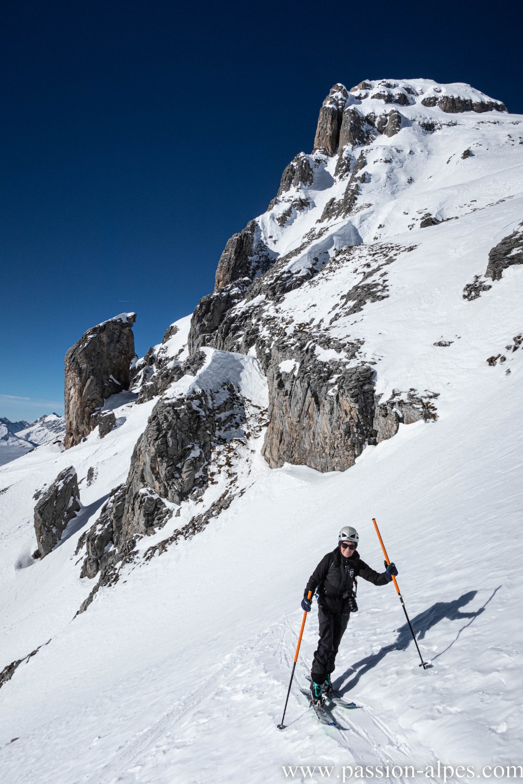 Nous aurions du basculer dans la sauvage "combe d'en Bovie", avec la promesse d'une superbe ambiance et la conclusion par un rappel aérien de 60m. Mais devant le nombre de "signaux faibles" (neige, fatigue, horaire, chaleur, engagement de l'itinéraire, stress) il a bien fallu se rendre à l'évidence : aujourd'hui, on signe le but. Et on en est très satisfaits ! Même s'il faut se coltiner une descente vraiment infâme