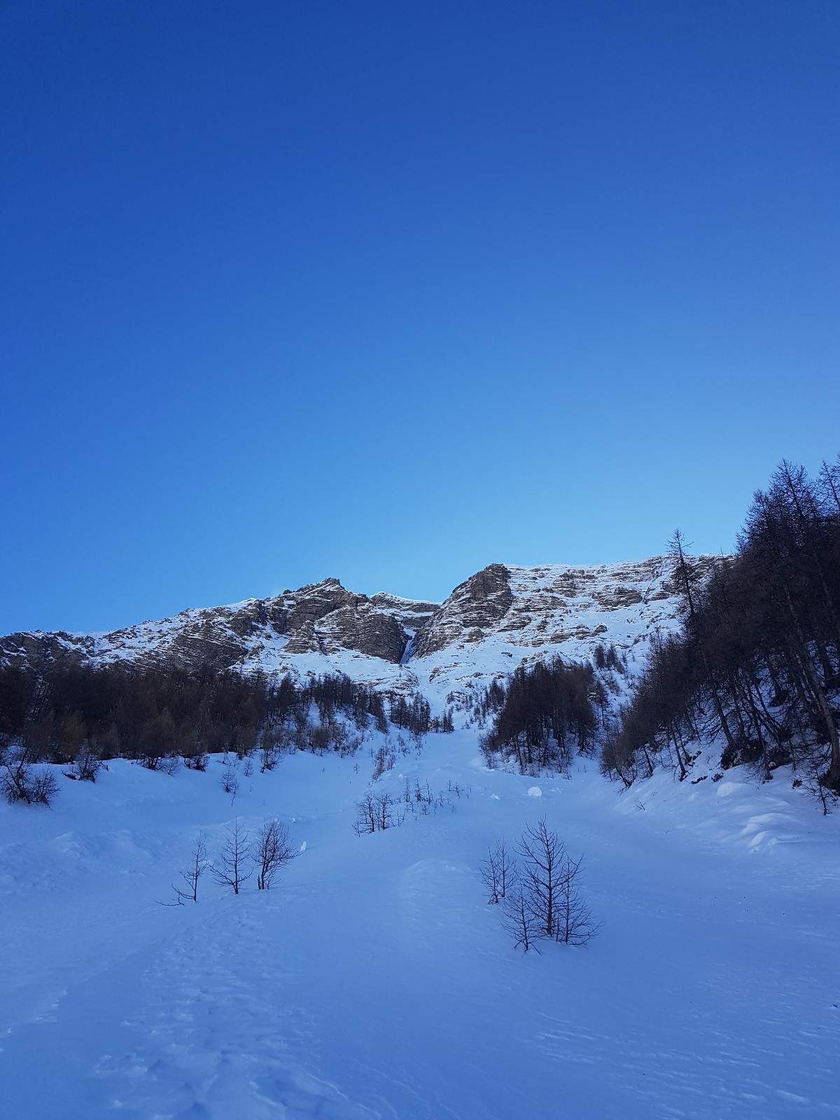 deux étroitures bien moins large que mes ski (1.70m): la premières avec une strate de rocher dans le dernier tiers de la pente suspendu W puis dans le petit couloir de sortie sur l’arête du garabrut ( ce petit couloir étroit est celui qui sort sur l’arête dans l'axe de la pente suspendu W, différent de la sortie d'O.Salésiani en 2017 (topo: C2C),il est très étroit. mes ski accrochés juste sur spatule et talon en étant bien arqués. j'ai passé ces deux étroitures en escalier (en tout peut être 10-12 mètre d'escalier). une autre marche-strate de rocher dans le dernier tiers du couloir-canyon, qui passe sans souci en skiant.gros brassage a pieds à la montée dans certaines section.quasi pas vu les traces de PierreC (sortie du 22.01), juste un peu dans les ravins, elles étaient bien mises en relief par le vent.