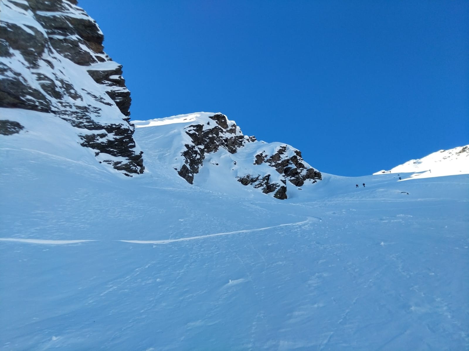 Du coup nous avons eu droit a 2 belles descentes en neige poudreuse et bien compact. Ça c'était pour le pain blanc. Dark side of the moon nous attendait, patiemment, sur l'autre flanc :1150 m de croutasse irréguliere et trafolé de la pire espèce.