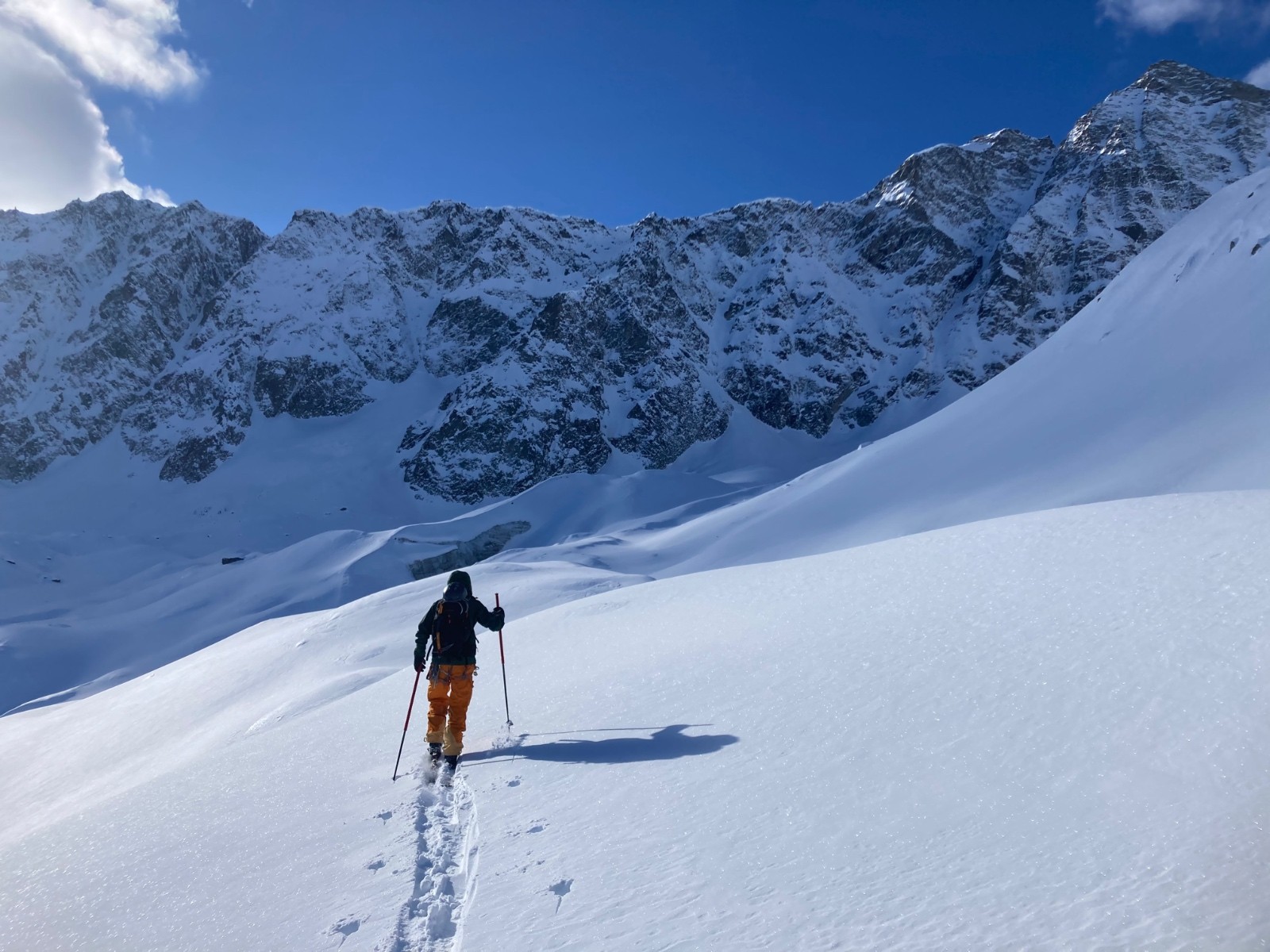 -12 au Casset, le froid s’intensifie avec la prise d’altitude. La traversée du désert (comprendre les moraines sans fin du Lac d’Arsine) plante le décor: ce sera un froid polaire jusqu’à la retraite, à tracer dans 20 à 40cm de poudre tout en subissant un courant de Nord peu intense mais continu, nous laissant aucune de chance de succès…