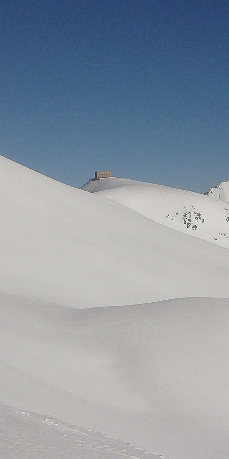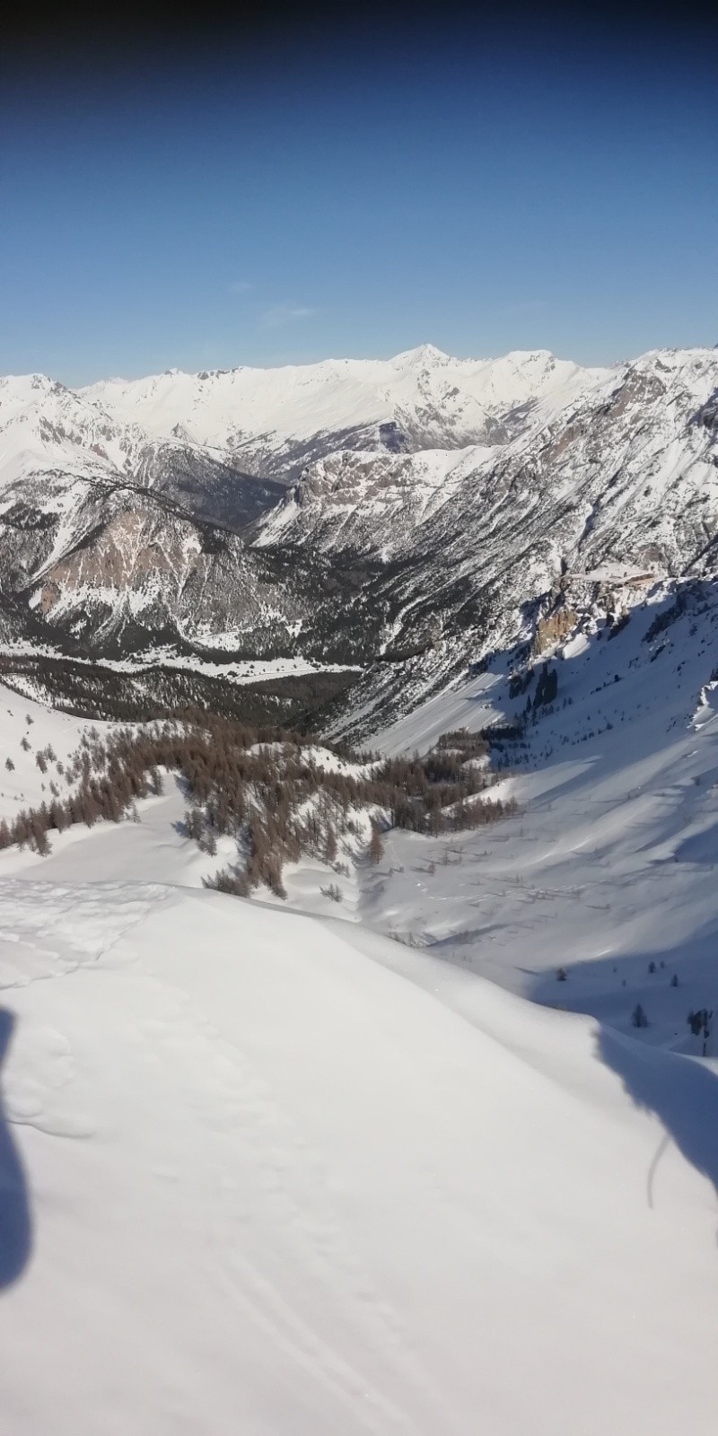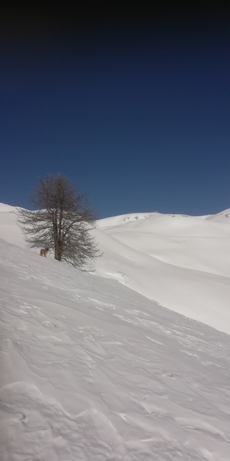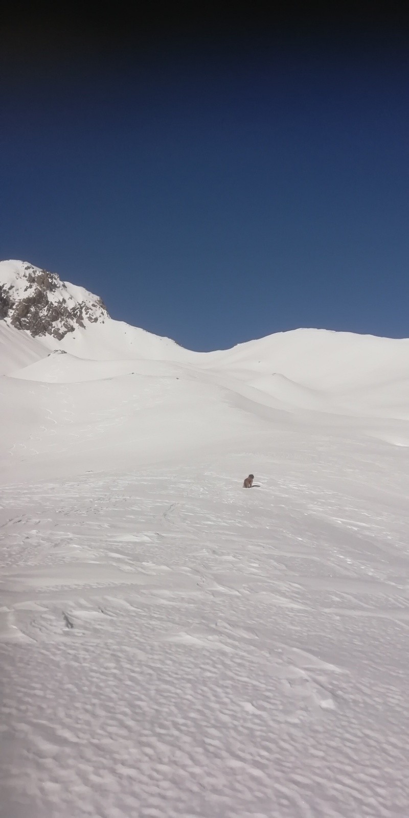 Très bonnes conditions : poudre légère à lourde en cours de transformation (les croupes sont un peu glacées sous l'effet du vent).
