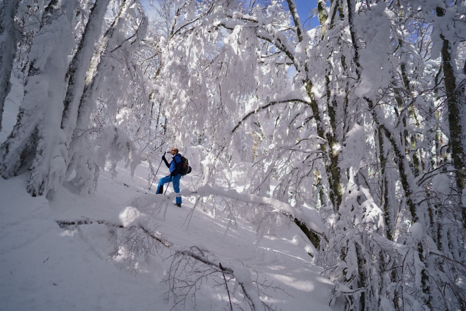 Après le ski entre les pins laricio et bouleaux de la veille avec une ambiance canadienne dans une poudreuse sans fond et une forêt dégorgeant de fraîche, on garde la peuf (toutefois en moindre quantité) mais retrouve le soleil ce jour au-dessus du col de Vizzavona, encore du grand ski mais également une très belle ambiance sur les rochers plâtrés de la crête sommitale. Avec le redoux marqué de l'après-midi, fini le ski de poudreuse en forêt de basse altitude, et il faudra jouer plus finement les prochains jours !