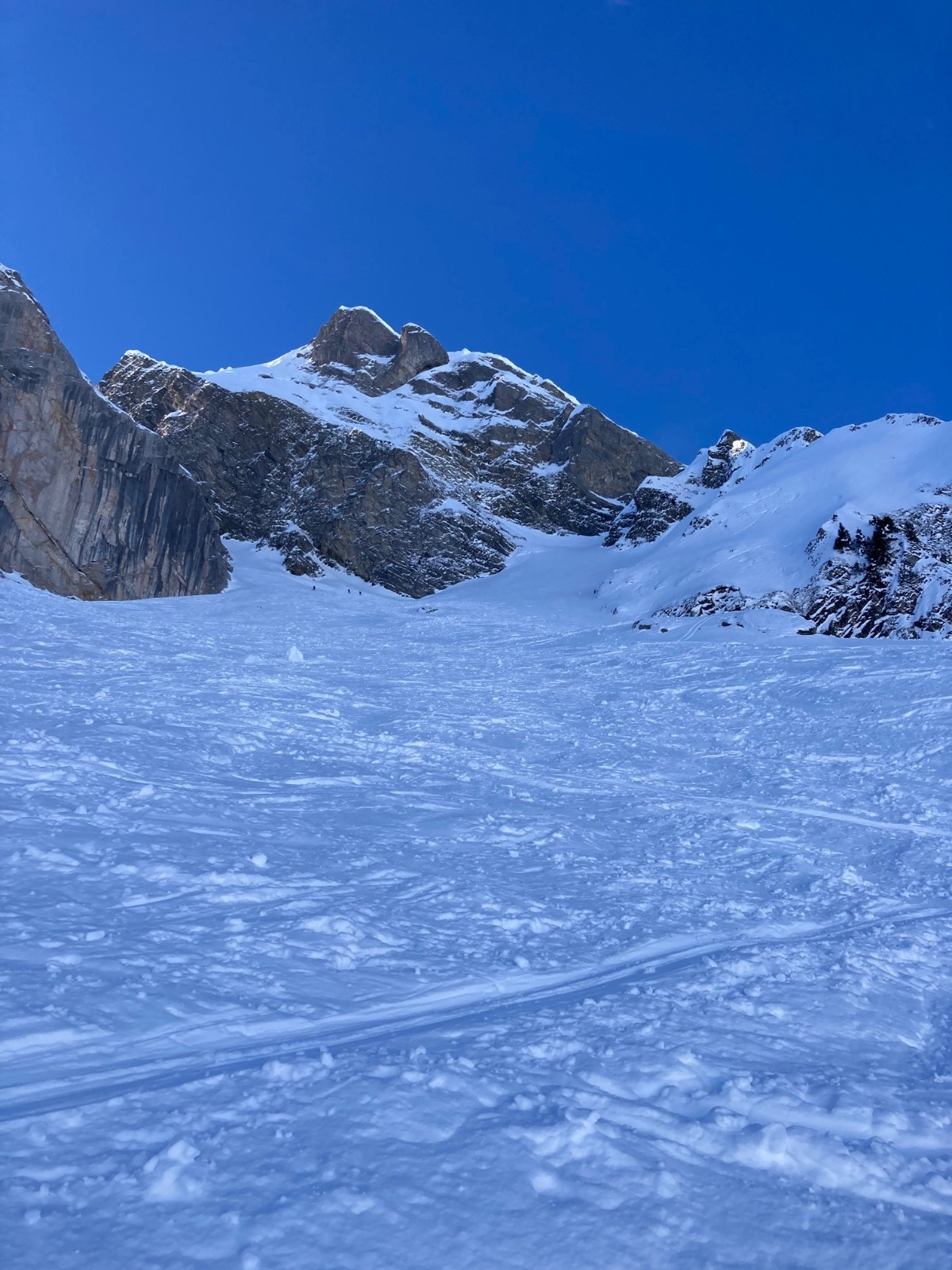 Conditions pour le ski : correcte. En haut, soit dans le dur, soit dans le trafollé. A mi-chemin dans la combe, éviter de rester trop longtemps rive droite sous les pentes raides qui avaient l’air assez plaquées. Après la traversée vers rive gauche,