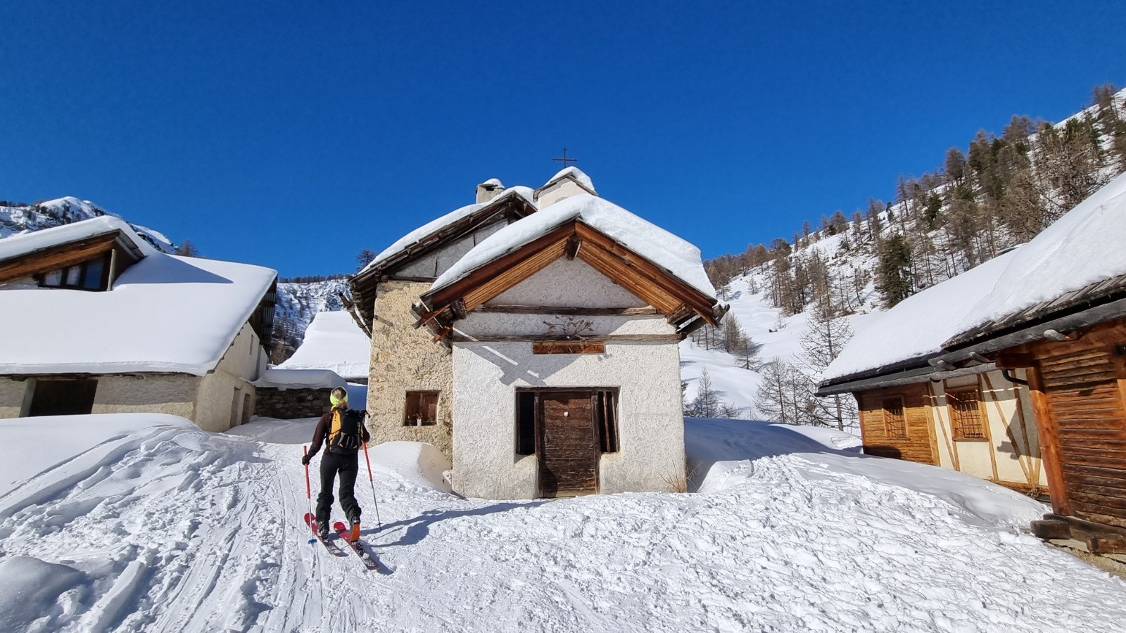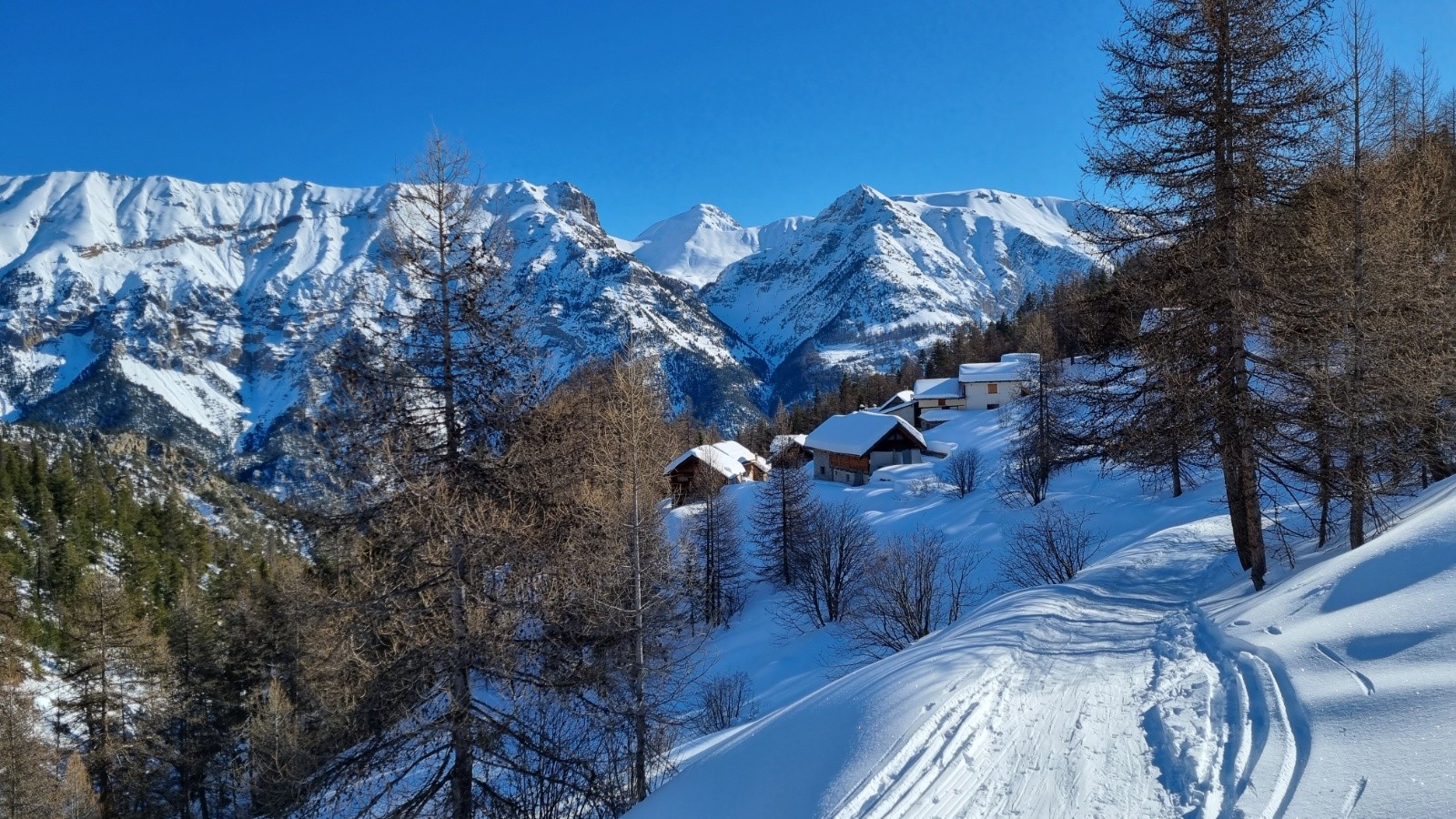 Itinéraire suivi :la vallée de la Clarée est bien blanche, on chausse à la voiture, pour remonter d'abord la piste menant aux beaux villages de La Caro et de Granon. Les maisons ont pris leur quartier d'hiver, les toits sont chargés de neige, tout est calme comme endormi. On continue le long du torrent des Cibieres, traversant de belles forêts de mélèzes qui au final s'écartent, et laissent la place aux alpages sous le col du Granon. La distance commence à peser et la halte au col est la bienvenue. Puis courte montée (moins de 110 mètres) pour atteindre le Grand Meyret. Descente sans aucune trace en face Nord Est pour rejoindre le village de Granon. Presque incroyable d'être seuls avec de telles conditions...mais où sont donc passés les skitouriens ?!