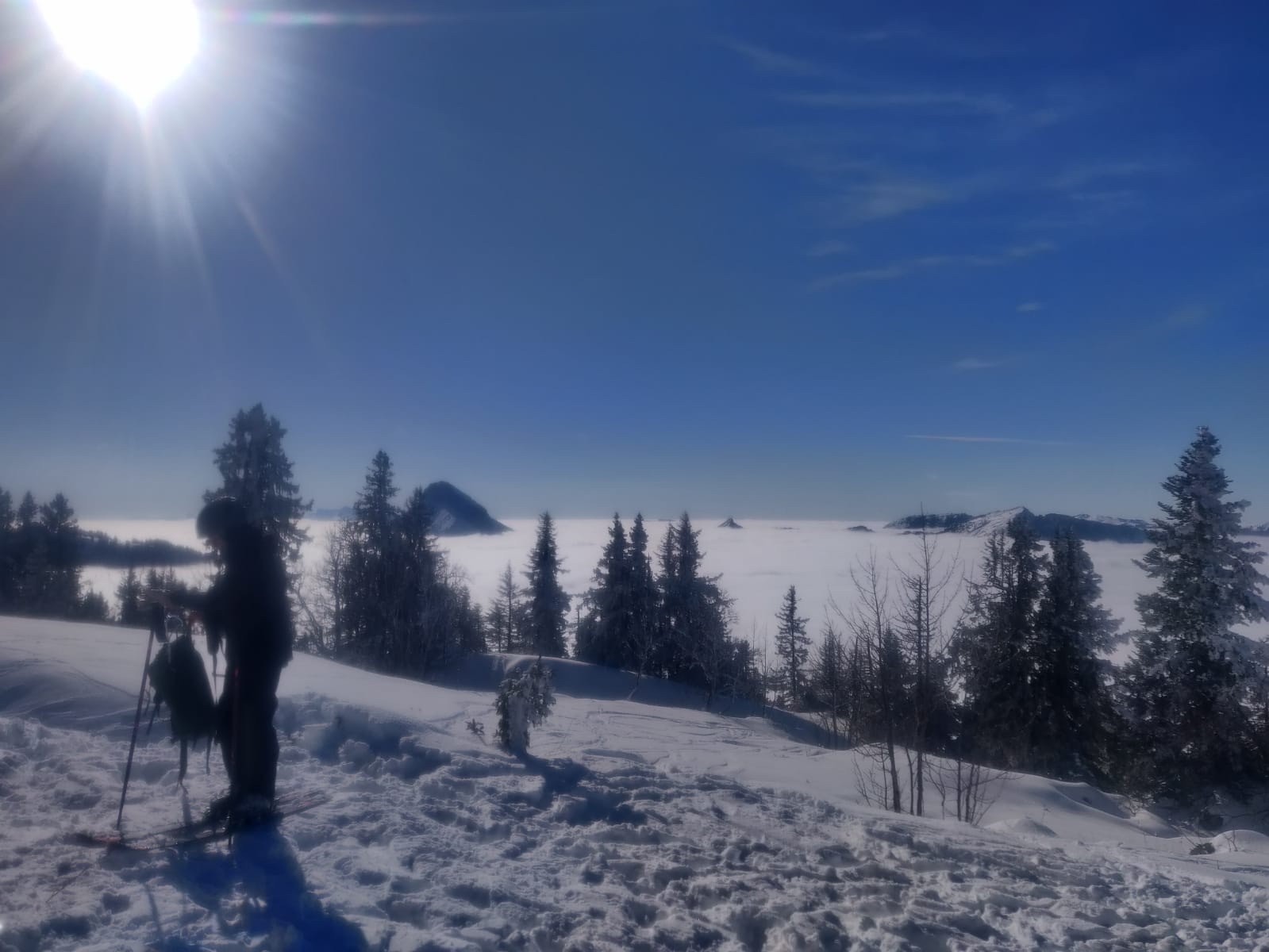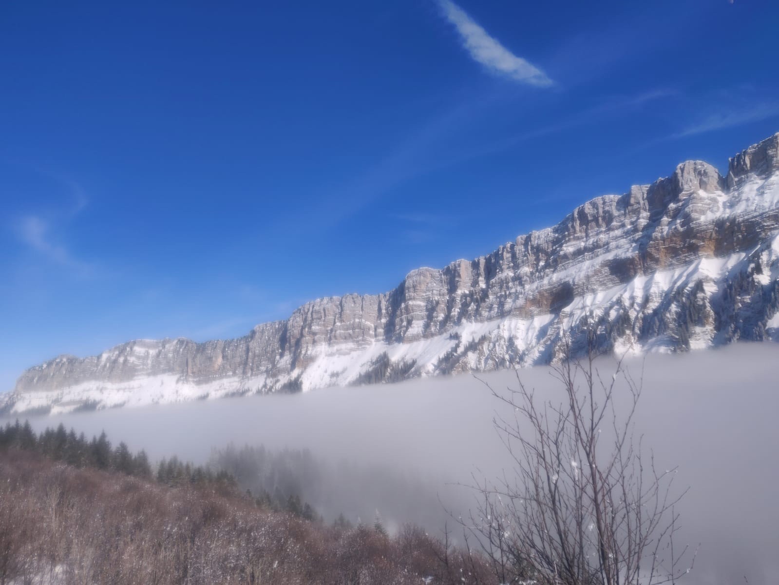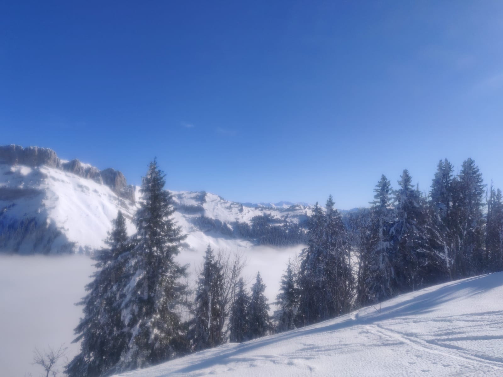 Départ depuis Perquelin vers 10h ce matin. Il fait froid et le brouillard nous feutre l'ambiance de départ. La montée commence tranquillement, les randonneurs qui ont eu la même idée avant nous sont nombreux et la neige est plus que tassée, damée. Nous suivons le l'itinéraire de la carte IGN jusqu'à atteindre une clairière au-dessus du Habert de la Saulce (visible sur la carte). Toujours dans le brouillard on ne voit ni la Scia (qui est plein ouest) ni les Lances de Malissard qui sont en face. Bifurcation donc plein ouest supposant que la Scia est derrière, un passage en forêt de plus en plus raide nous attend. Beaucoup de neige à ce moment, avancée difficile mais ambiance silencieuse et cotonneuse comme on les aime. Notre journée sera faite à ce moment puisque nous sortons de la forêt et du brouillard en même temps. Tournez la tête et vous verrez les Lances de Malissard se dresser devant vous, le tout avec un ciel bleu et un soleil qui commence à manquer en bas. Encore une peu de chemin puis c'est le sommet et le casse croûte. Retour par le même itinéraire. Le début de la descente est très raide, avec beaucoup beaucoup de neige, on s'enfonce. Le passage en forêt se fera à pied pour ma part, je peine à tourner... Le reste est plus agréable bien qu'étroit. Bonne petite journée au soleil, bilan positif pour une première Scia :)