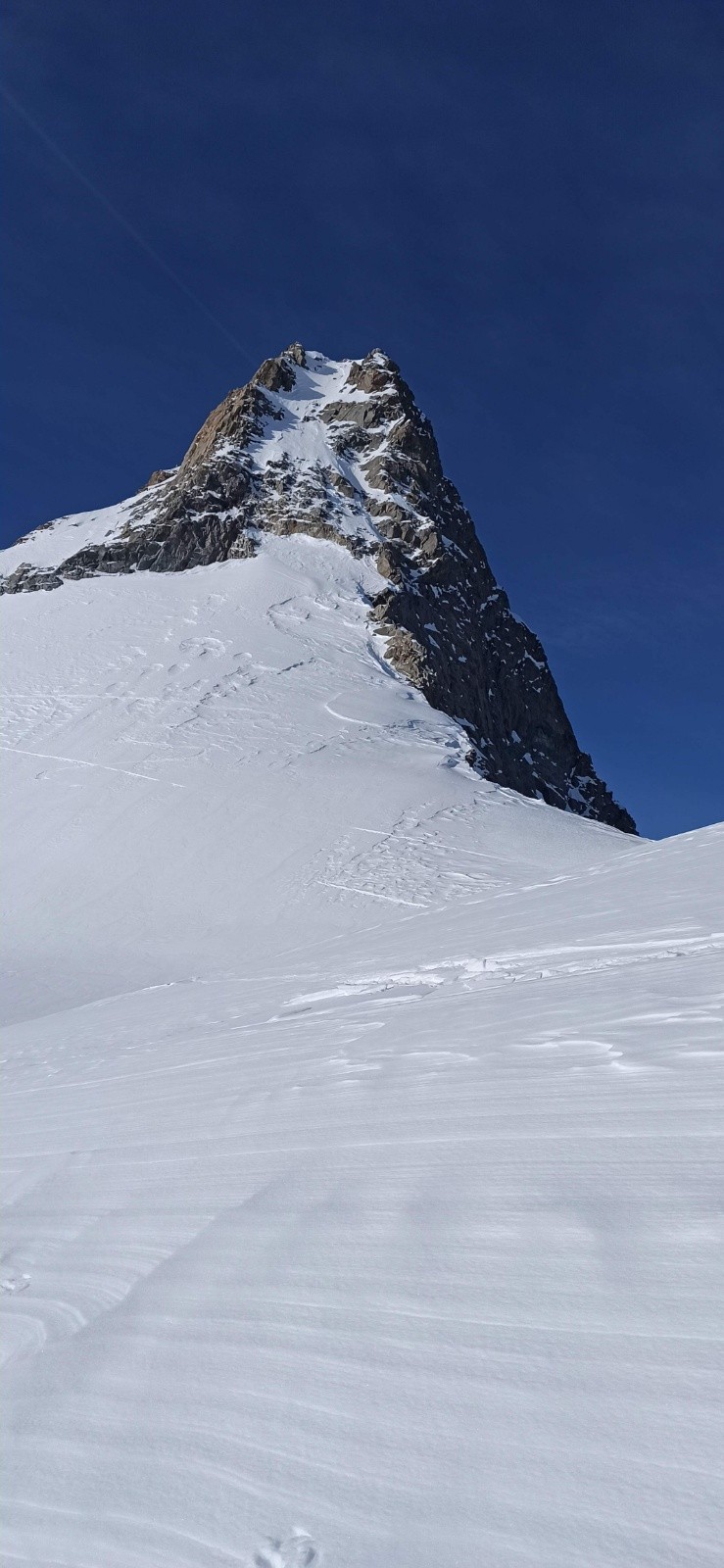 Conditions pour le ski :de tout, beaucoup de carton, plus ou moins épais, quelques zones de neige soufflées, et beaucoup de zones avec relief travaillées par le vent, poudreuse tassée dans la pente finale