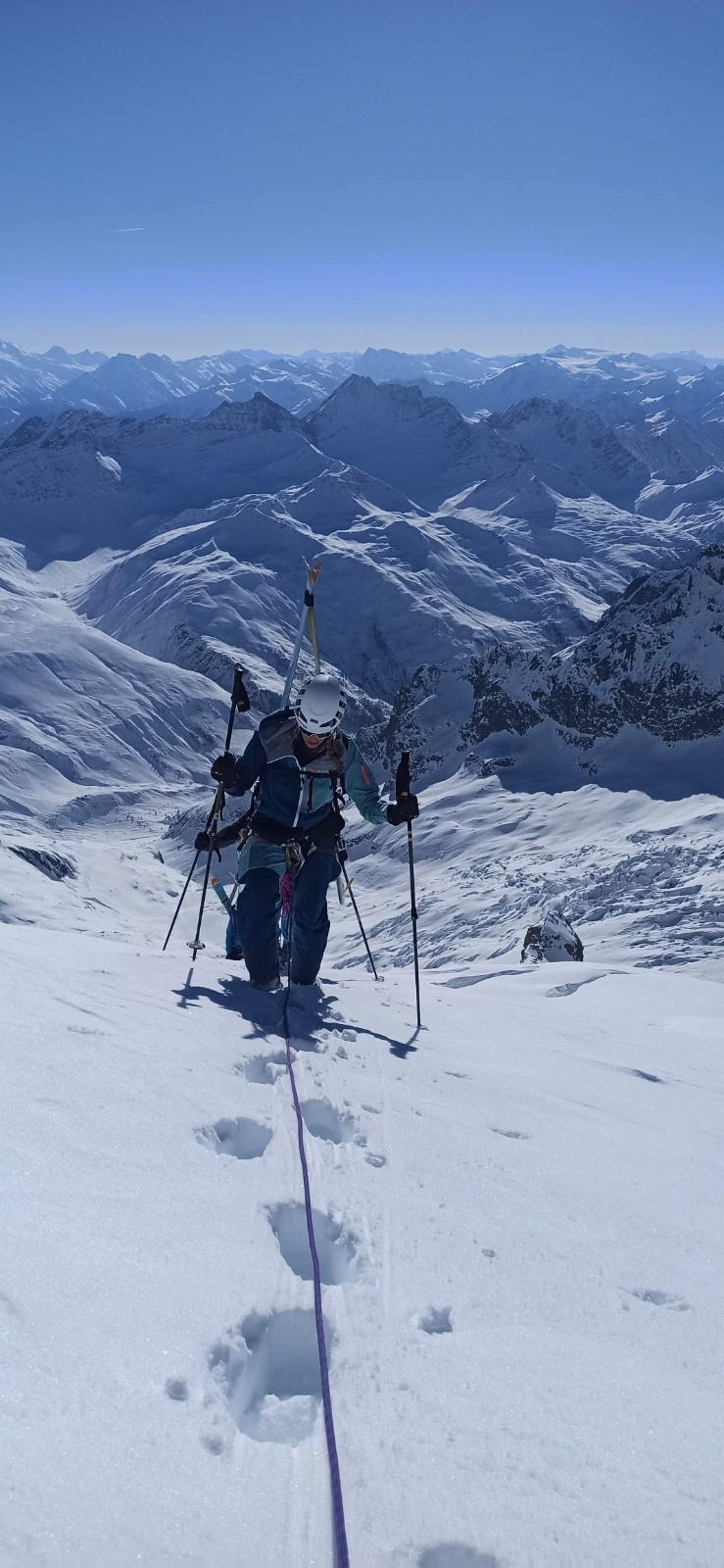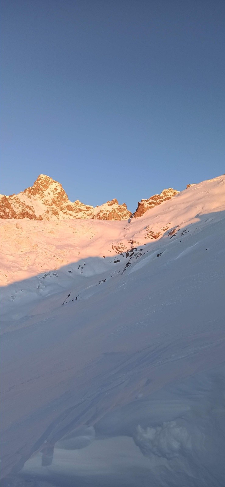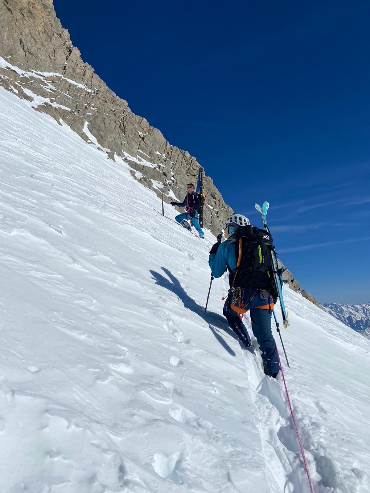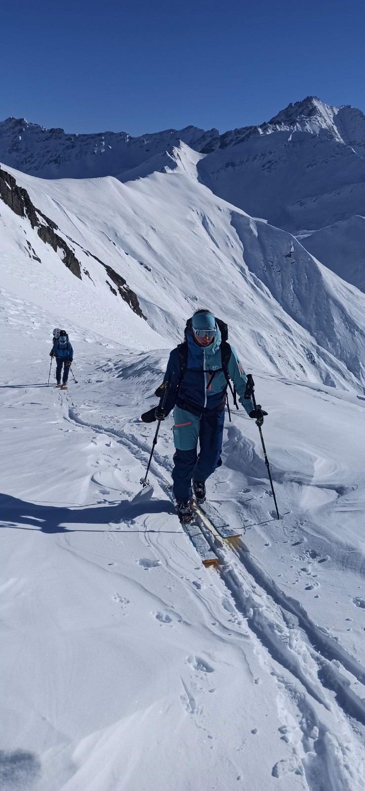 Départ tranquillement a 9h avec dans l'idee que dans 3h, allez 4h on est en haut ! C'était sans compter, la difficulté à tracer, que ce soit dans de la profonde croutee que dans du dur en traversée. Timing qui explose, nous sommes a 15h30 à 50m D+ de l'arrête sommitale a brasser pas possible. Les filles ne se sentent pas descendre à skis, l'expo leur fait peur, il faudra donc compter sur une descente longue également...Je décide, à la grande déception des filles, de stopper la, pas envie que ça tourne mal avec une descente a la frontale ! Arnaud poursuit seul, j'accompagne les filles dans les premiers 100 mètres de descente en désescalade, puis je décide de les laisser gérer seules leur descente, je chausse les skis .