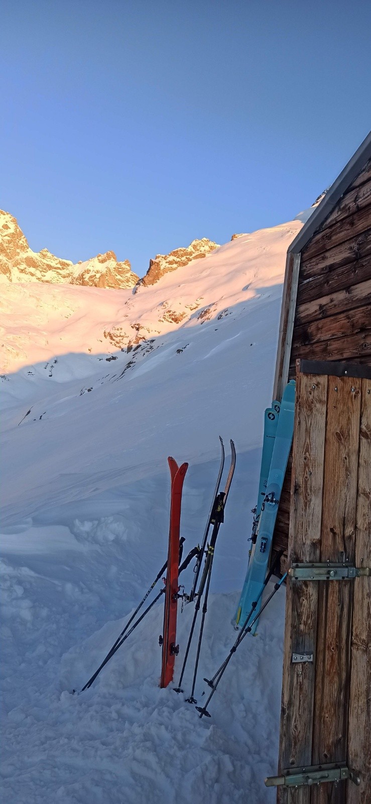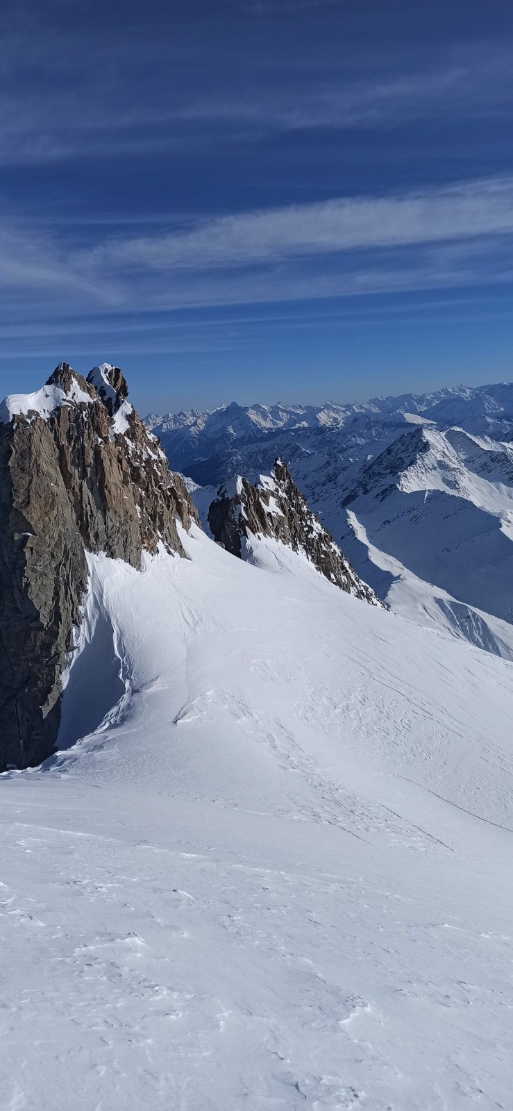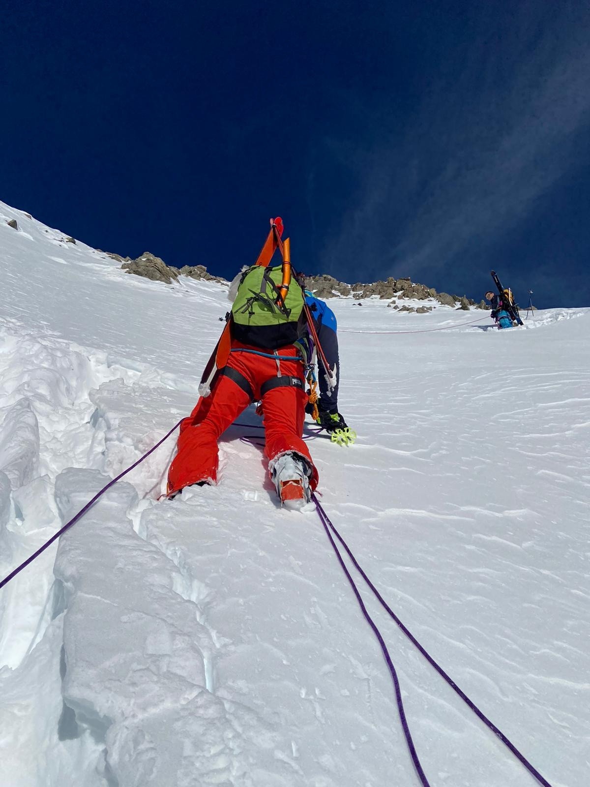 Départ tranquillement a 9h avec dans l'idee que dans 3h, allez 4h on est en haut ! C'était sans compter, la difficulté à tracer, que ce soit dans de la profonde croutee que dans du dur en traversée. Timing qui explose, nous sommes a 15h30 à 50m D+ de l'arrête sommitale a brasser pas possible. Les filles ne se sentent pas descendre à skis, l'expo leur fait peur, il faudra donc compter sur une descente longue également...Je décide, à la grande déception des filles, de stopper la, pas envie que ça tourne mal avec une descente a la frontale ! Arnaud poursuit seul, j'accompagne les filles dans les premiers 100 mètres de descente en désescalade, puis je décide de les laisser gérer seules leur descente, je chausse les skis .