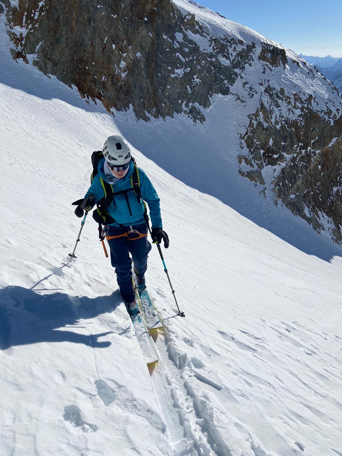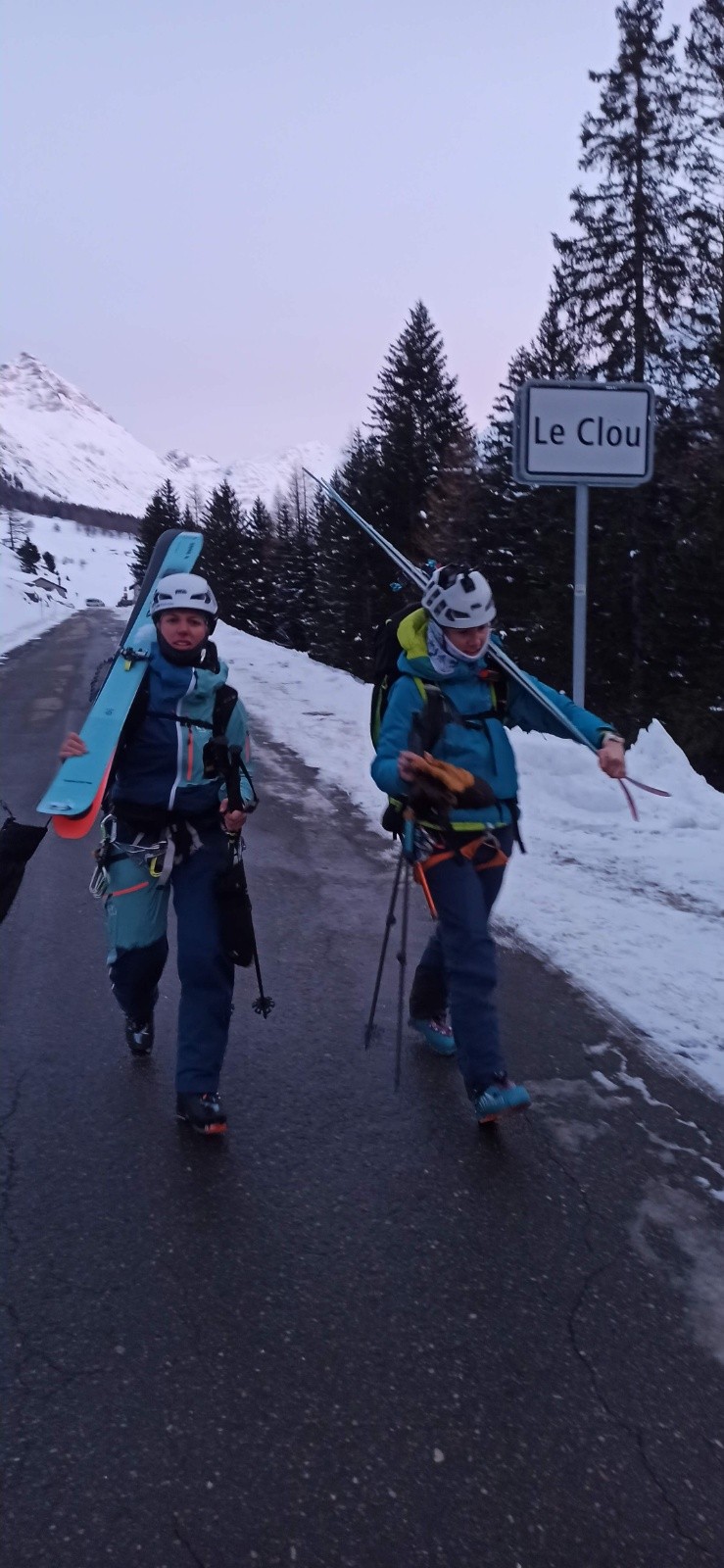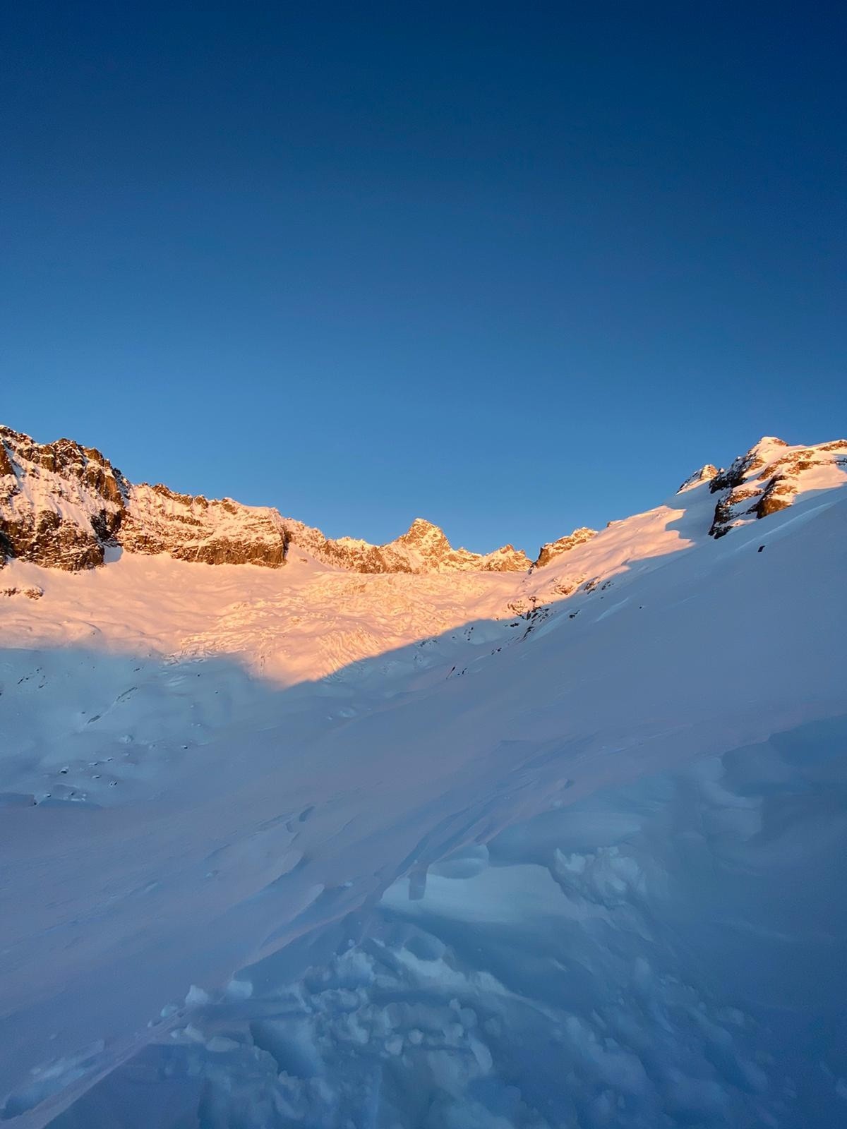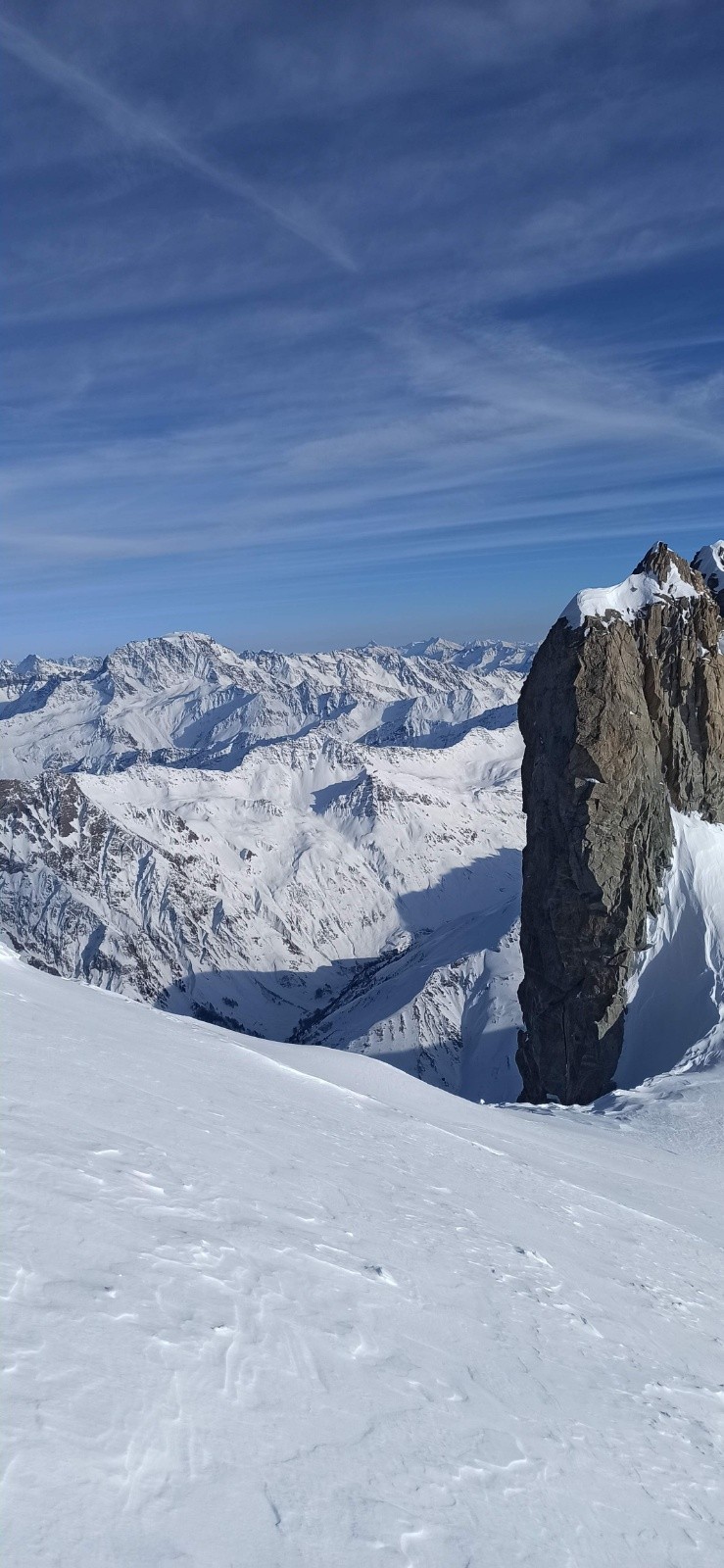 Départ tranquillement a 9h avec dans l'idee que dans 3h, allez 4h on est en haut ! C'était sans compter, la difficulté à tracer, que ce soit dans de la profonde croutee que dans du dur en traversée. Timing qui explose, nous sommes a 15h30 à 50m D+ de l'arrête sommitale a brasser pas possible. Les filles ne se sentent pas descendre à skis, l'expo leur fait peur, il faudra donc compter sur une descente longue également...Je décide, à la grande déception des filles, de stopper la, pas envie que ça tourne mal avec une descente a la frontale ! Arnaud poursuit seul, j'accompagne les filles dans les premiers 100 mètres de descente en désescalade, puis je décide de les laisser gérer seules leur descente, je chausse les skis .