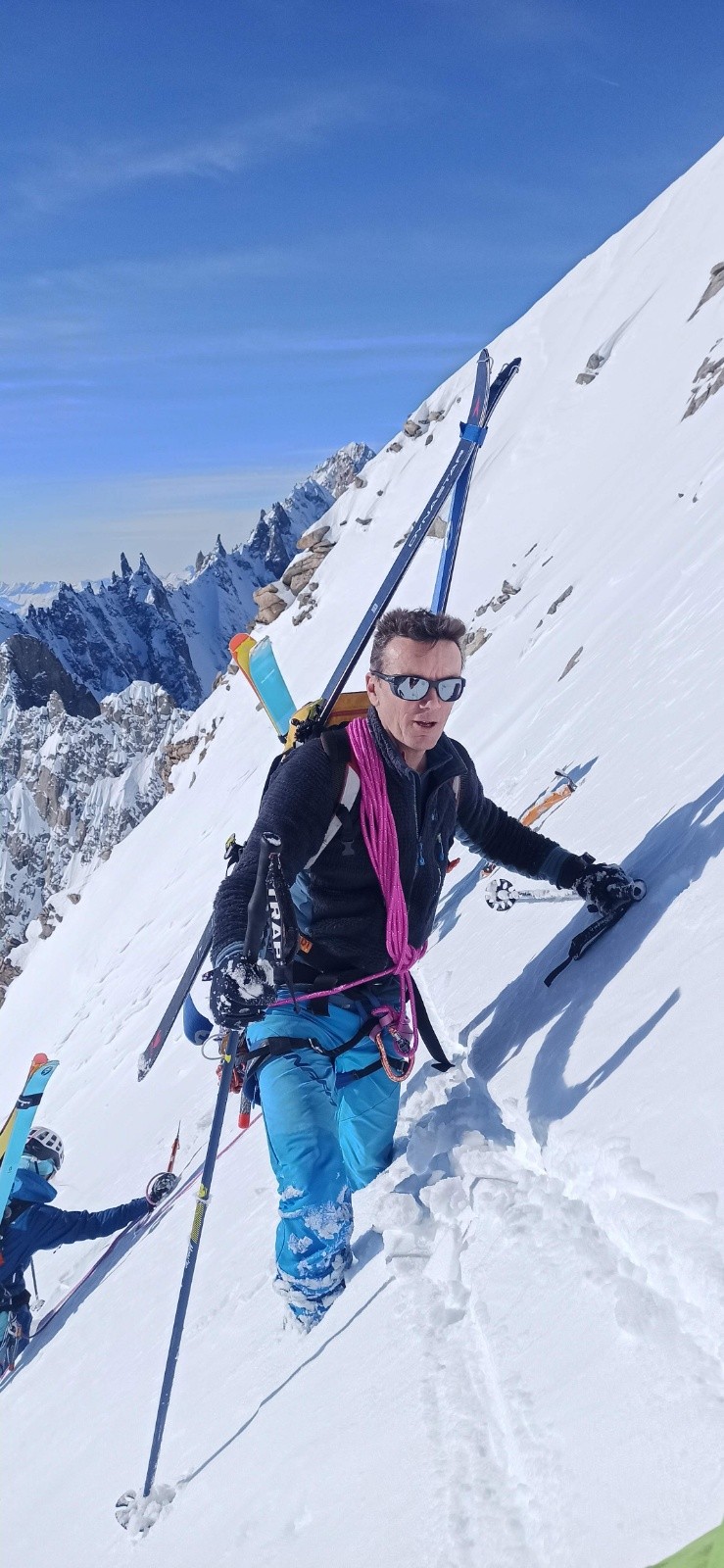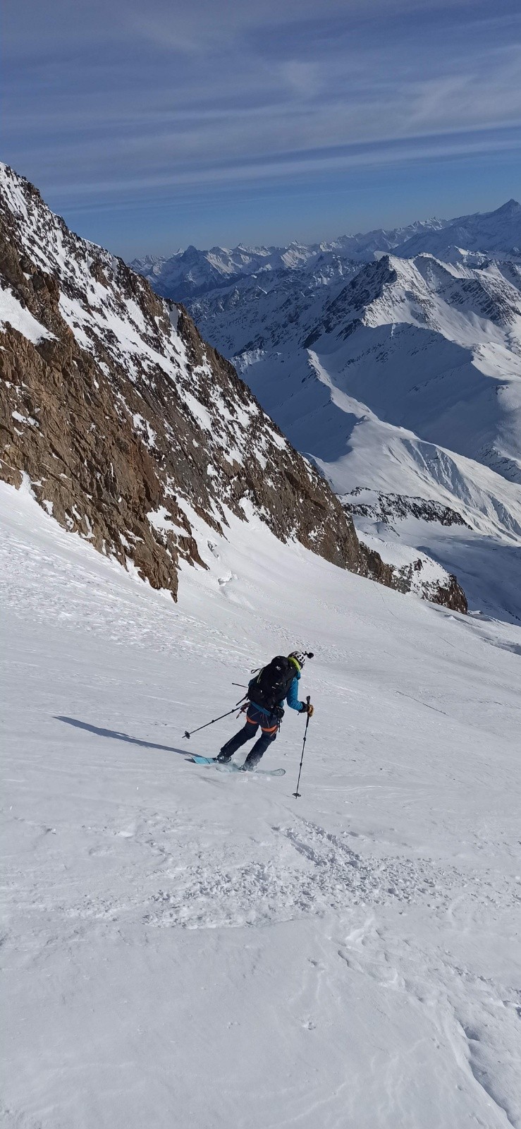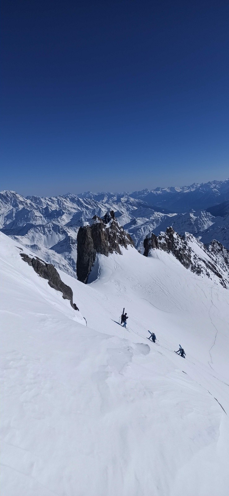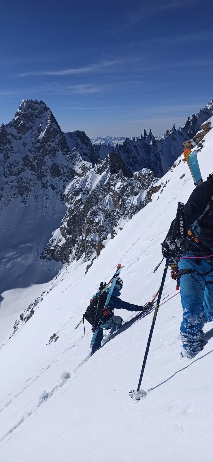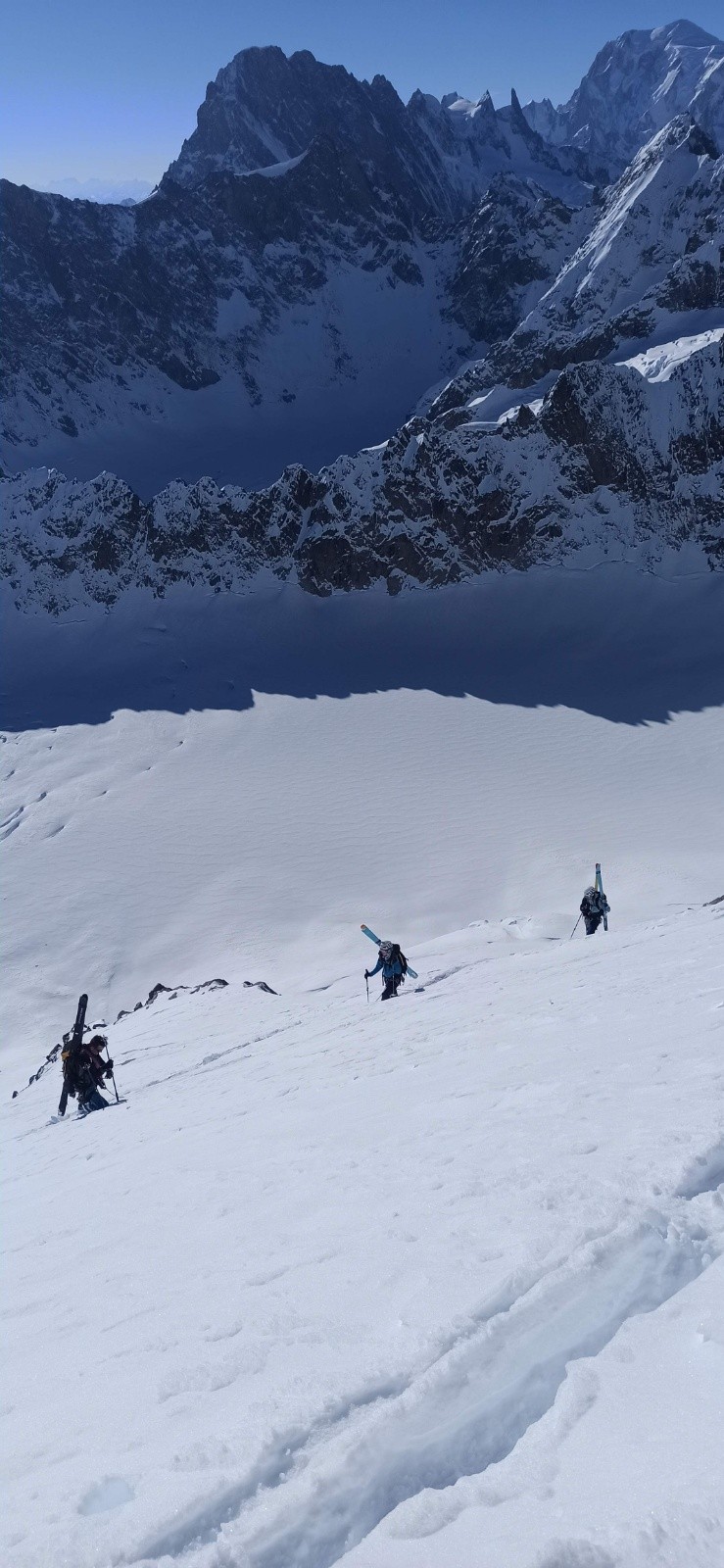 Descente rapide a skis dans une bonne neige dans la pente expo, j'attends tout le monde au col plus bas . Arnaud réapparaît a skis, après avoir fait le petit bisous à la vierge du Dolent .