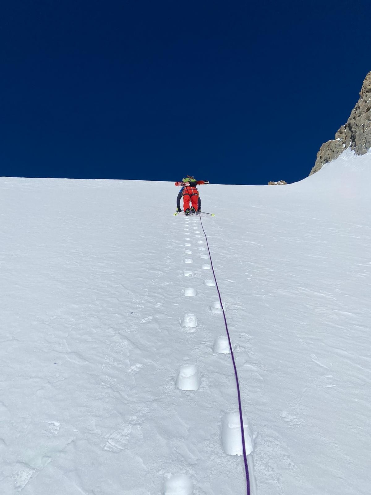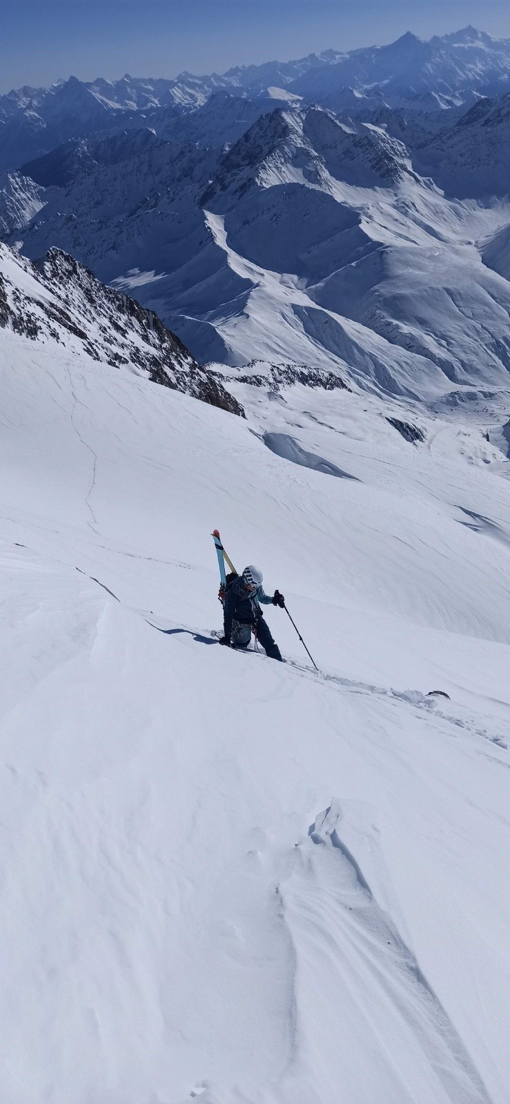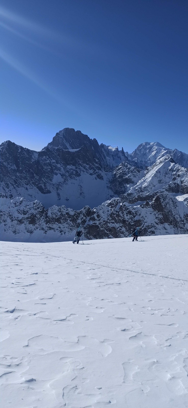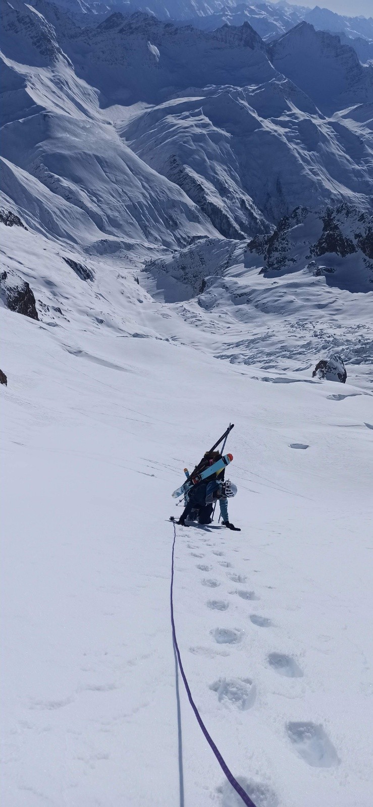 Descente rapide a skis dans une bonne neige dans la pente expo, j'attends tout le monde au col plus bas . Arnaud réapparaît a skis, après avoir fait le petit bisous à la vierge du Dolent .