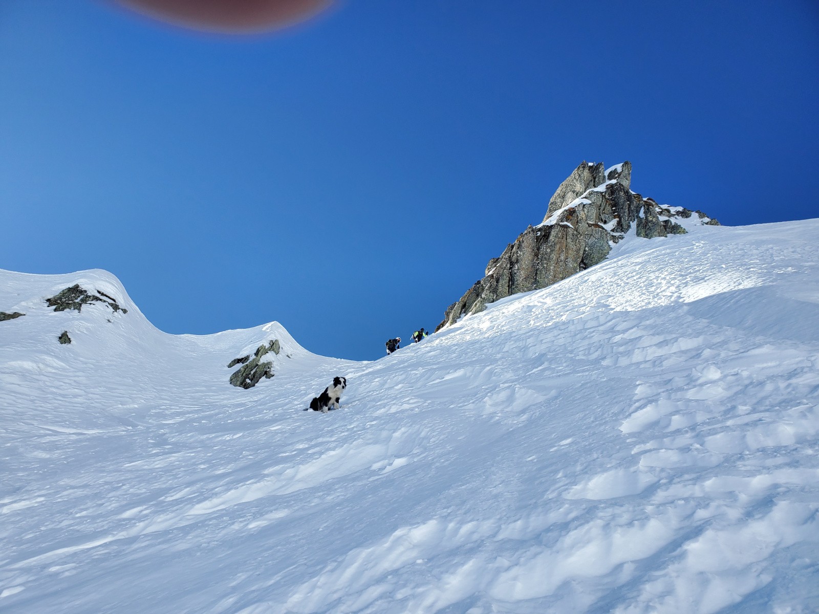 Conditions pour le ski : Poudre un peu soufflée dans le couloir, plus bas quelques orientations en neige de printemps, poudre à partir du col du Loup, fin presque damée