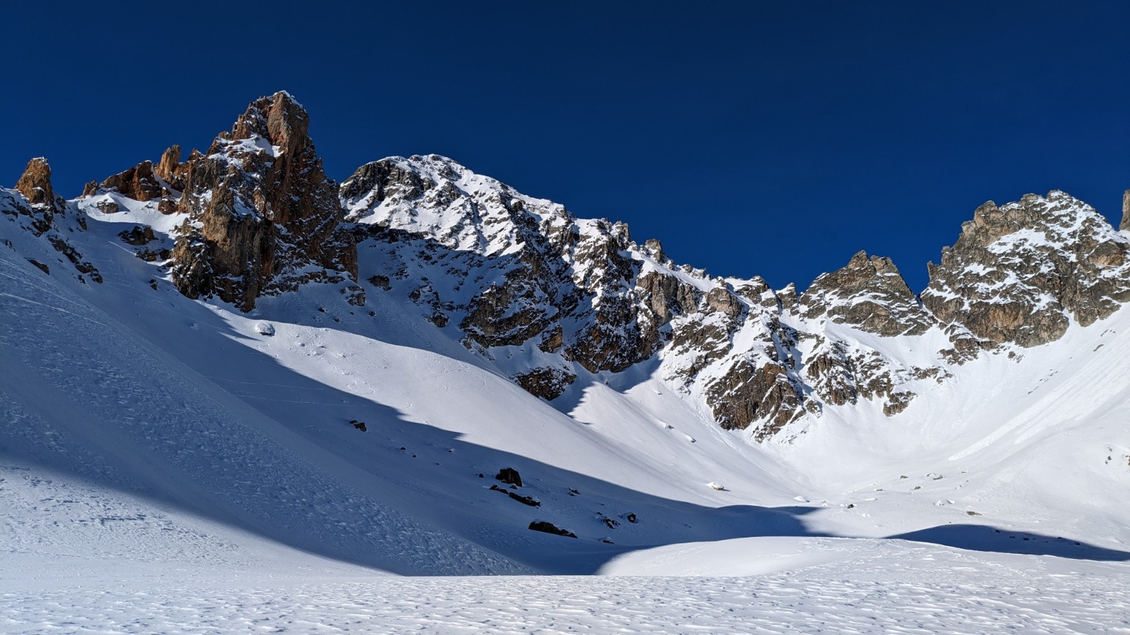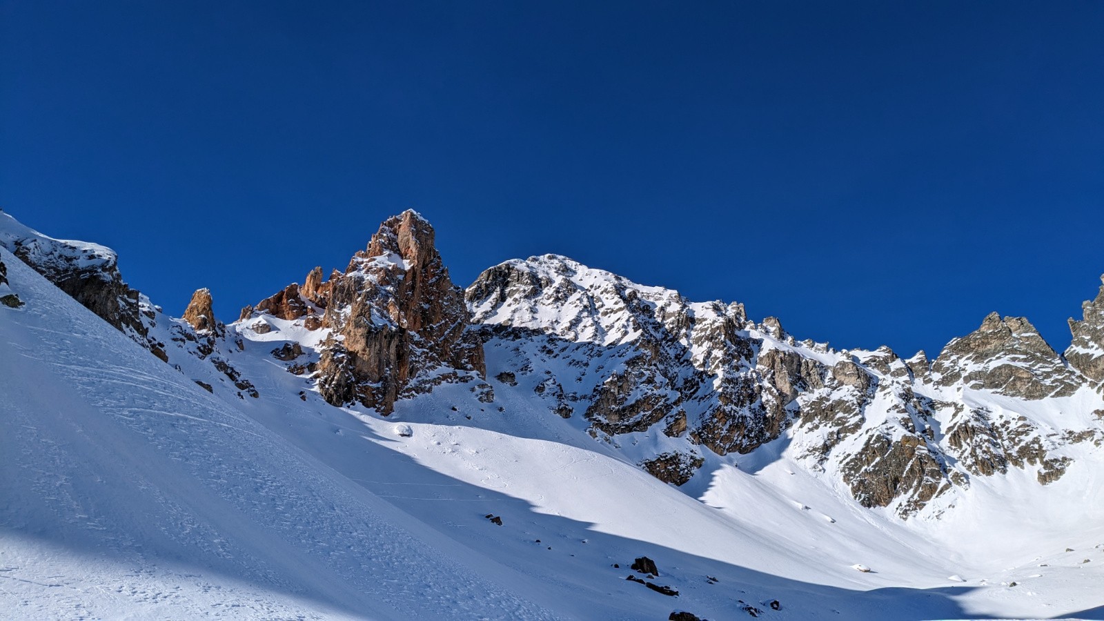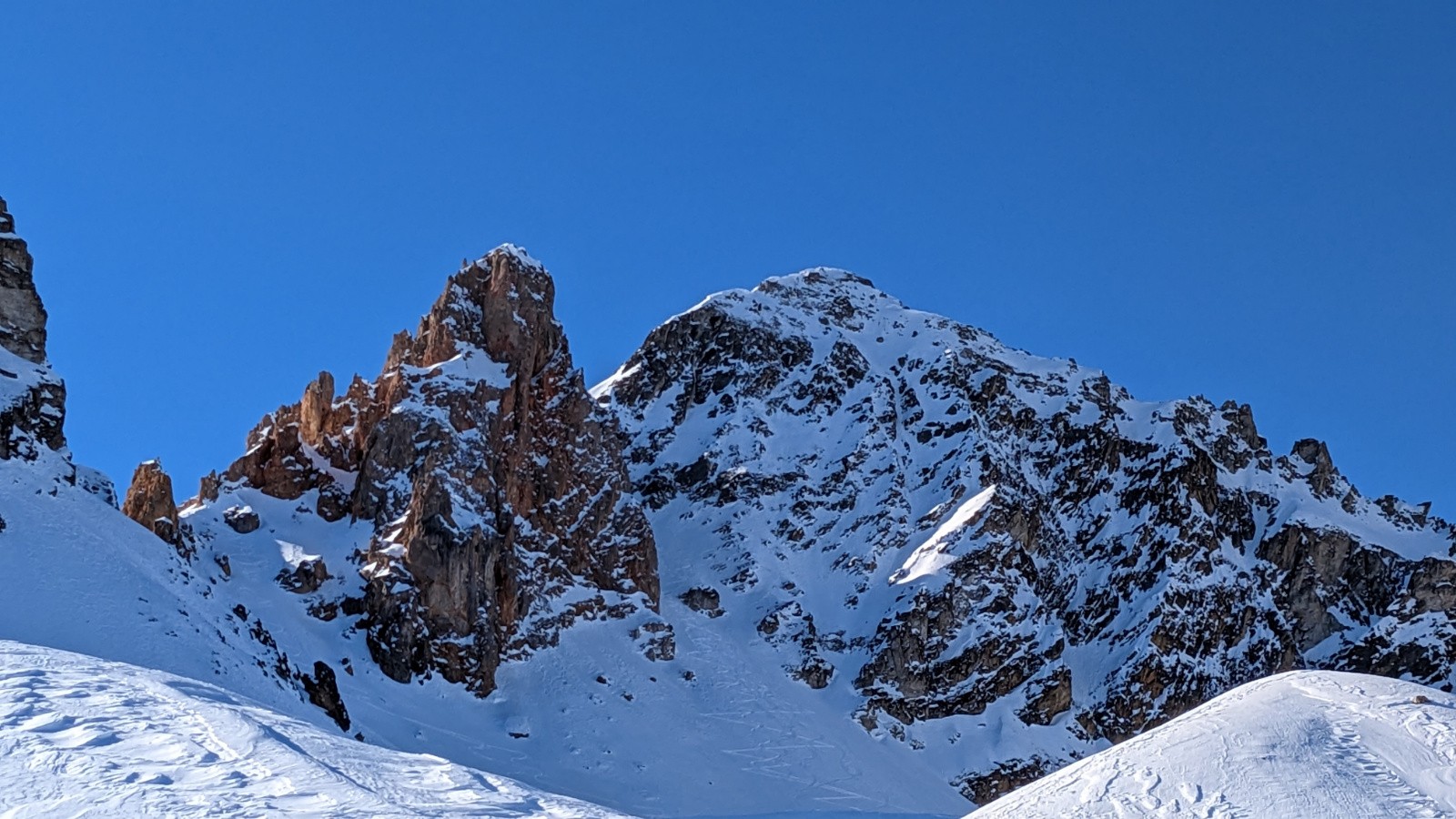 Conditions pour le ski : Y a pas beaucoup de neige et elle est globalement mauvaise. Carton en altitude, vielle poudre à l'ombre et dans les combes très abritées, ça chauffe en S, on y sera bientôt mieux en vélo qu'à ski....