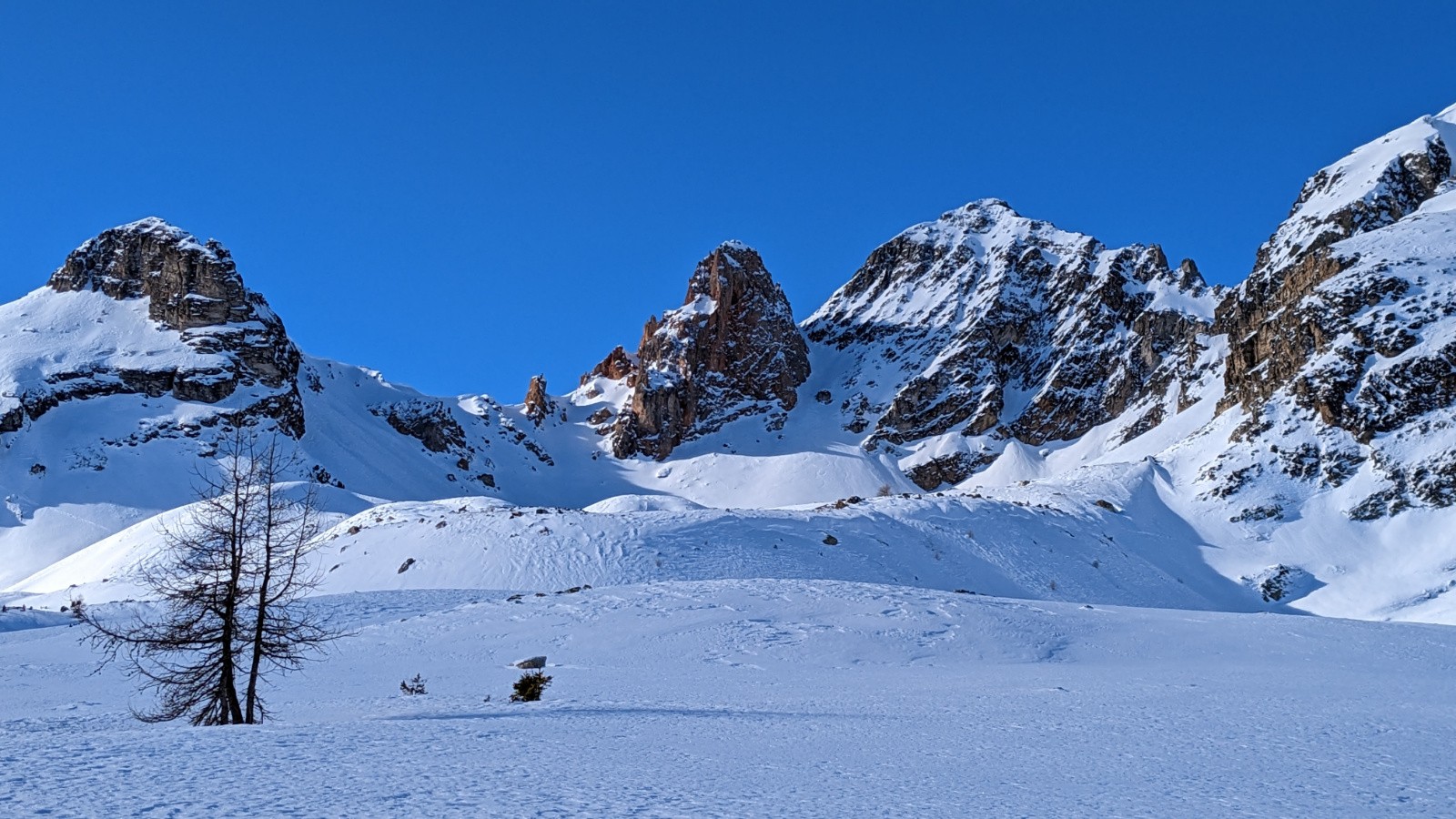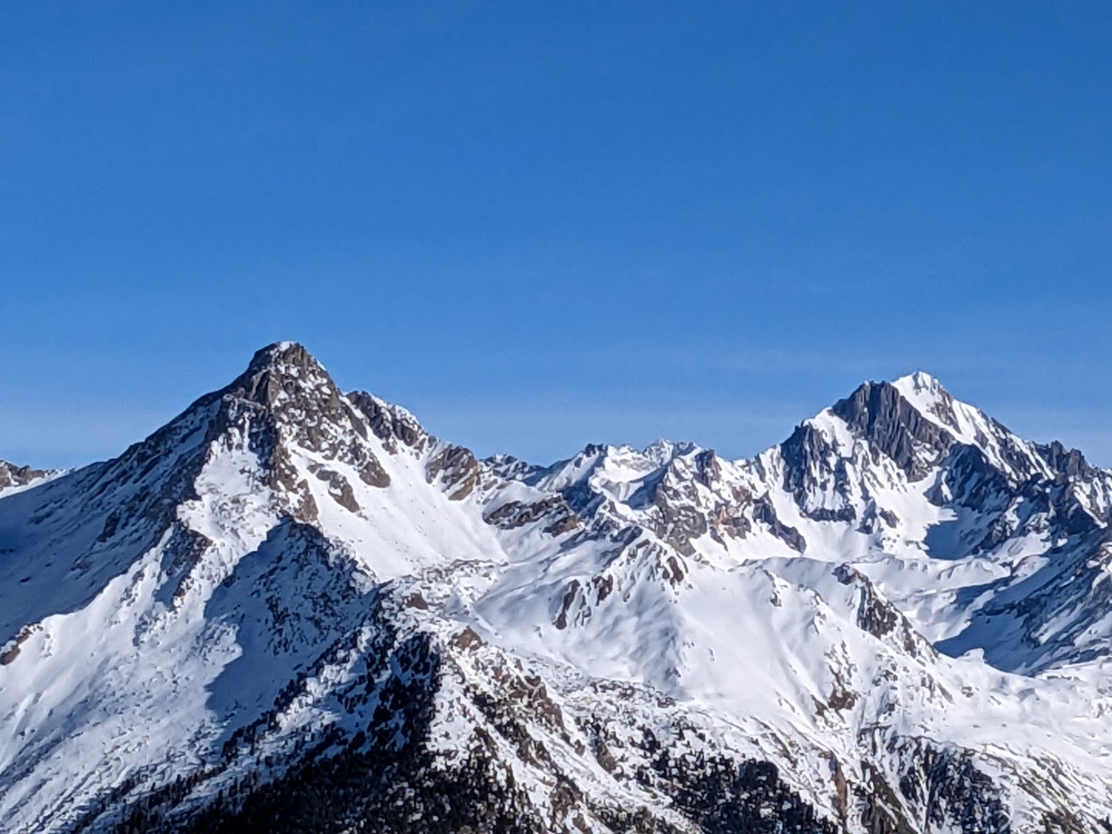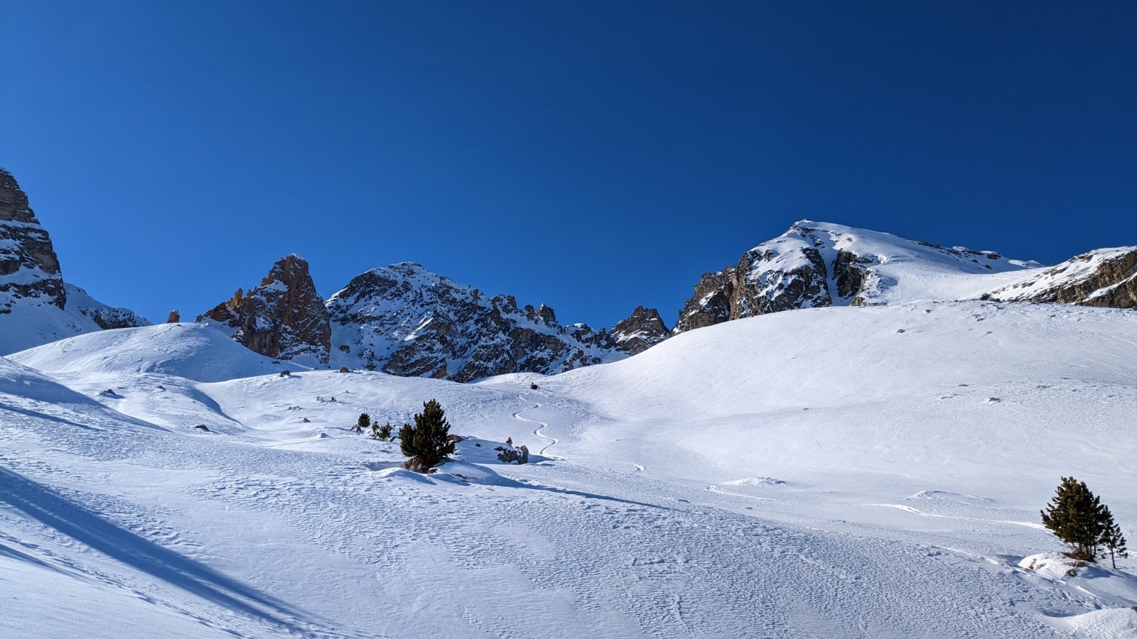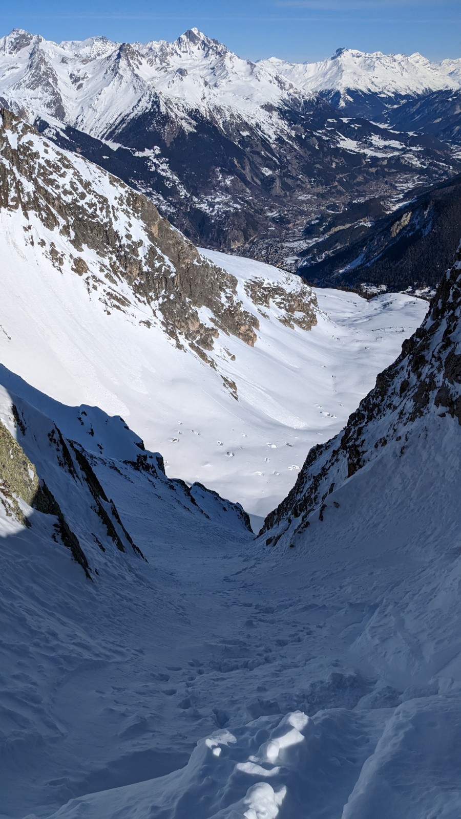Conditions pour le ski : Y a pas beaucoup de neige et elle est globalement mauvaise. Carton en altitude, vielle poudre à l'ombre et dans les combes très abritées, ça chauffe en S, on y sera bientôt mieux en vélo qu'à ski....
