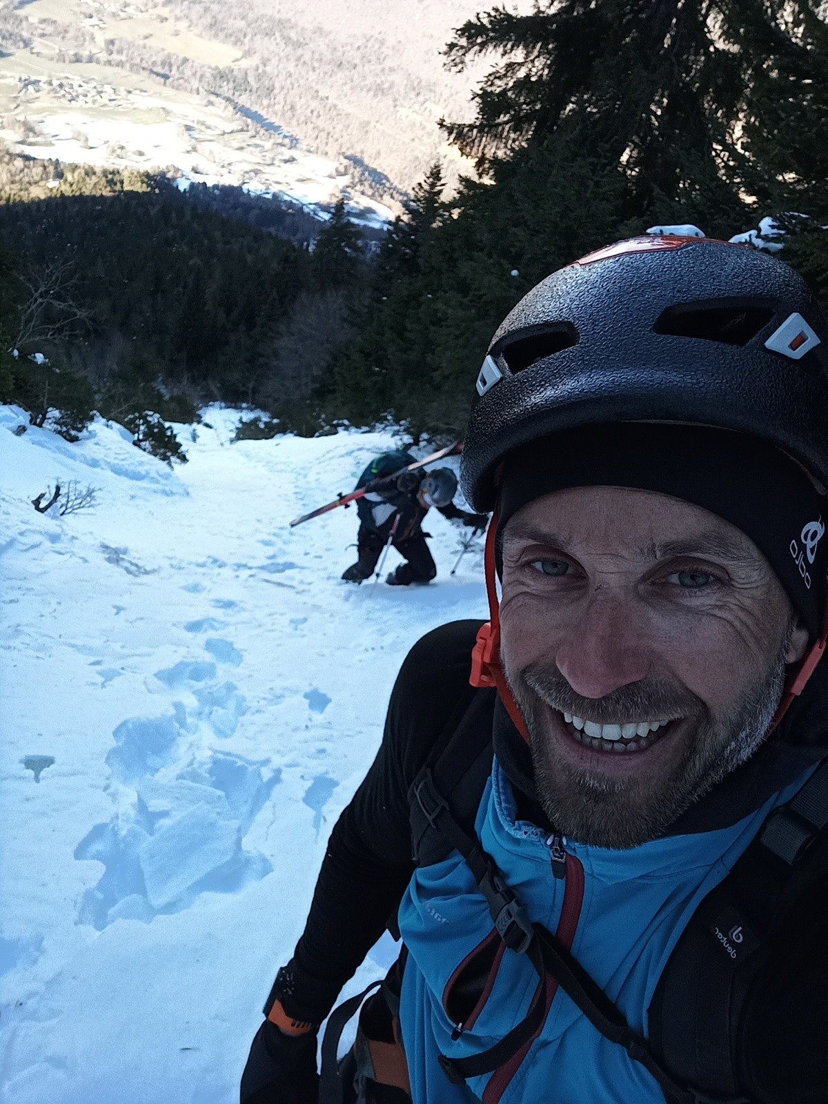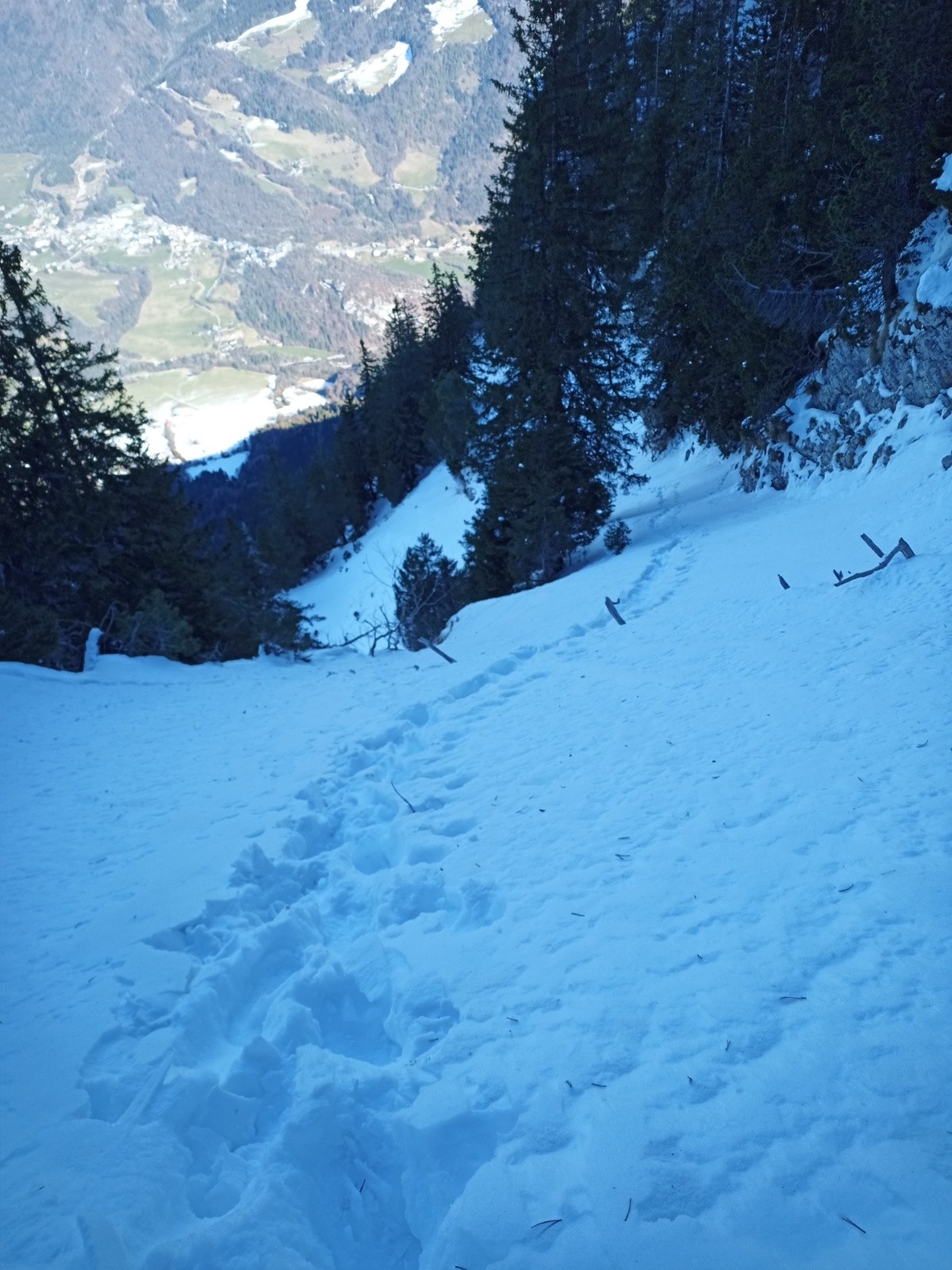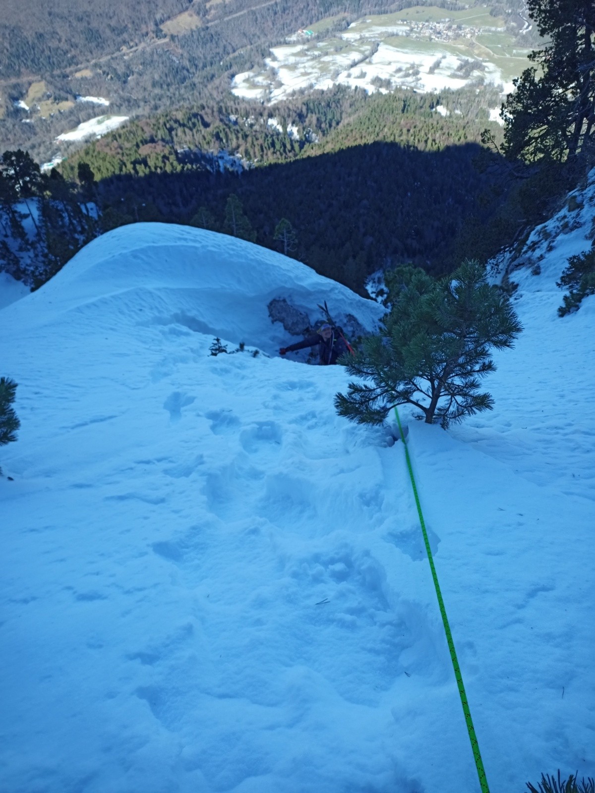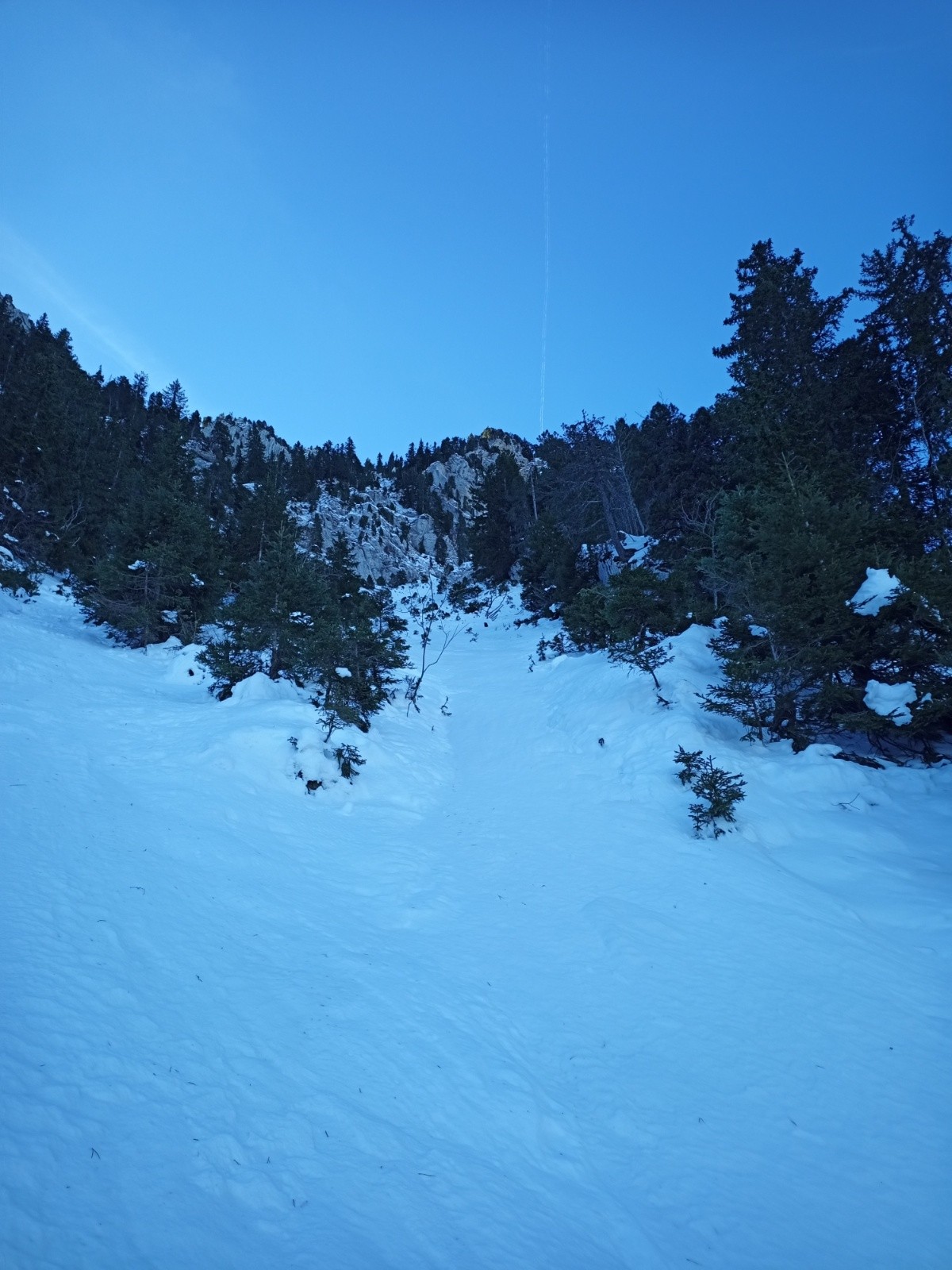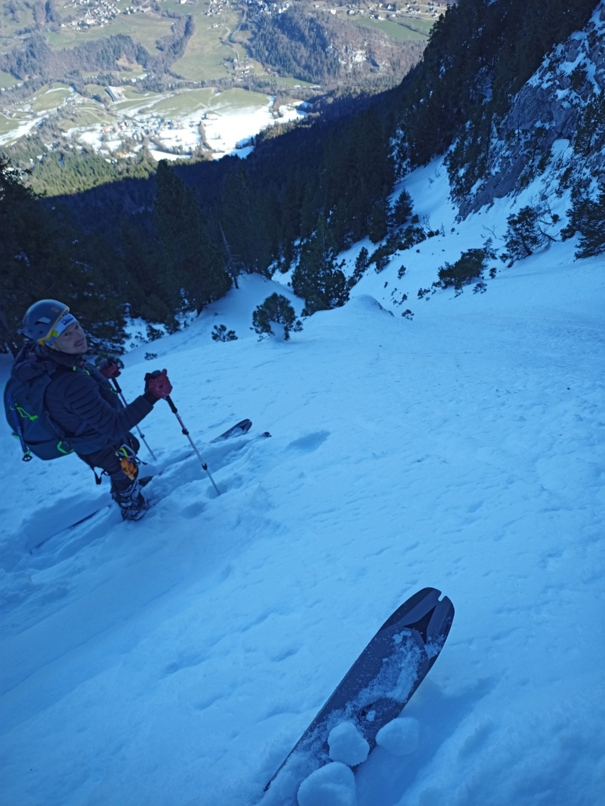 Conditions pour le ski : neige changeante, idéale pour un repérage en couloir raide, mais manque dans toute la forêt.. couloir assez bien skiant mais plaqué dur par endroit.