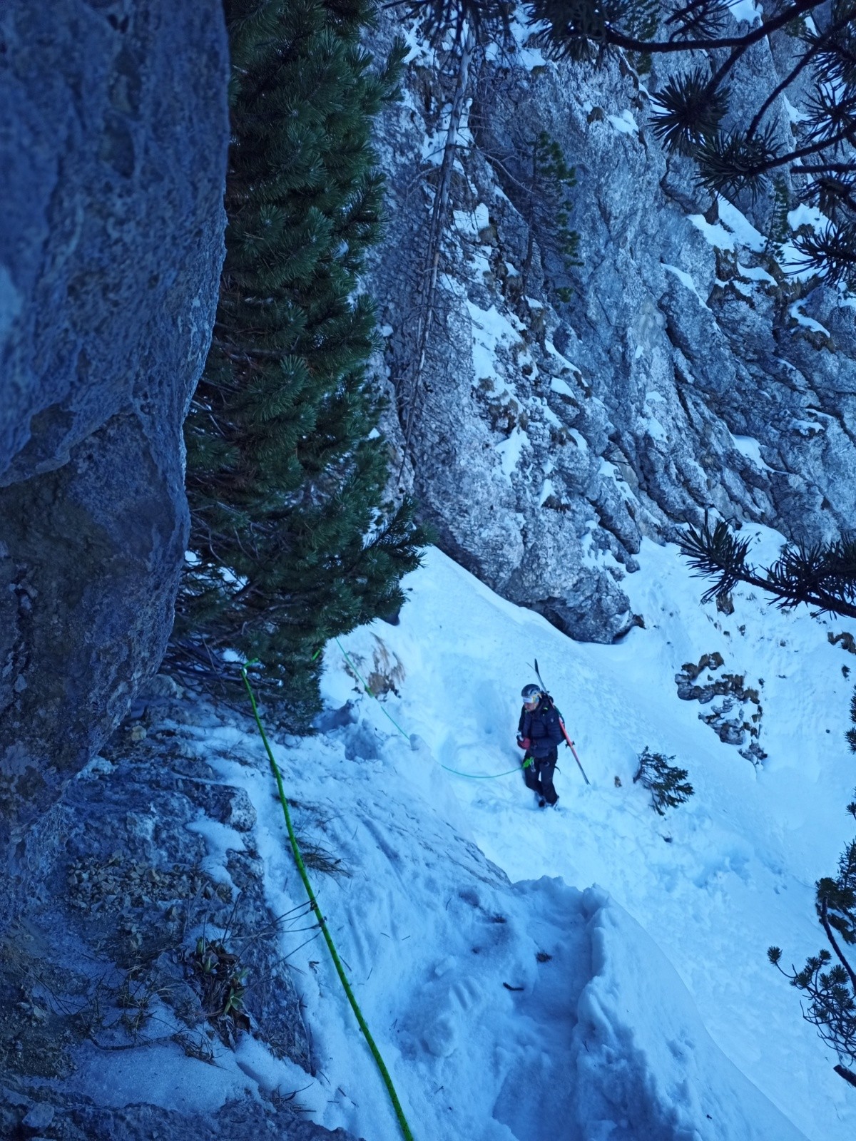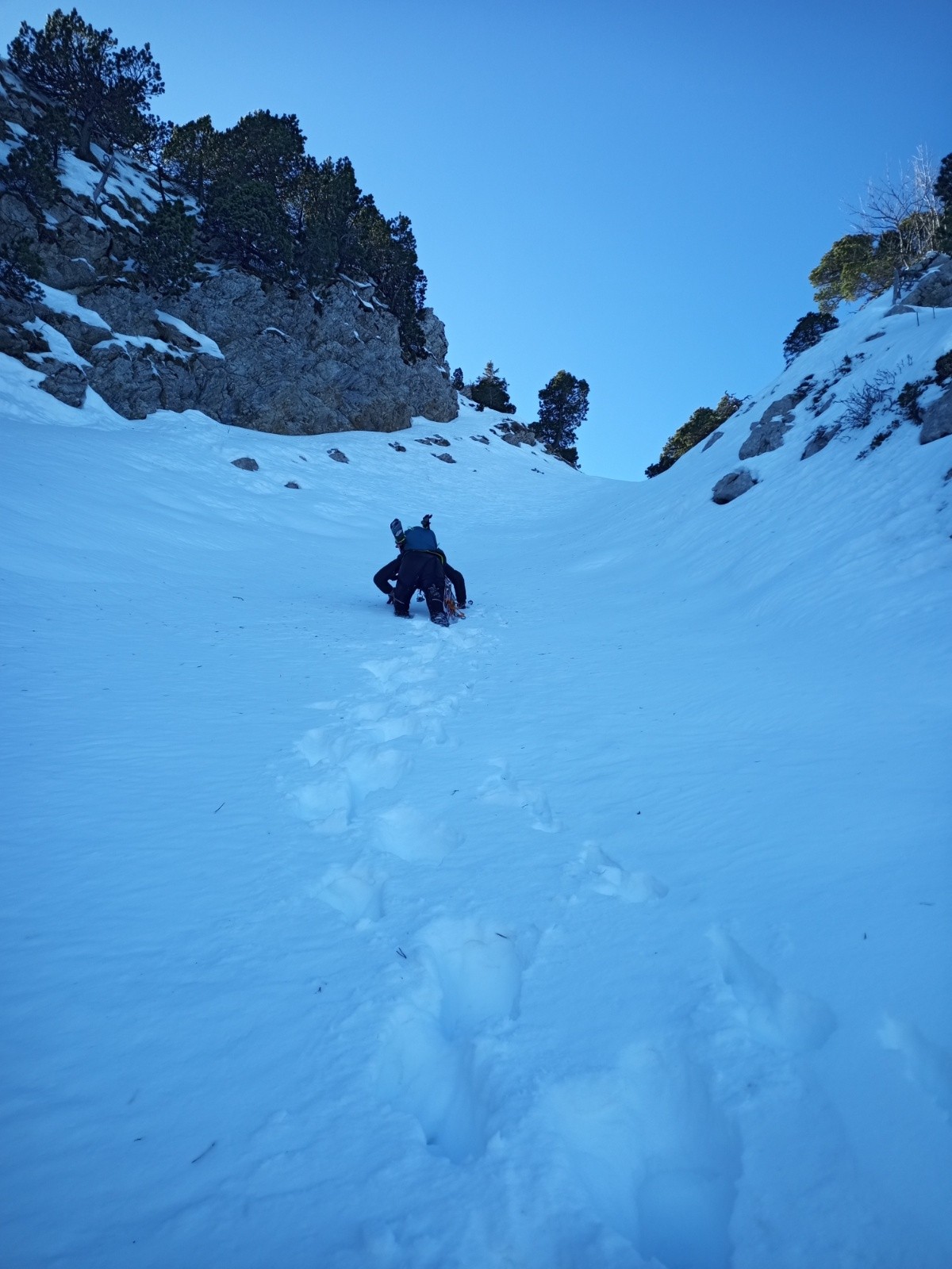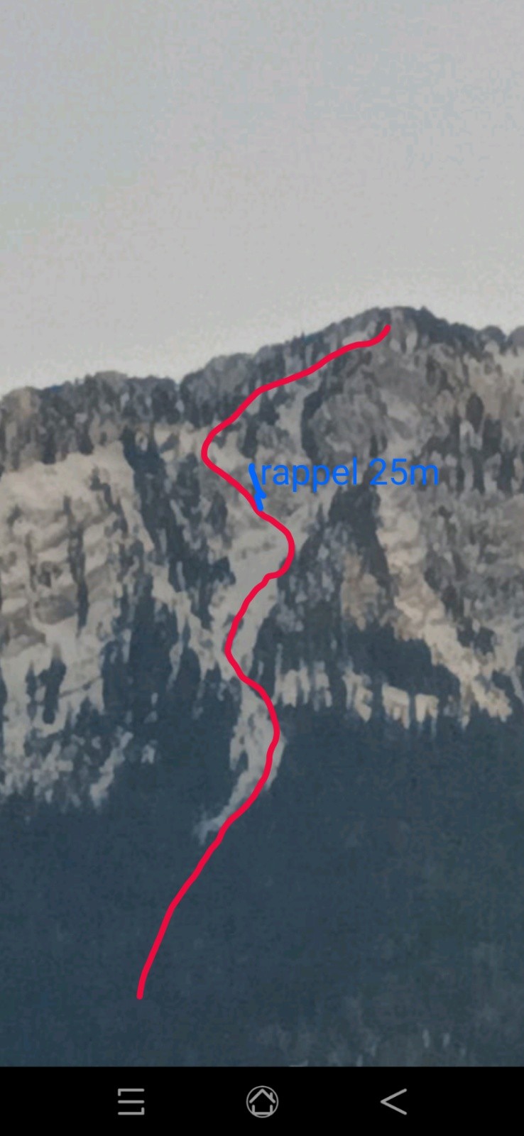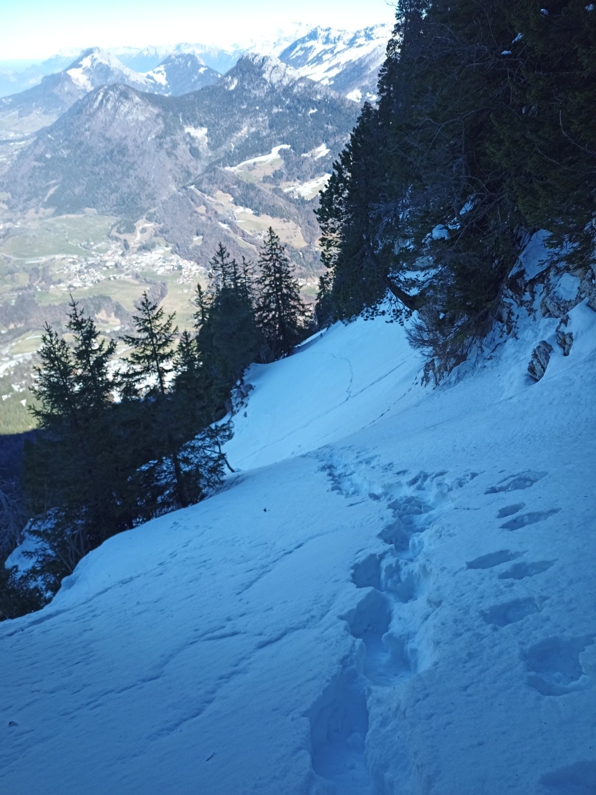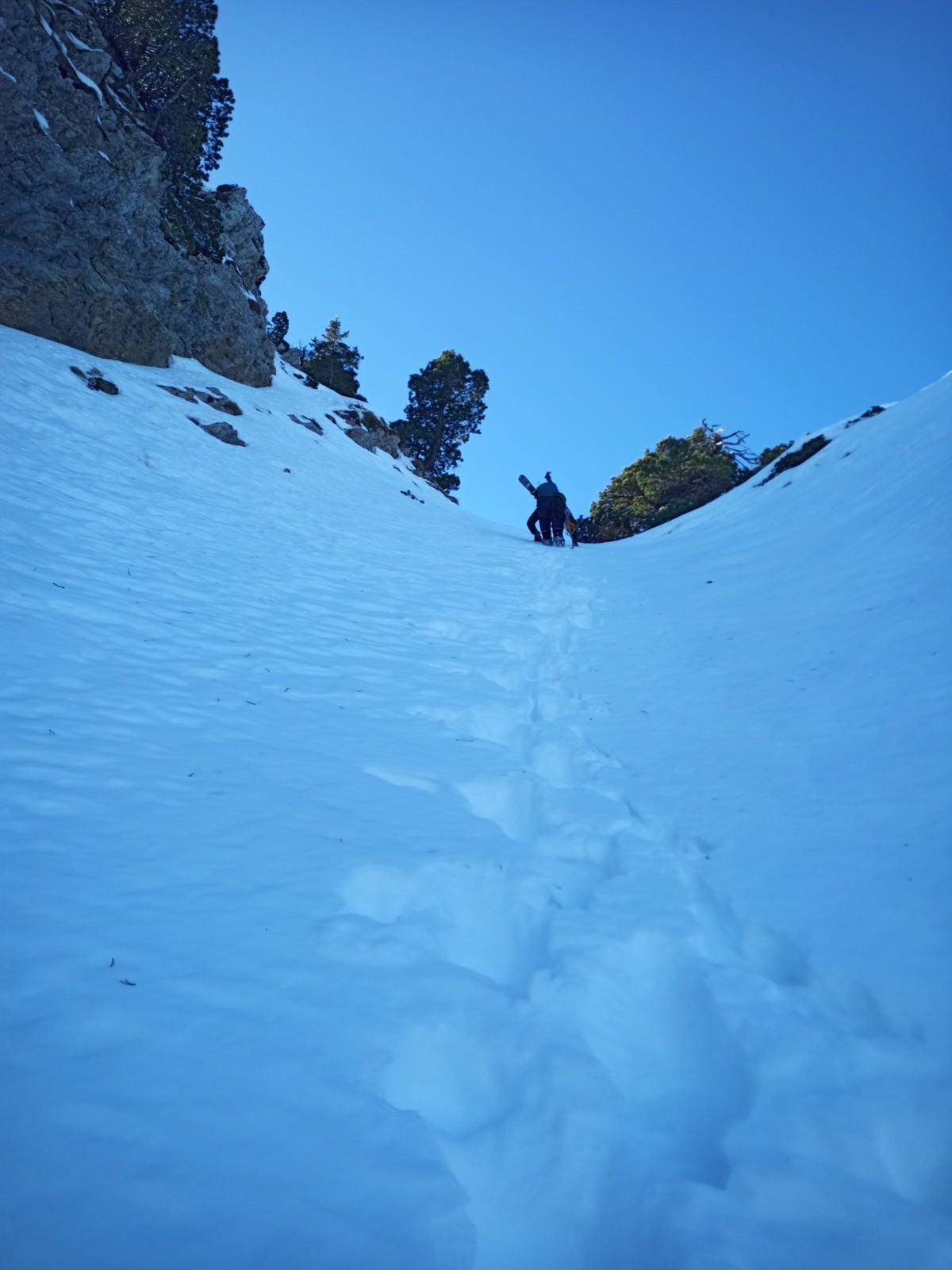 Conditions pour le ski : neige changeante, idéale pour un repérage en couloir raide, mais manque dans toute la forêt.. couloir assez bien skiant mais plaqué dur par endroit.