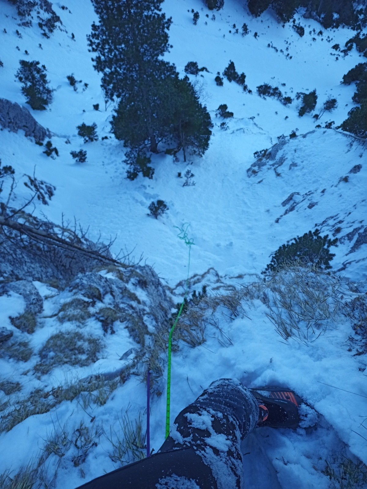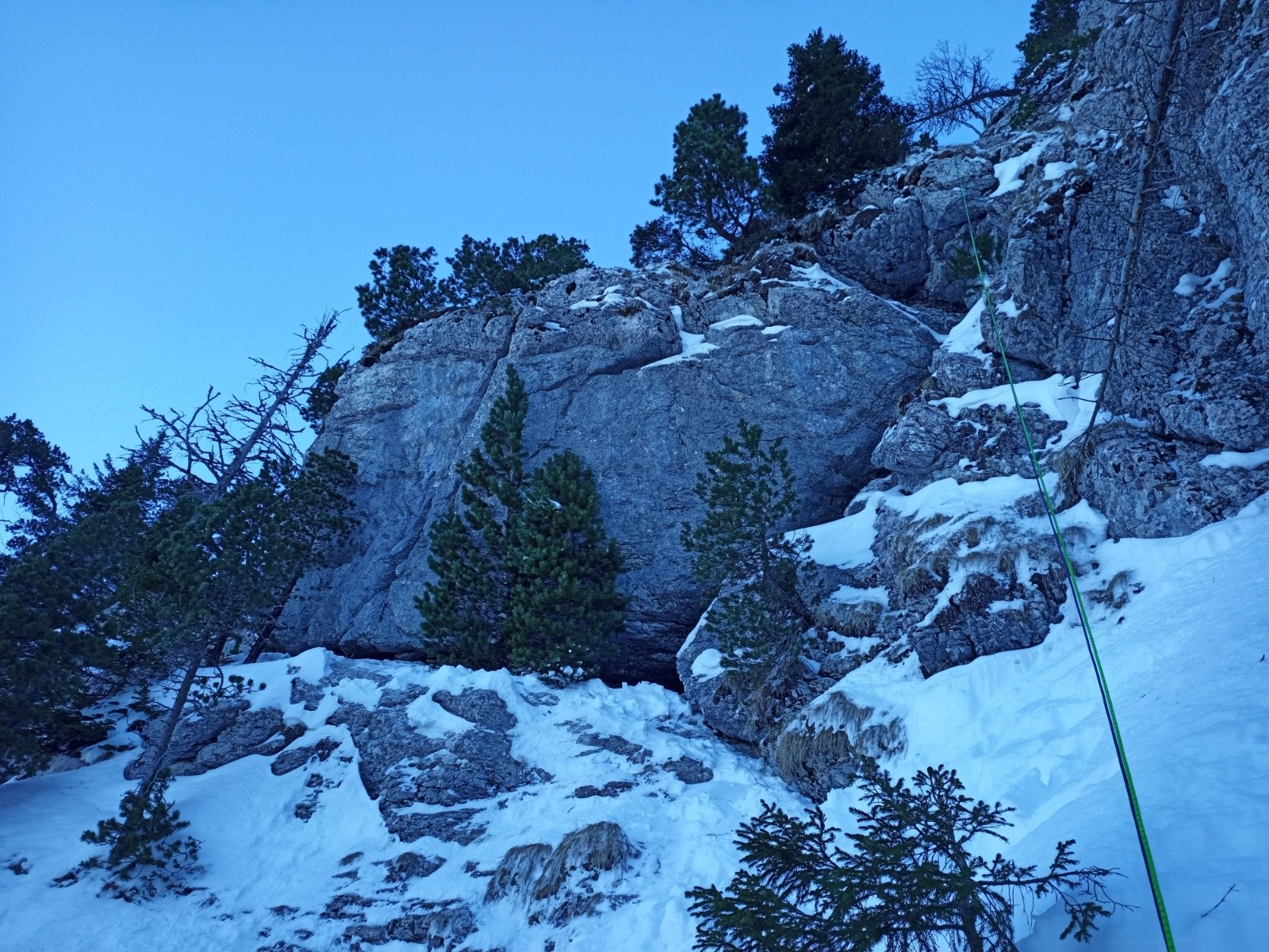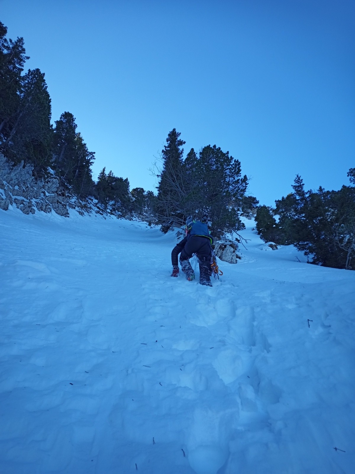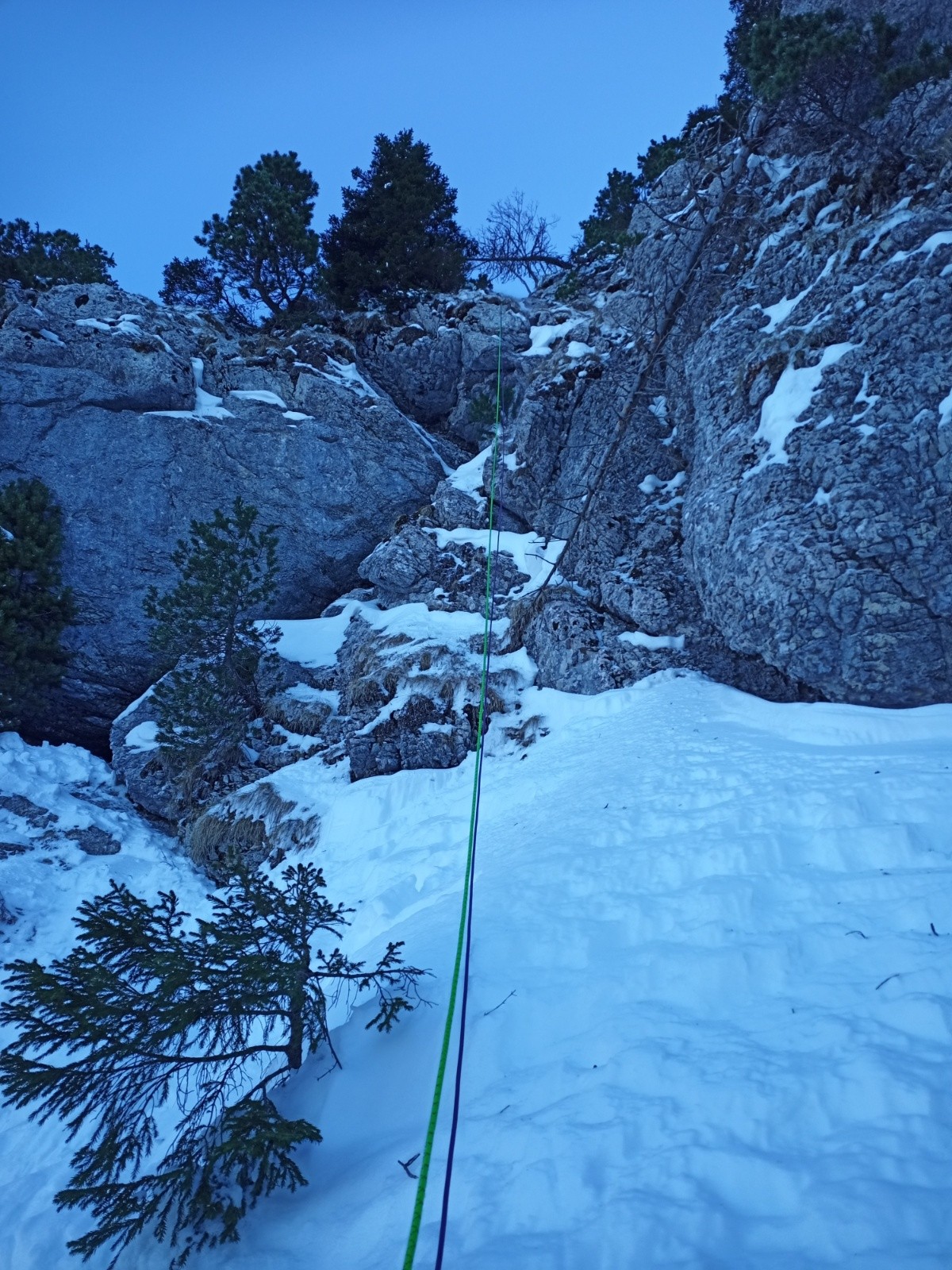 Conditions pour le ski : neige changeante, idéale pour un repérage en couloir raide, mais manque dans toute la forêt.. couloir assez bien skiant mais plaqué dur par endroit.