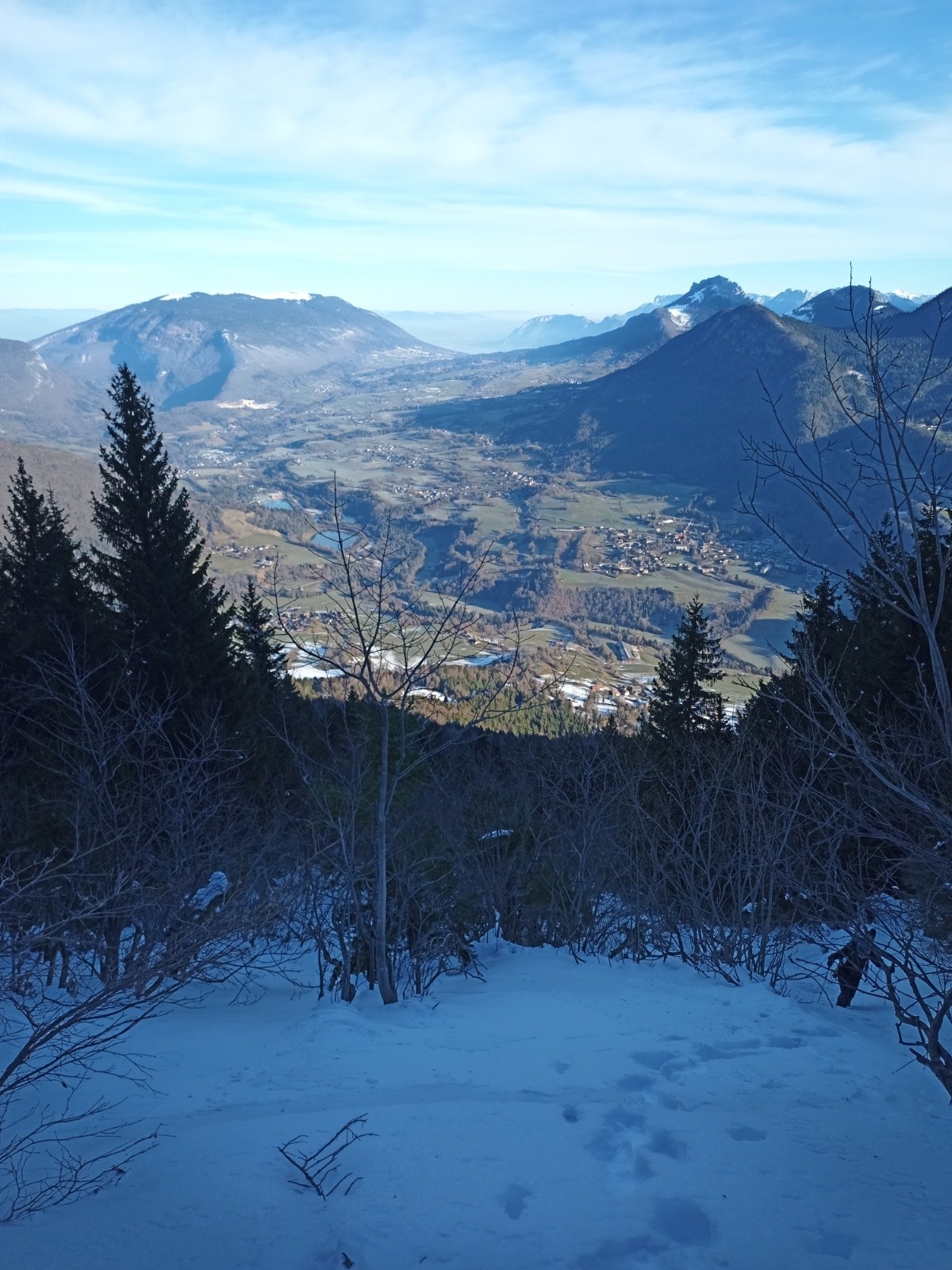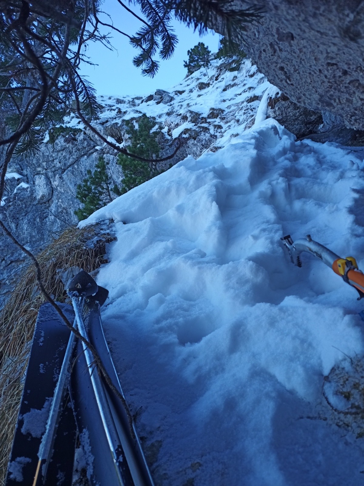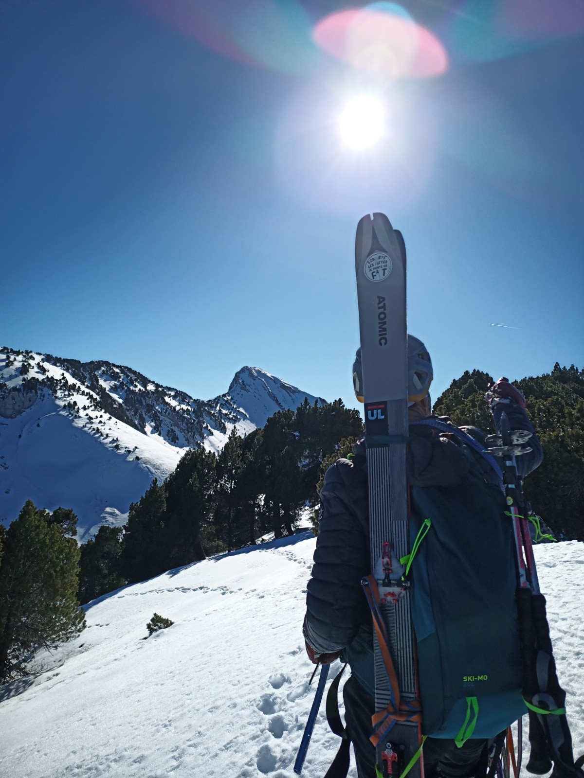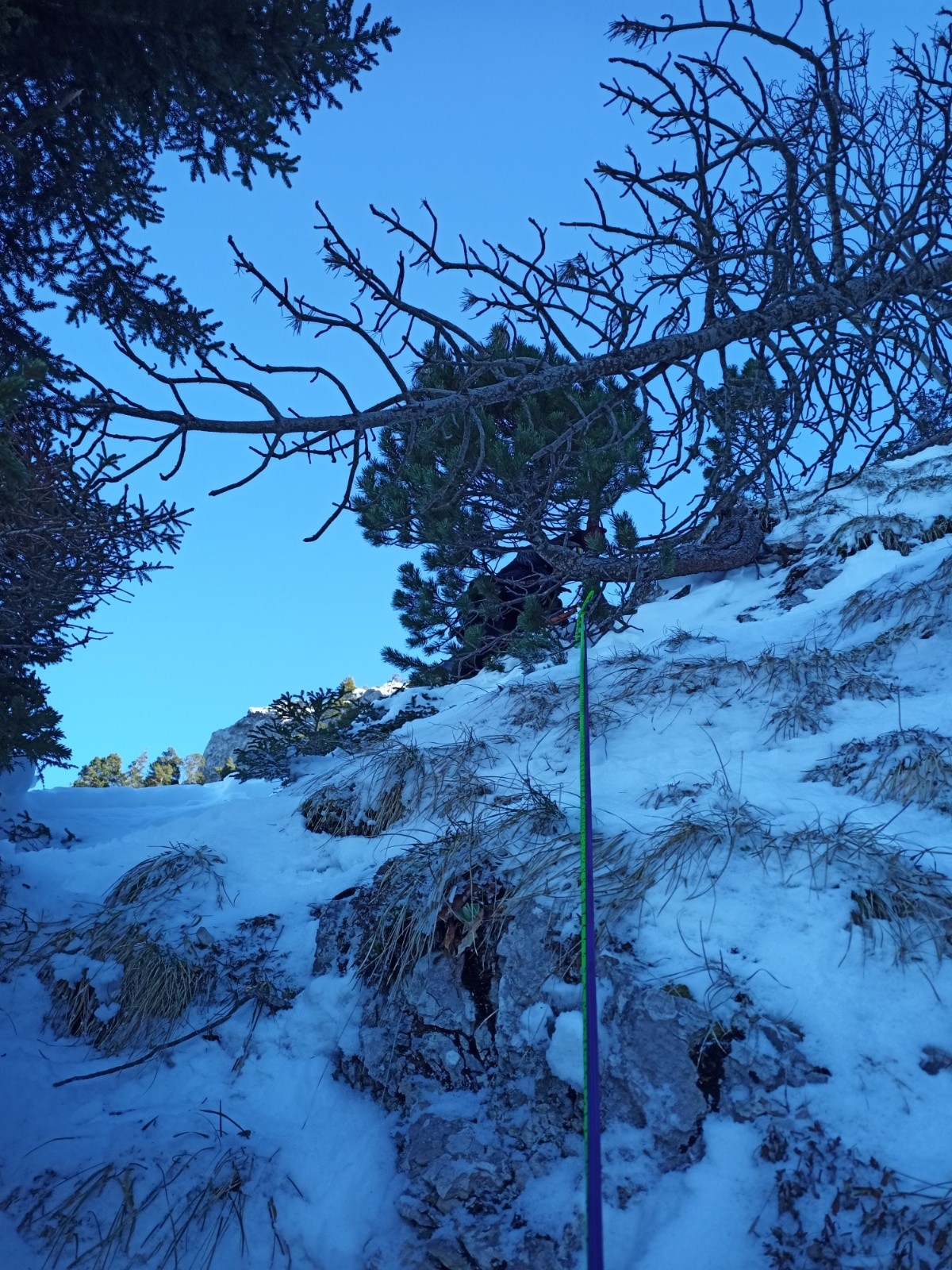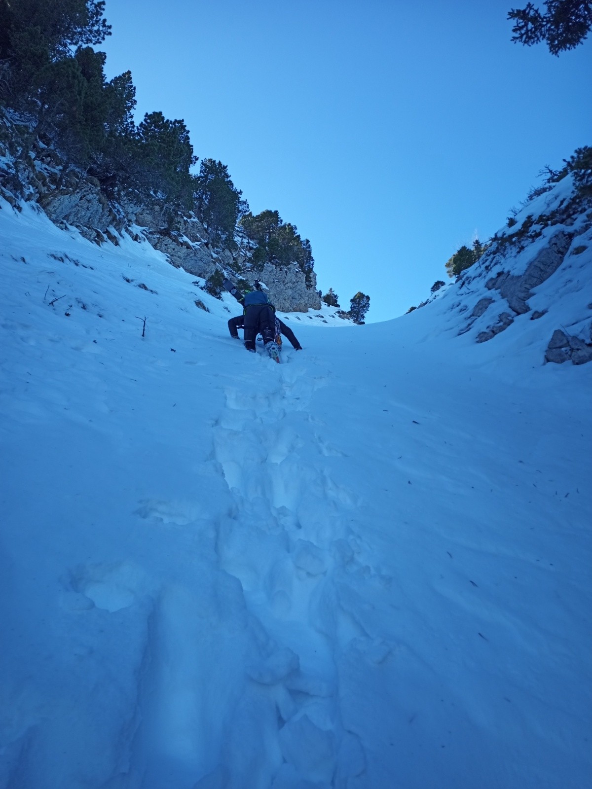 Conditions pour le ski : neige changeante, idéale pour un repérage en couloir raide, mais manque dans toute la forêt.. couloir assez bien skiant mais plaqué dur par endroit.