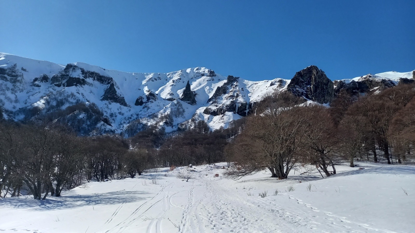 Un joli tour varié qui permet d'aller visiter Chaudefour sans pentes trop raides. Savoir où passer dans le bas de la descente de Cadacogne n'est pas forcément évident (j'ai gardé la croupe assez longtemps, puis à droite dans un petit vallon un peu raide). Enneigement très très limite sur cette croupe, mais pas de cailloux donc ça passe. De même, le goulet du haut manque de neige, mais on peut assez facilement rentrer dans la face au pied de l'arête Sud du Cadacogne. Pour la remontée de Chaudefour, sentier des rochers de l'Audiouze jusqu'à son grand lacet a droite puis 100m de dénivelé un peu rudes sur une petite crête avant de retrouver des pentes tranquilles. Pas eu le temps de finir par le Puy de l'Angle!