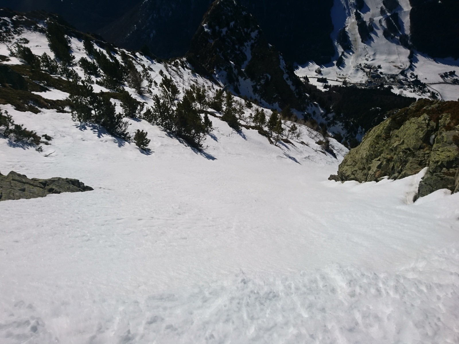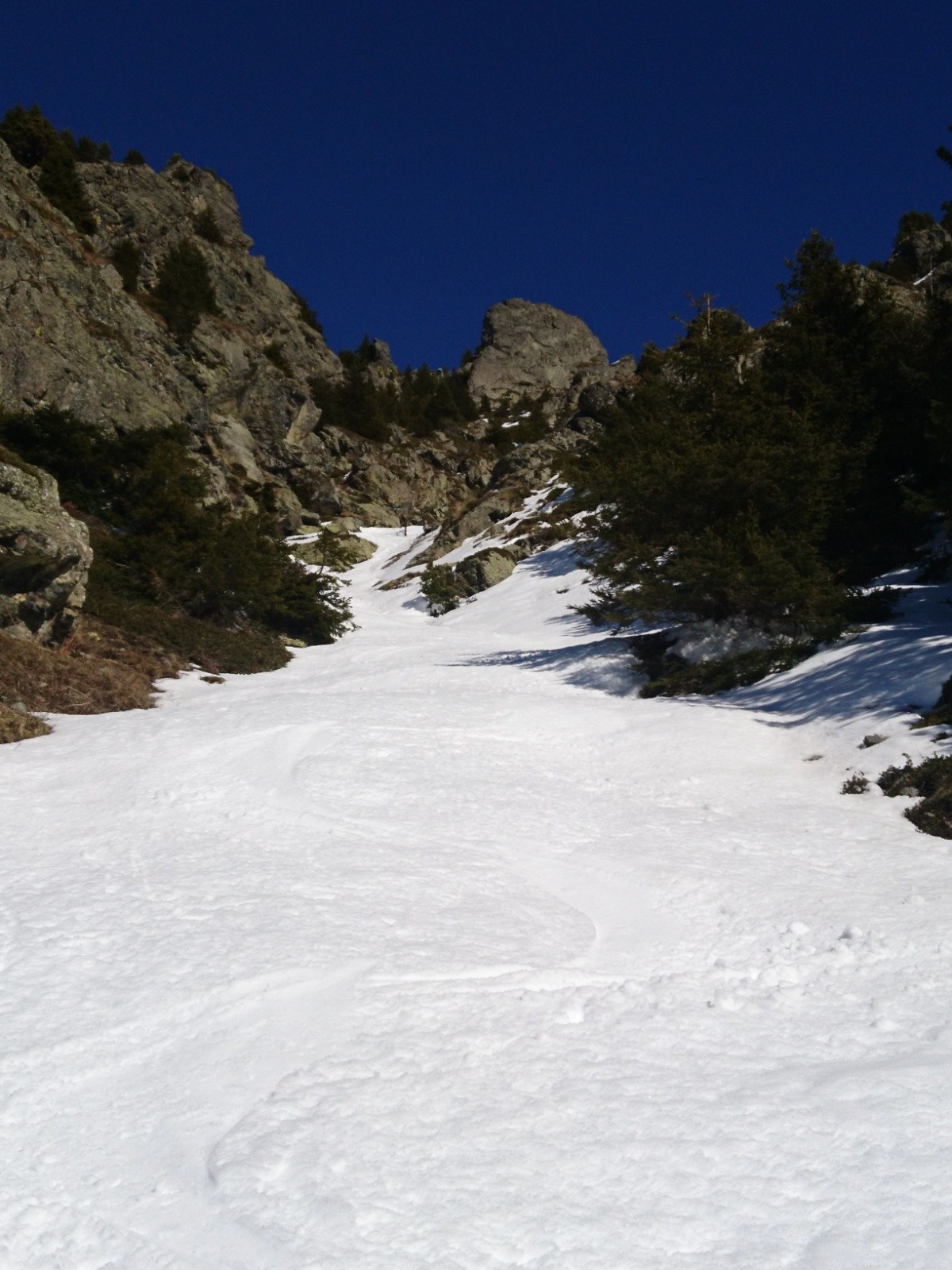 Atchoum me conseille d'enlever les skis, à ce niveau, le couloir est clairement inskiable. La neige est déjà dure (là où il y a de la neige) et nous chaussons, Atchoum et moi les crampons. C'est déjà raide, irrégulier, parsemé de ronces de rochers, qu'importe puisque nous sommes à pied.