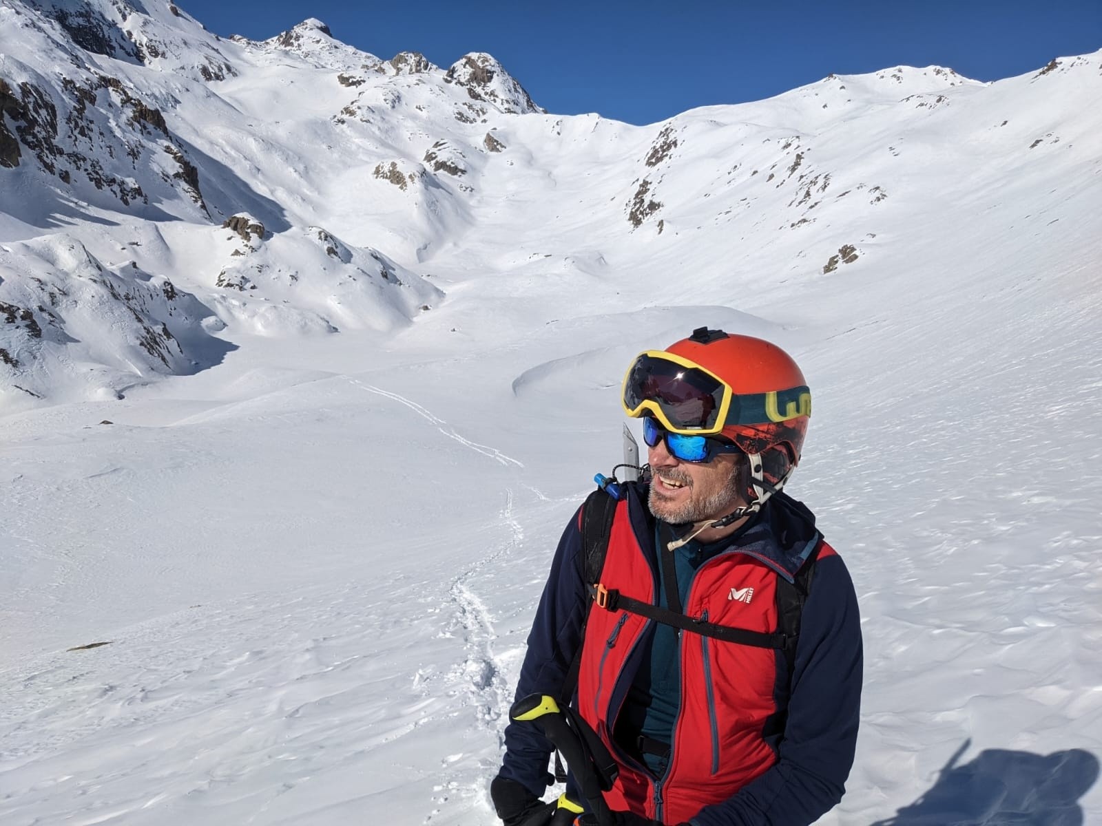 Quelques photos et puis nous descendons. D’abord, sud-Est puis Est et encore sud-Est dans une neige agréable légèrement transformée. Les vallons se succèdent et nous prenons vraiment du plaisir. À proximité du Grand lac, nous remontons sur les crêtes vers la bergerie pour attaquer la dernière descente de la journée jusqu’au pont de l’alpe. On s’arrêtera quand même au pied de l’avalanche du Chardonnet qui a malheureusement tué une personne cette semaine (impressionnant quand même).