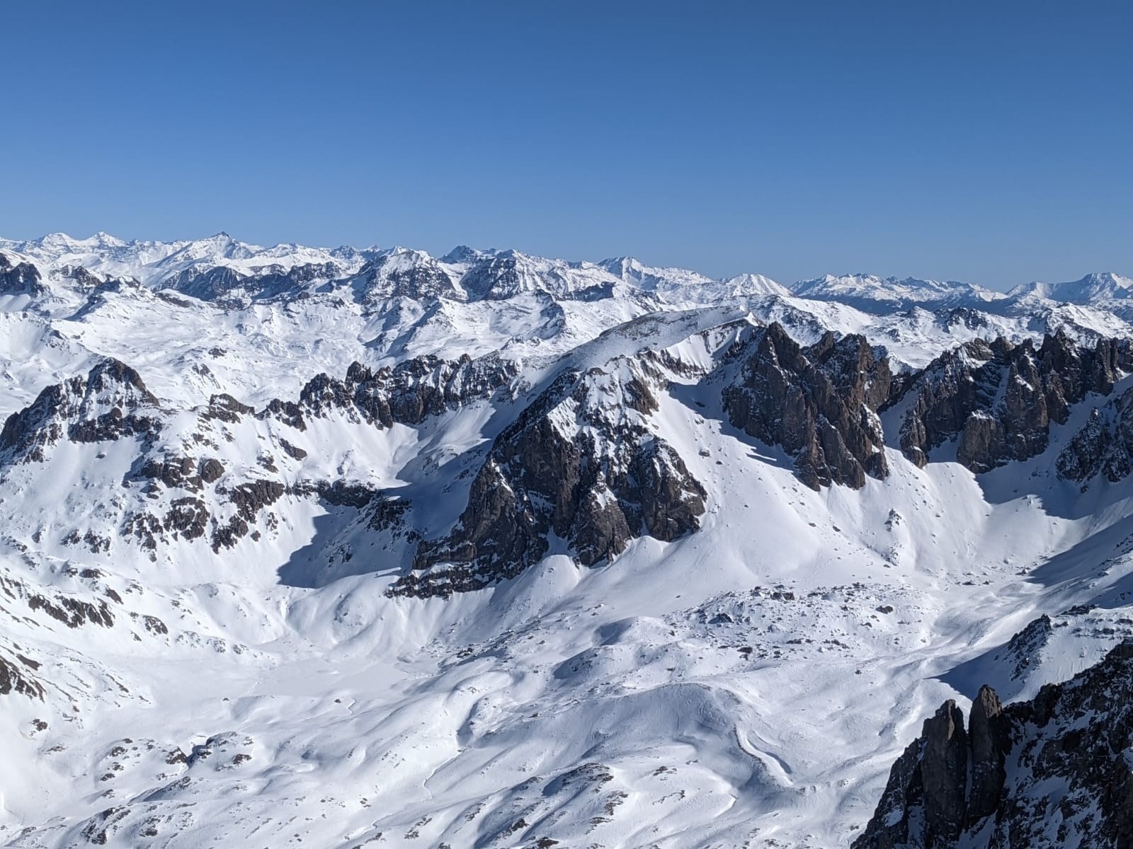 Conditions pour le ski : neige dure en début de matinée, puis poudre tassée selon les versants, transformée dans les versants sud et est.