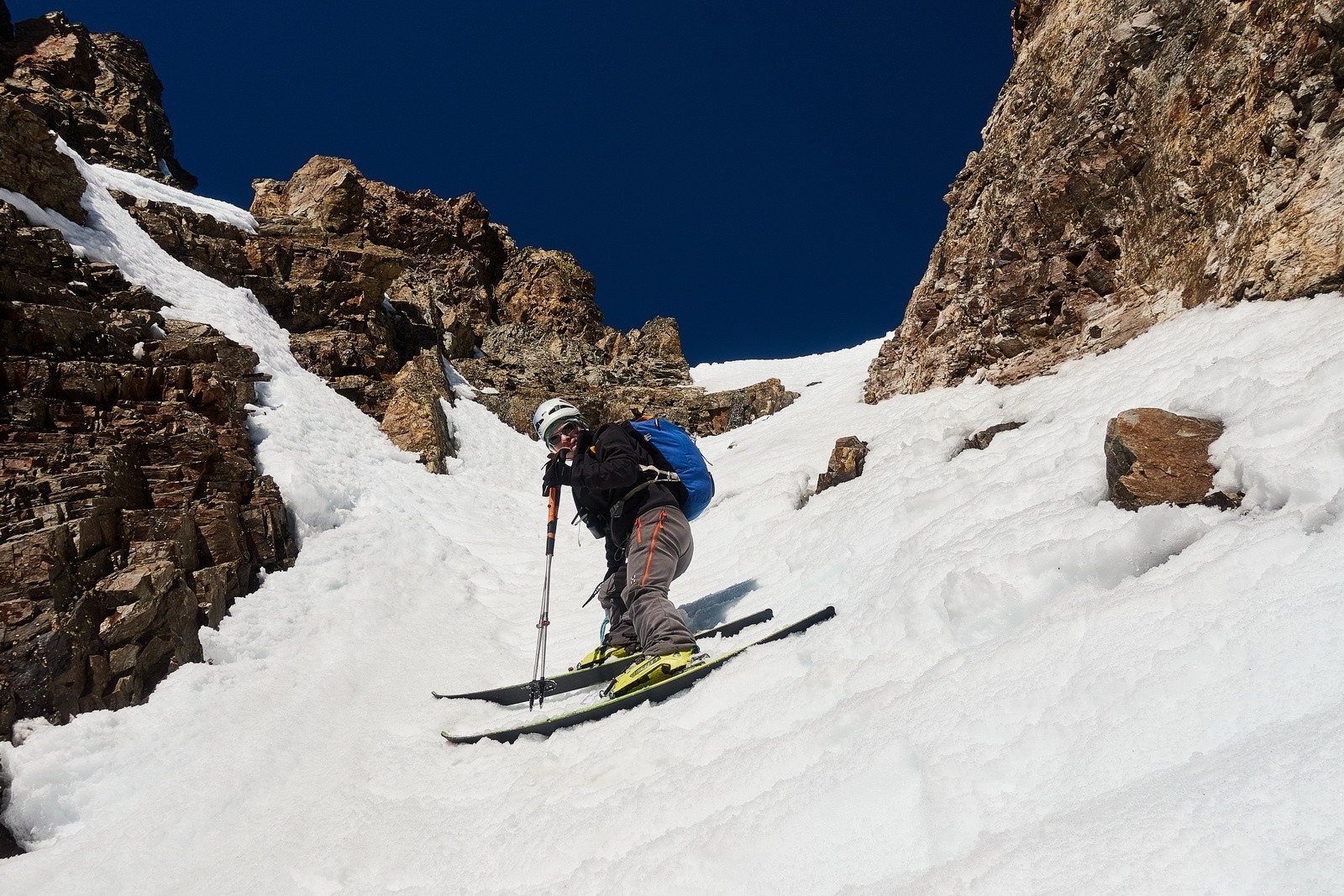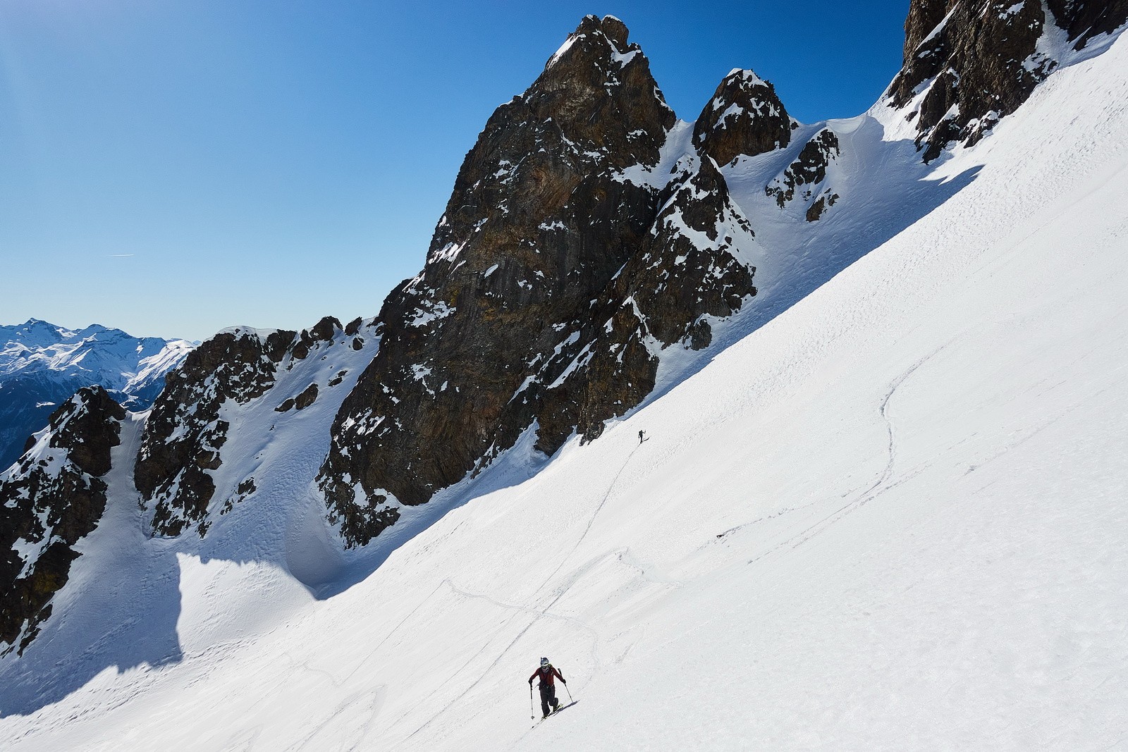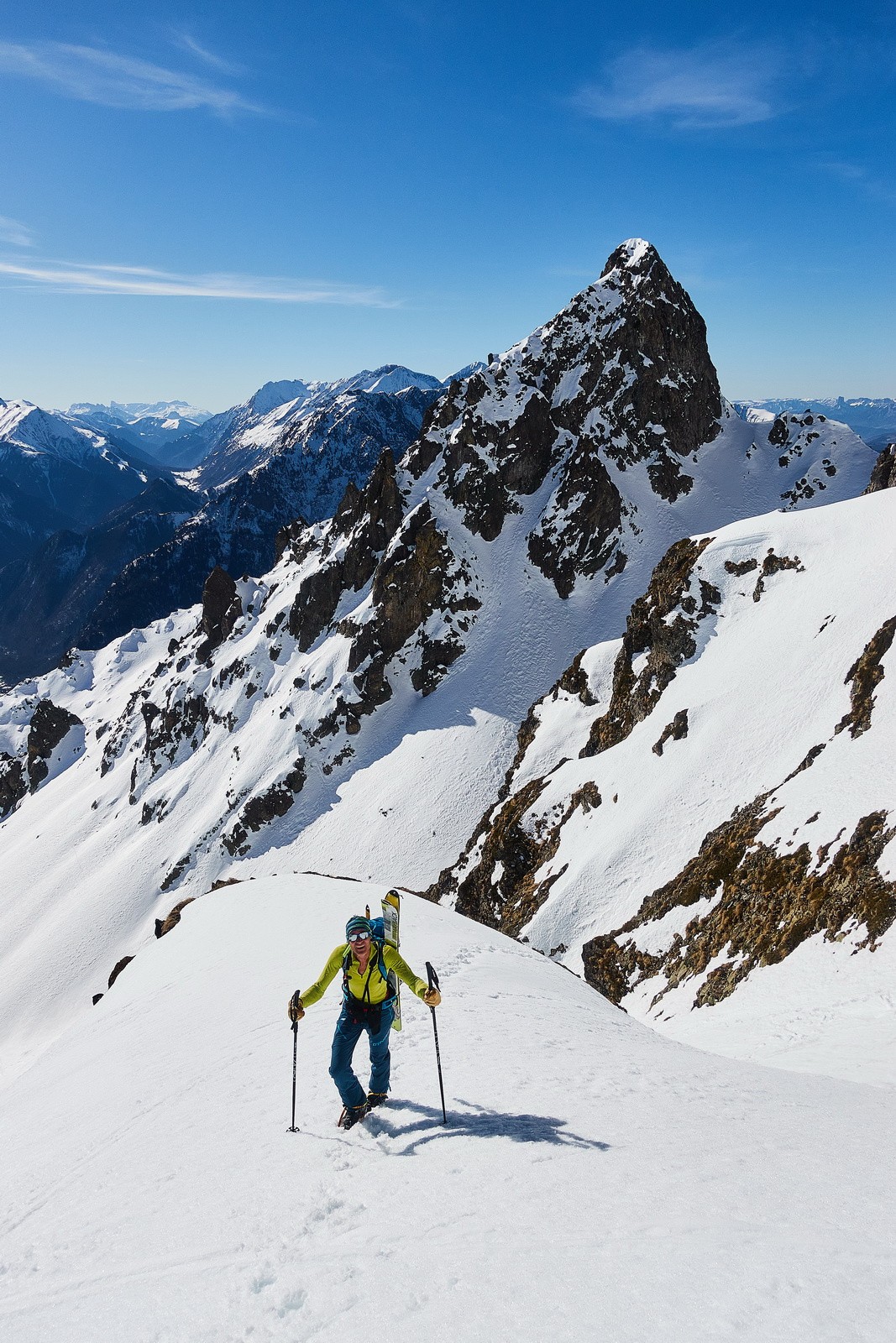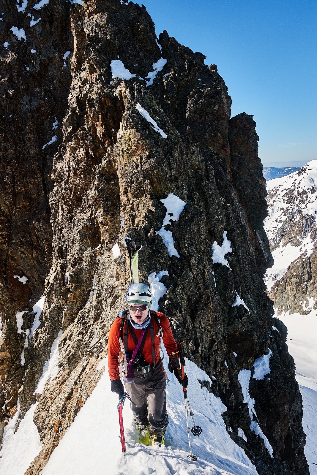 La qualité de la neige ne sera pas optimale dans le crux, mais une fois de plus, c’est dans la difficulté qu’on progresse… Grosse ambiance en tout cas depuis l’étroite arête sommitale, skis aux pieds, avant de plonger dans la couenne !