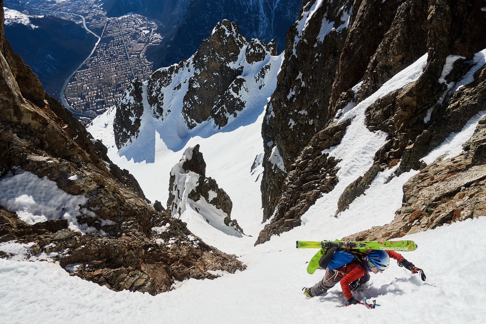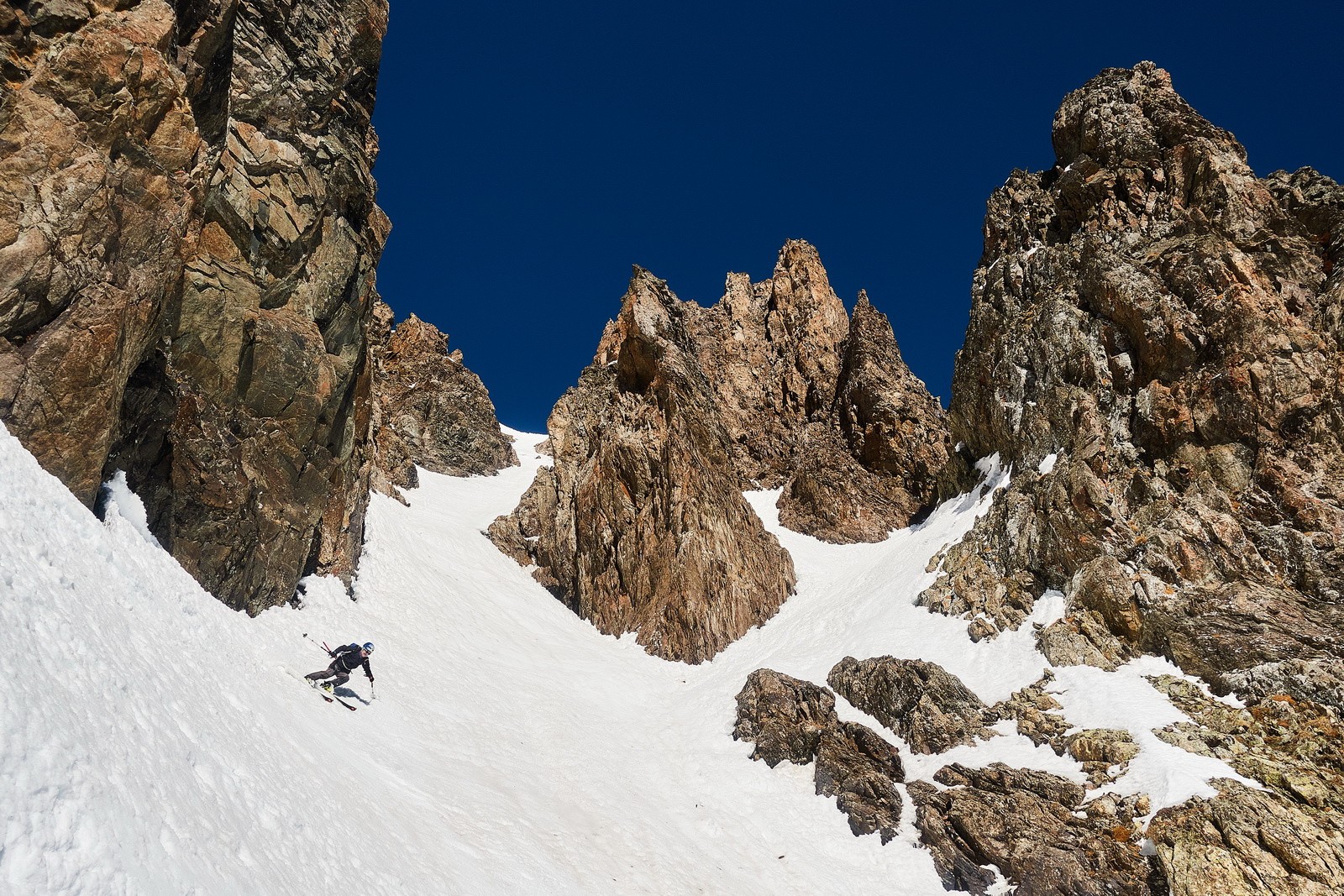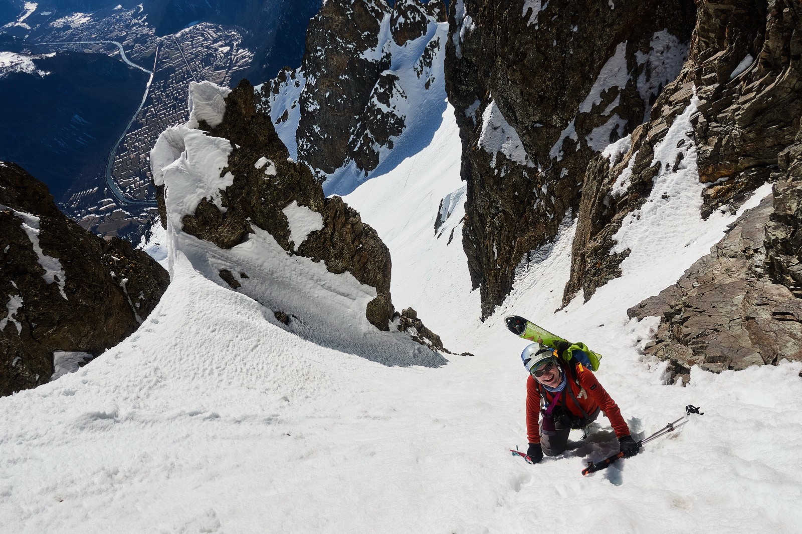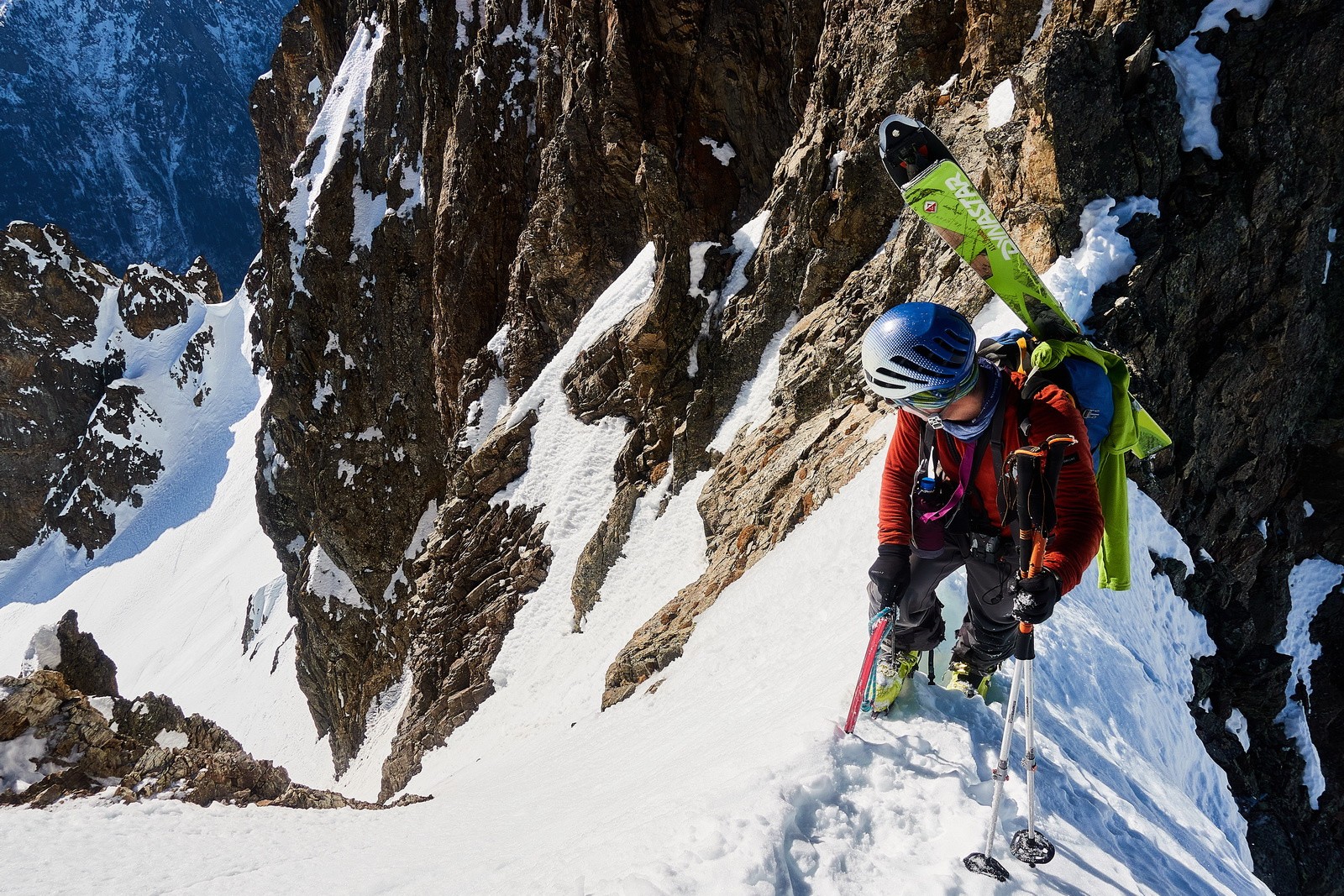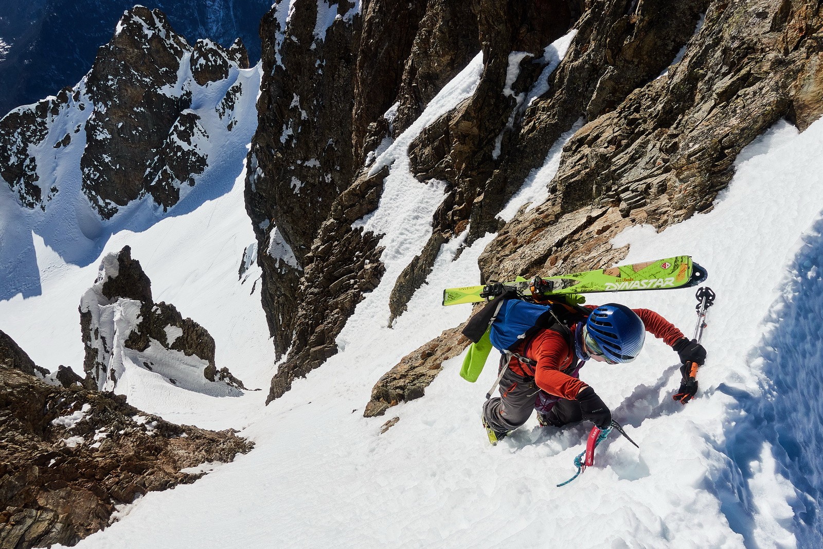 La qualité de la neige ne sera pas optimale dans le crux, mais une fois de plus, c’est dans la difficulté qu’on progresse… Grosse ambiance en tout cas depuis l’étroite arête sommitale, skis aux pieds, avant de plonger dans la couenne !