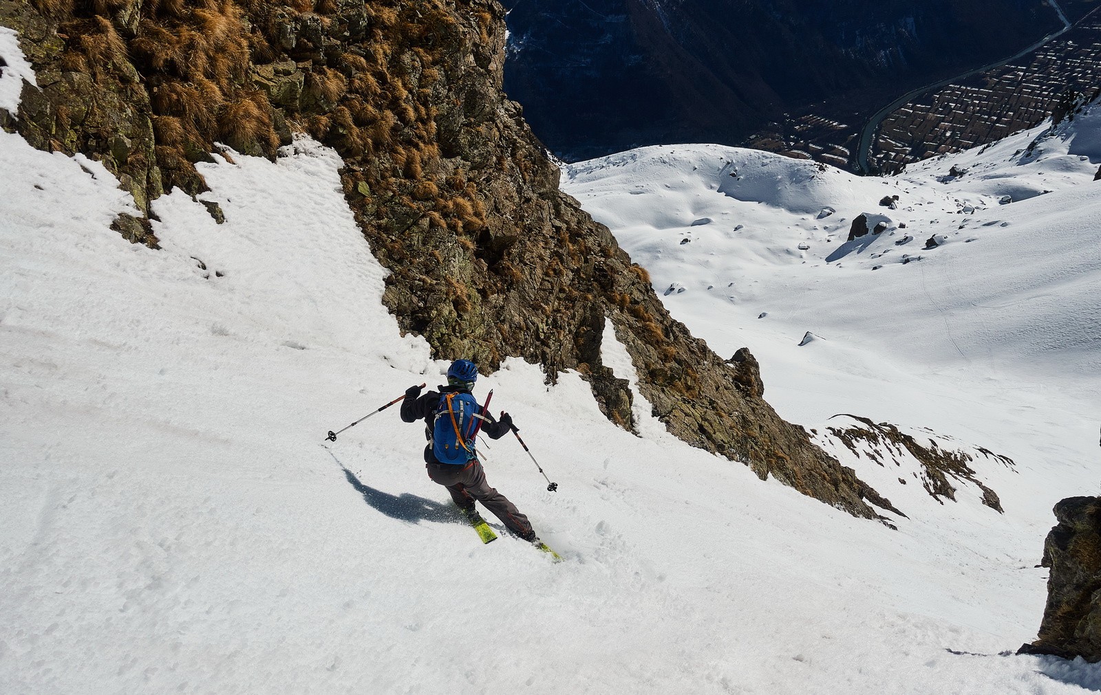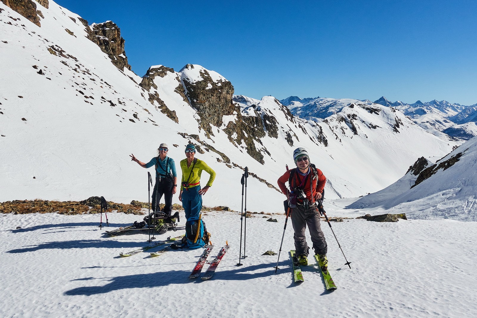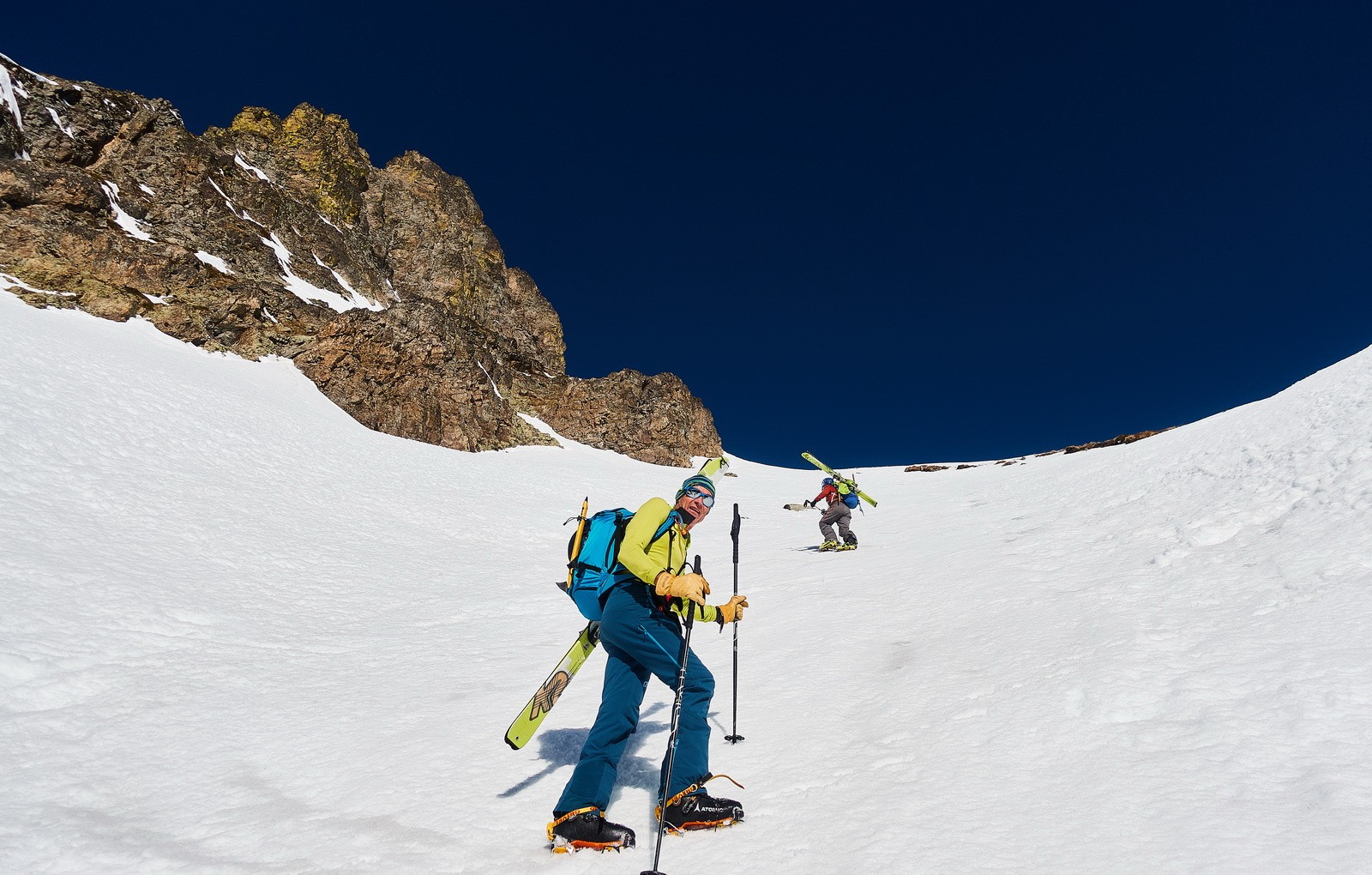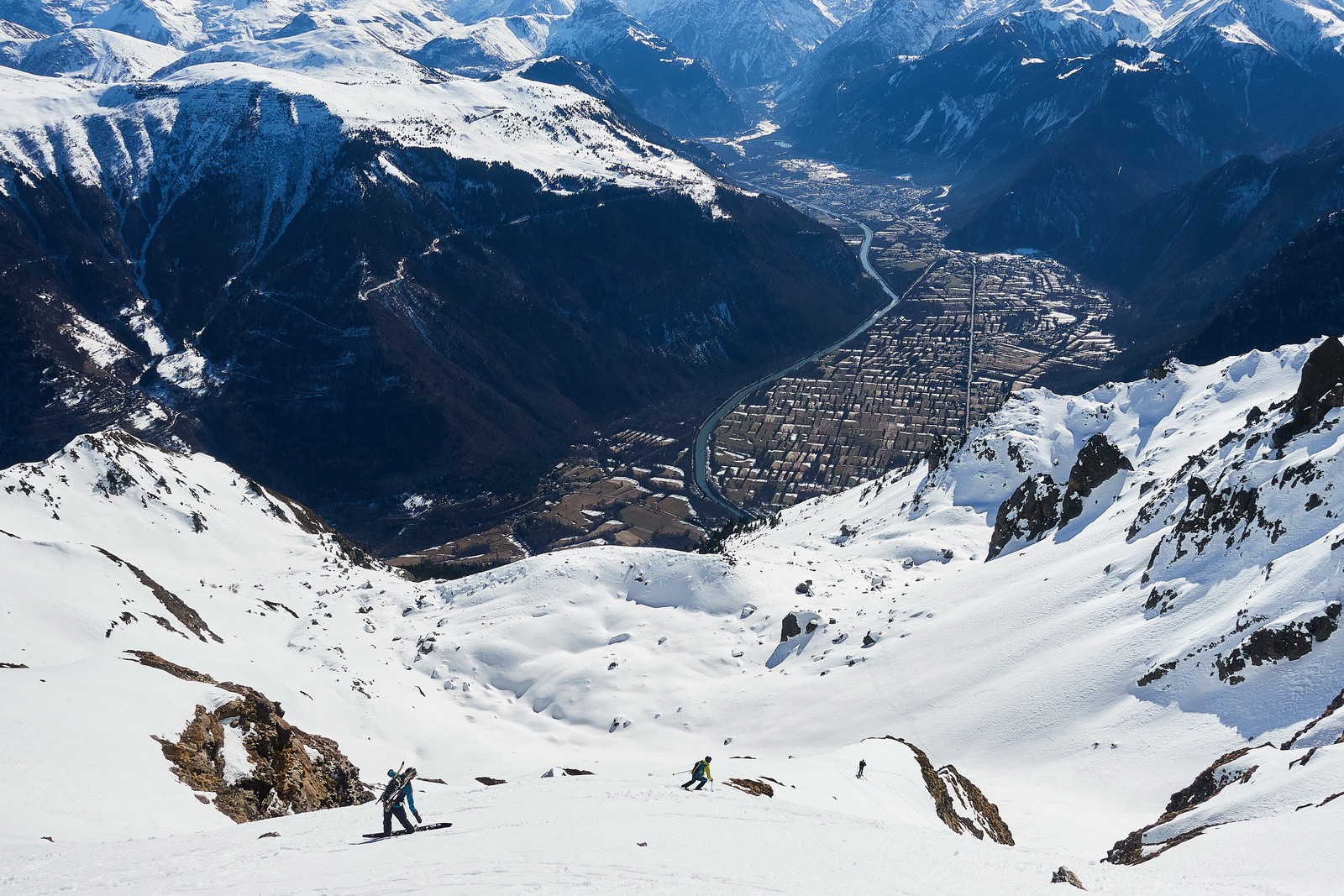 La qualité de la neige ne sera pas optimale dans le crux, mais une fois de plus, c’est dans la difficulté qu’on progresse… Grosse ambiance en tout cas depuis l’étroite arête sommitale, skis aux pieds, avant de plonger dans la couenne !