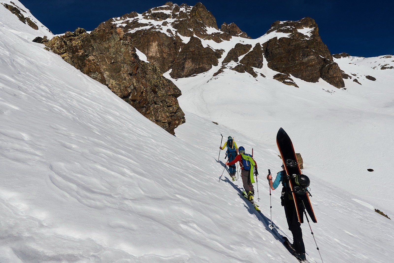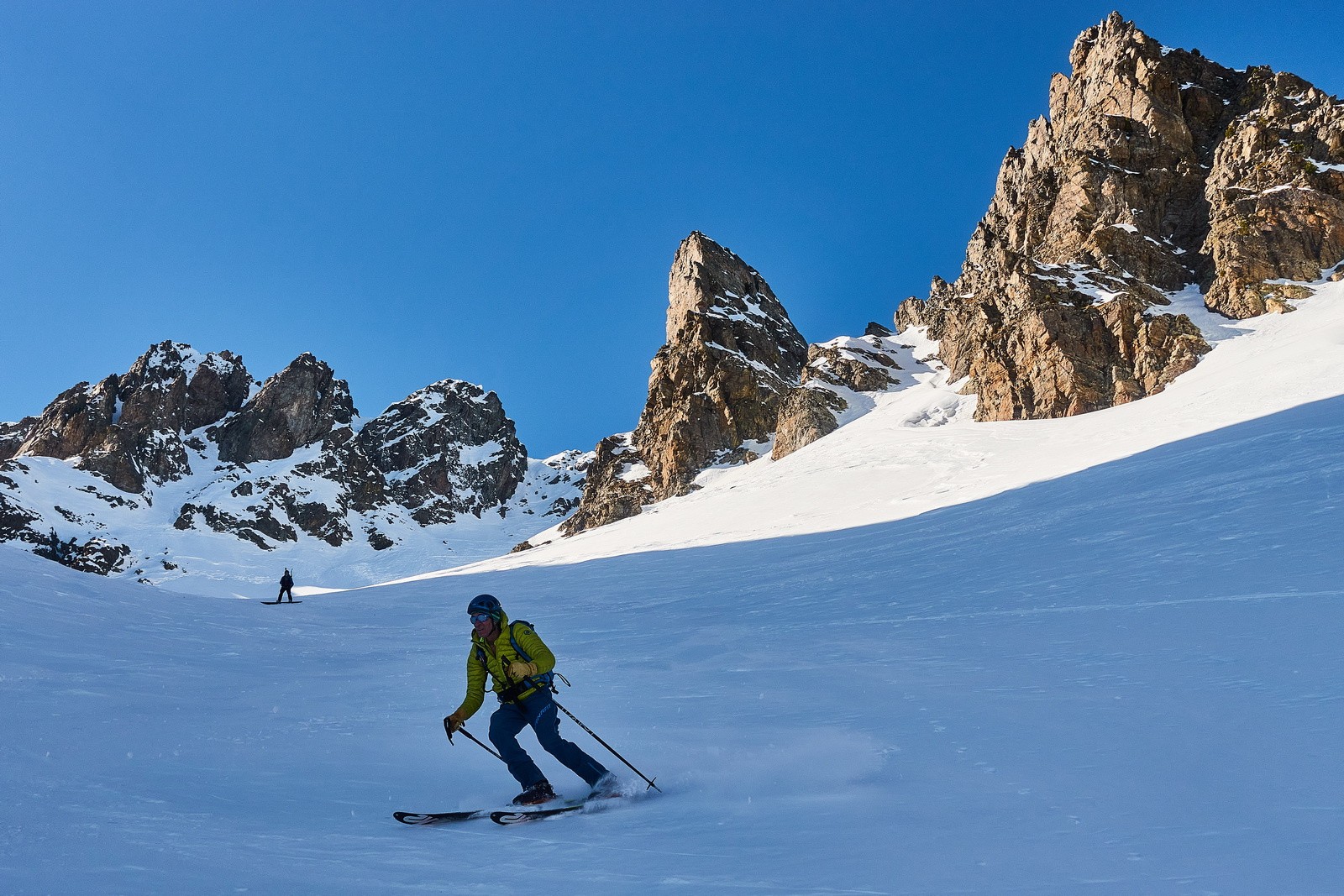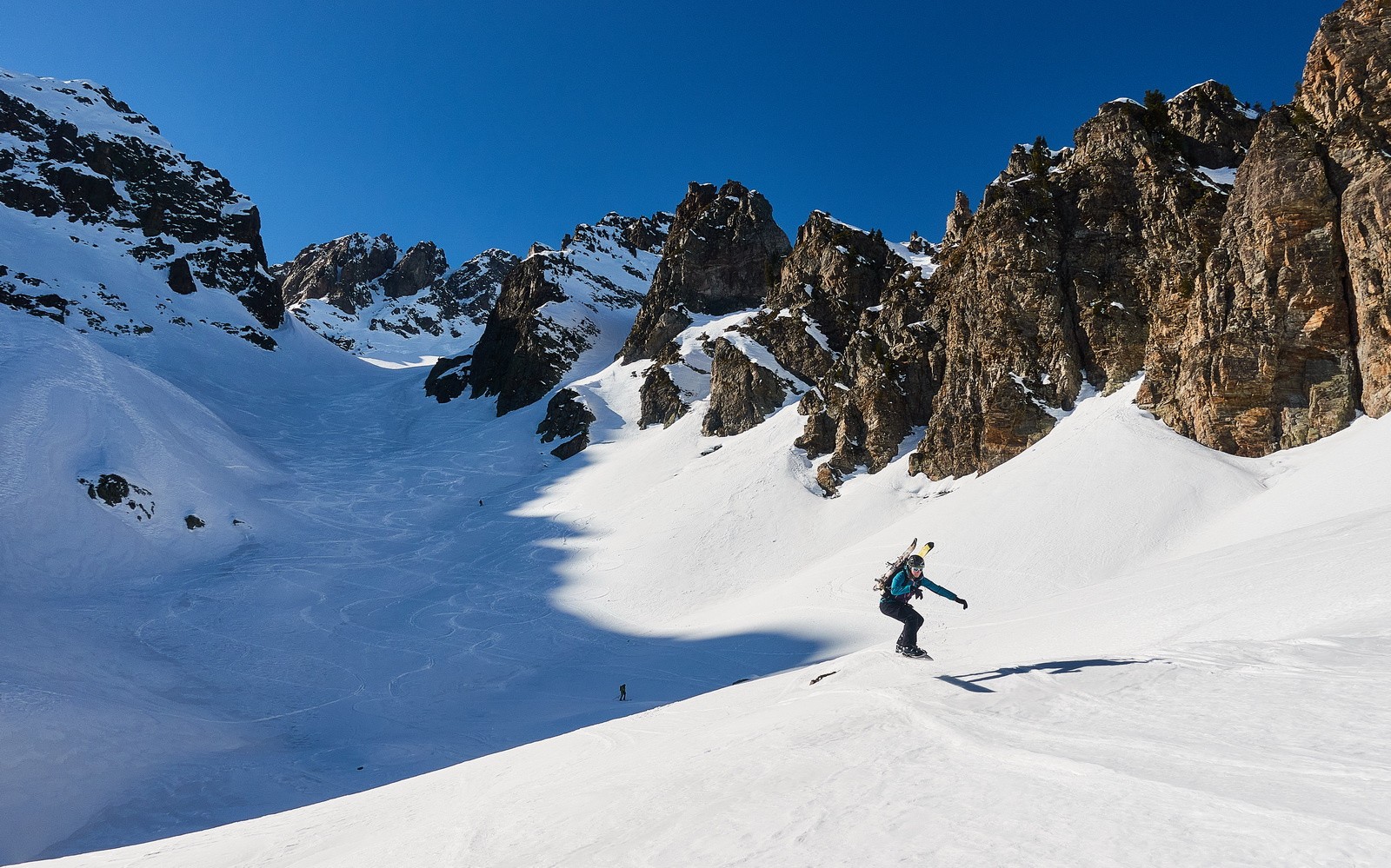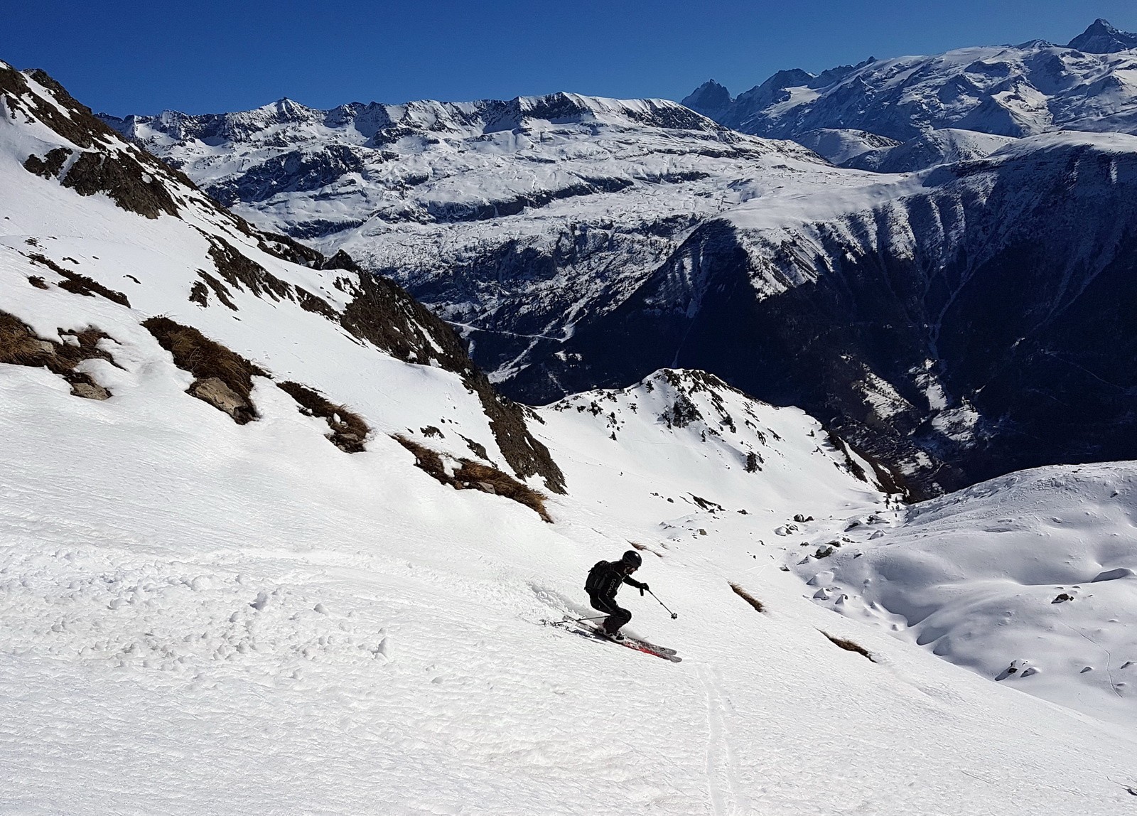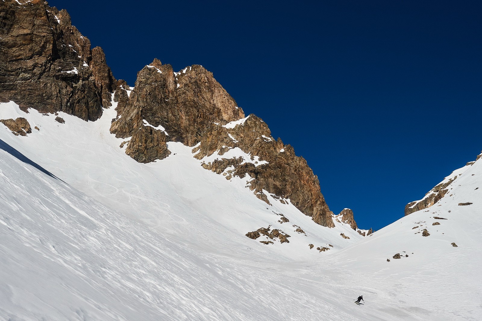 Après une descente plein Sud des grandes pentes dominant la vallée atypique du Bourg d’Oisans, nous voilà repartis dans la poursuite de la boucle vers le Vallon du Chazeau, nous offrant de nouveaux panoramas grandioses sur ce coin retiré de Belledonne, en nous faisant presque oublier la qualité moyenne de la neige globalement assez changeante et rapidement déficitaire sur le bas.