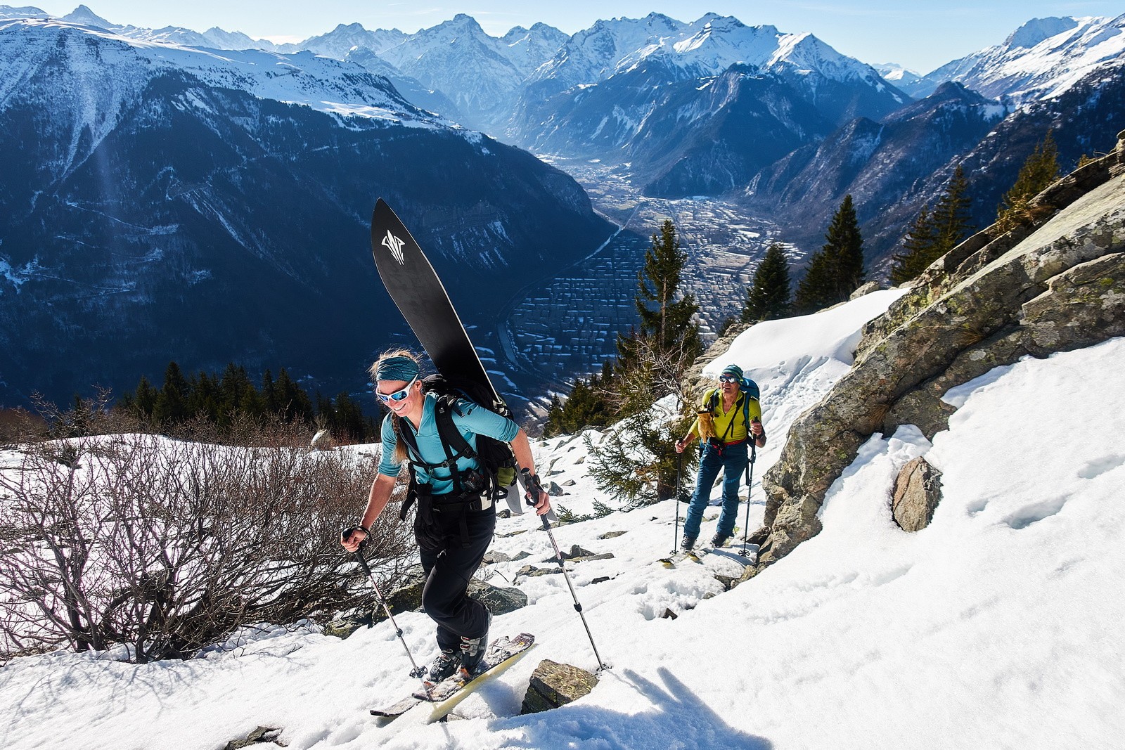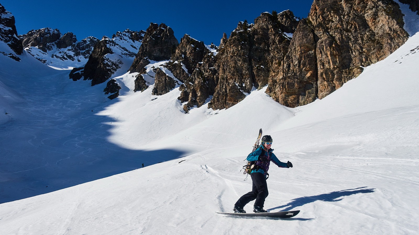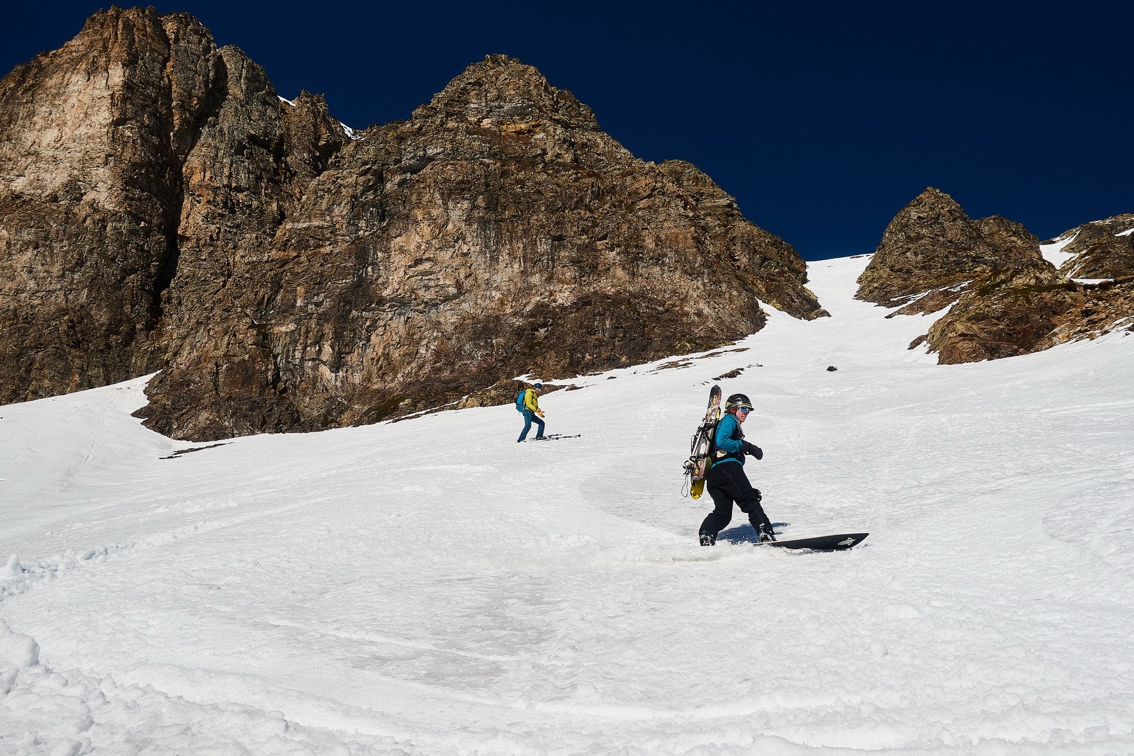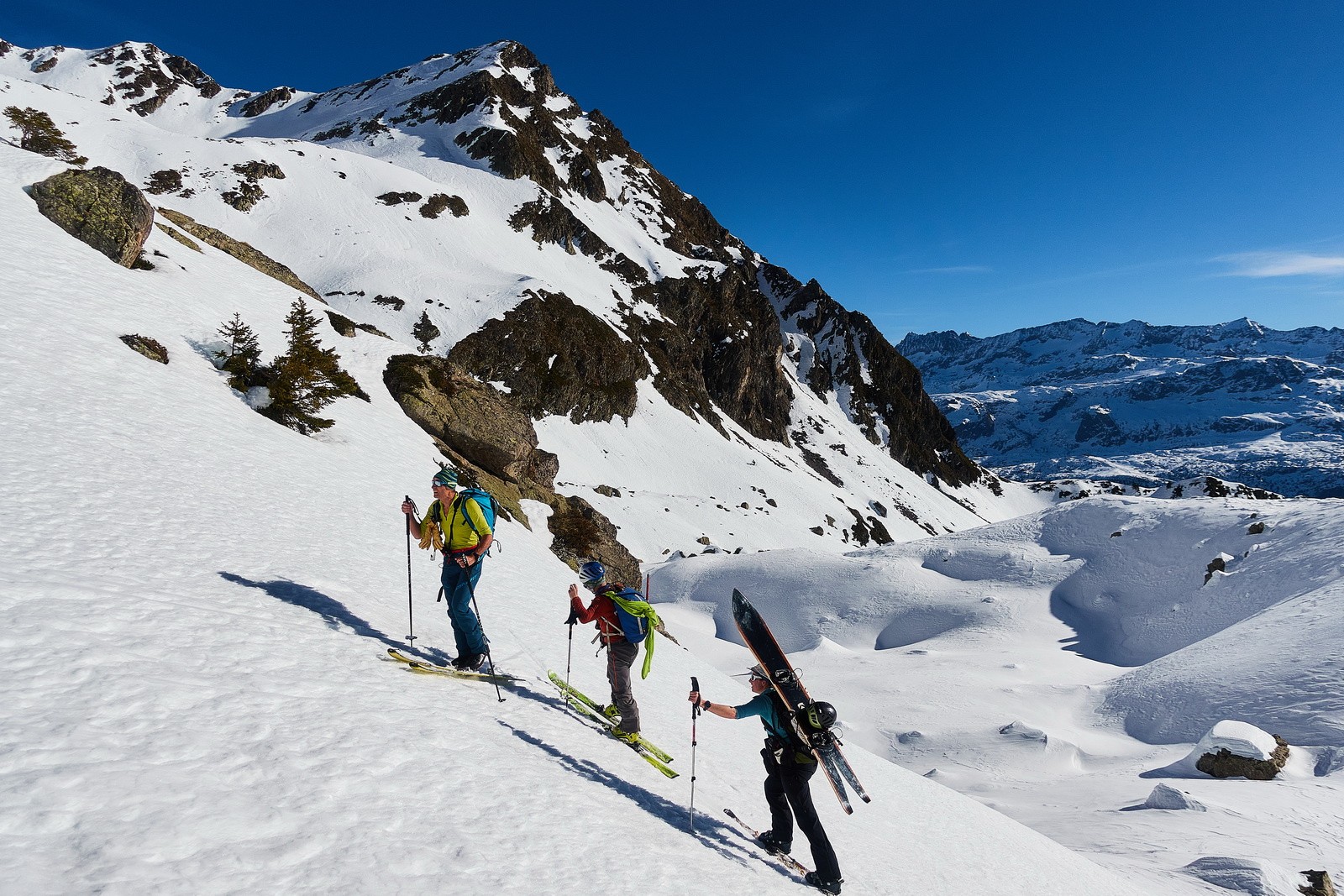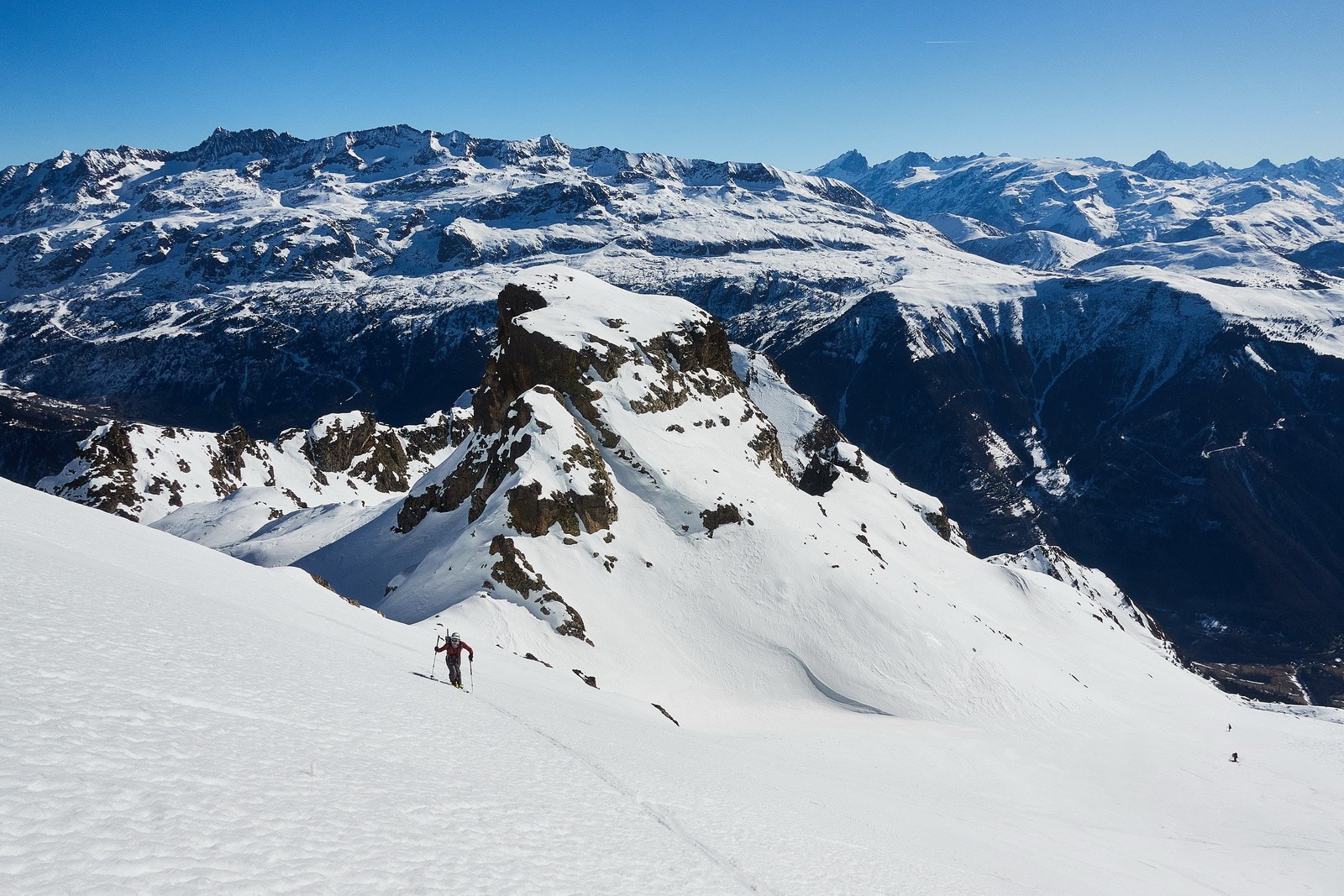 Après une descente plein Sud des grandes pentes dominant la vallée atypique du Bourg d’Oisans, nous voilà repartis dans la poursuite de la boucle vers le Vallon du Chazeau, nous offrant de nouveaux panoramas grandioses sur ce coin retiré de Belledonne, en nous faisant presque oublier la qualité moyenne de la neige globalement assez changeante et rapidement déficitaire sur le bas.