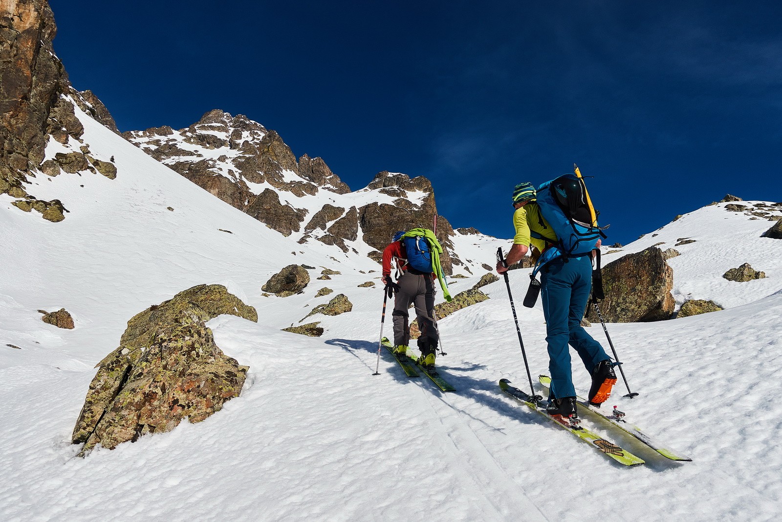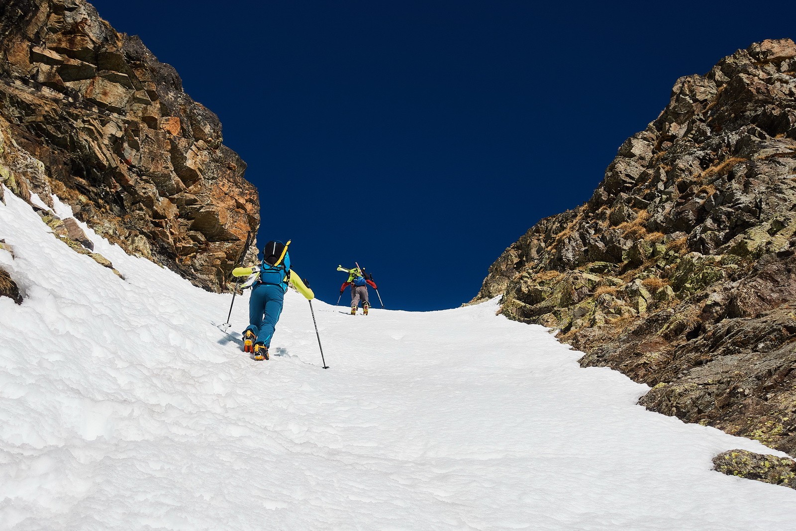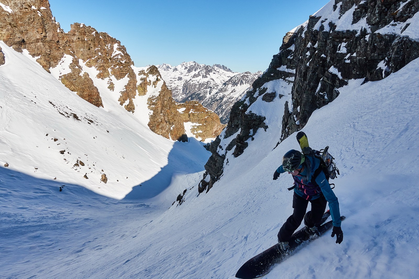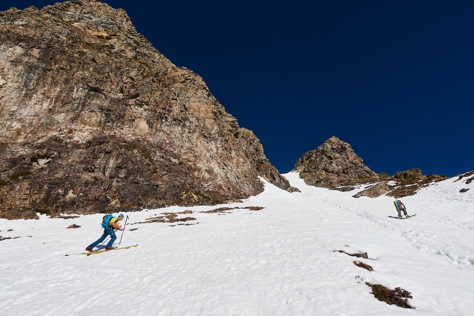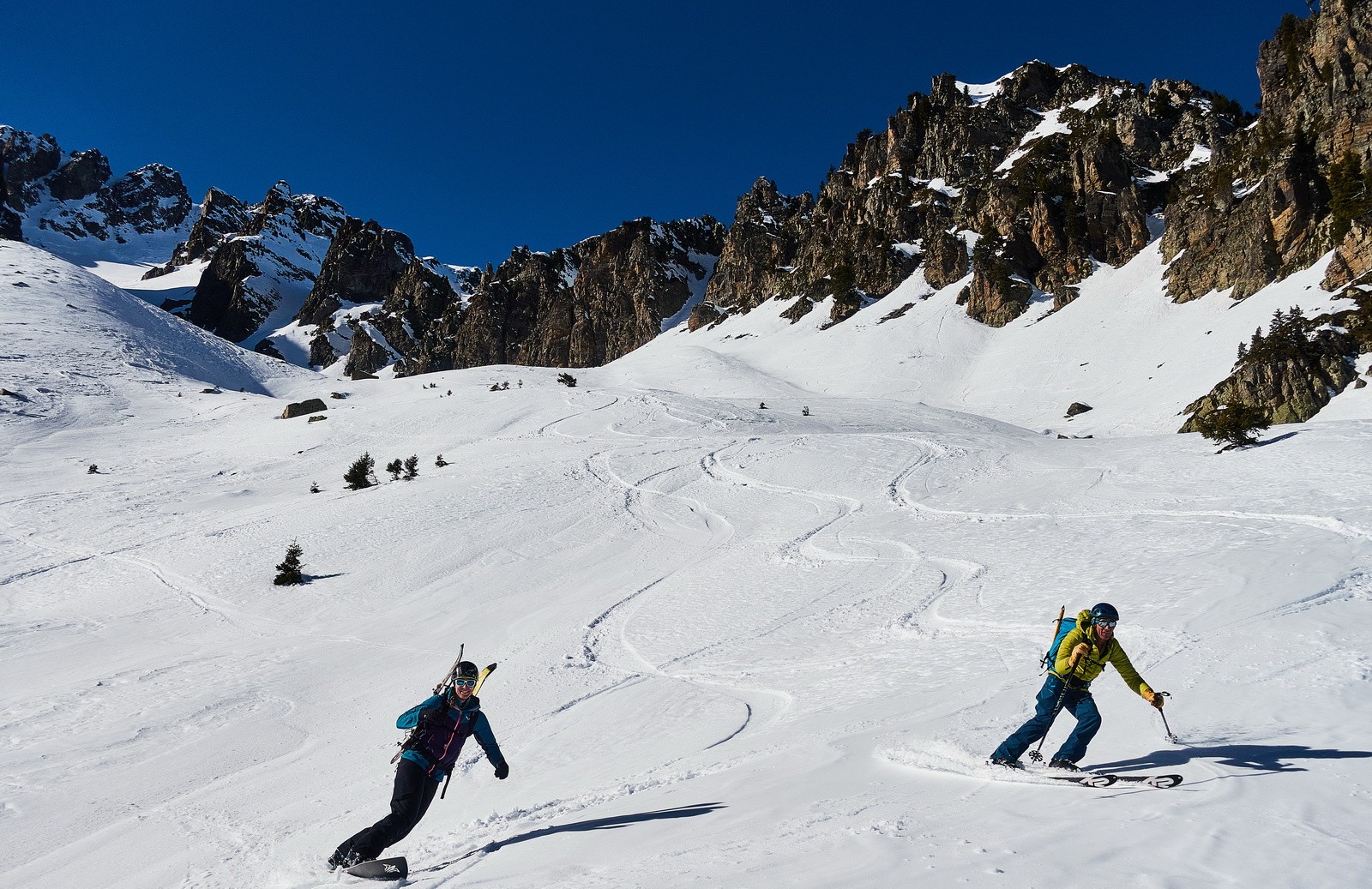 Après une approche sportive en forêt et la découverte des grandes pentes d’accès du côté des Sagnes, nous nous engageons dans le plat de résistance. Alizé et Lionel profitent à leur manière de la combe suspendue tandis que SDX et moi-même partons pour l’ascension du couloir sommital.