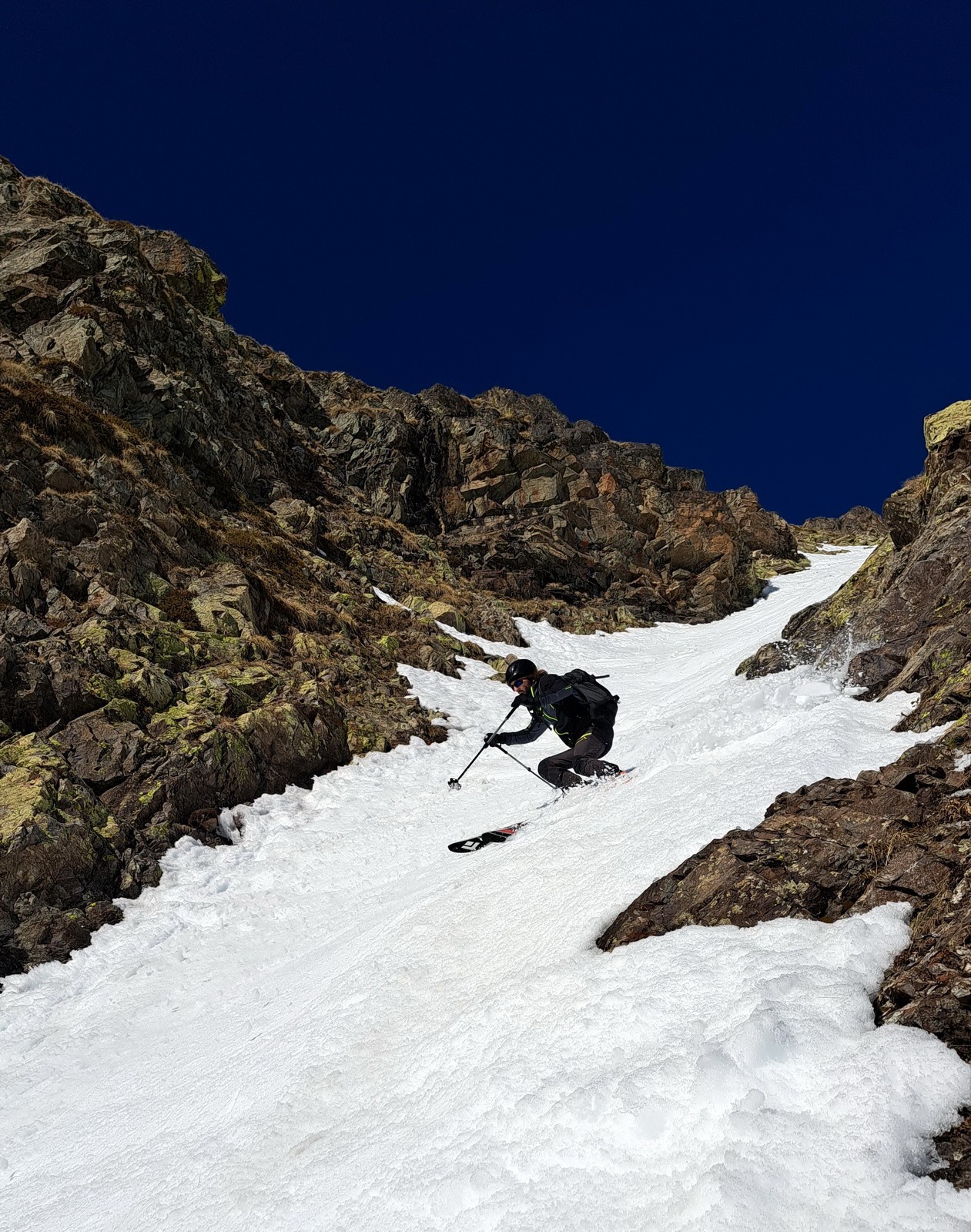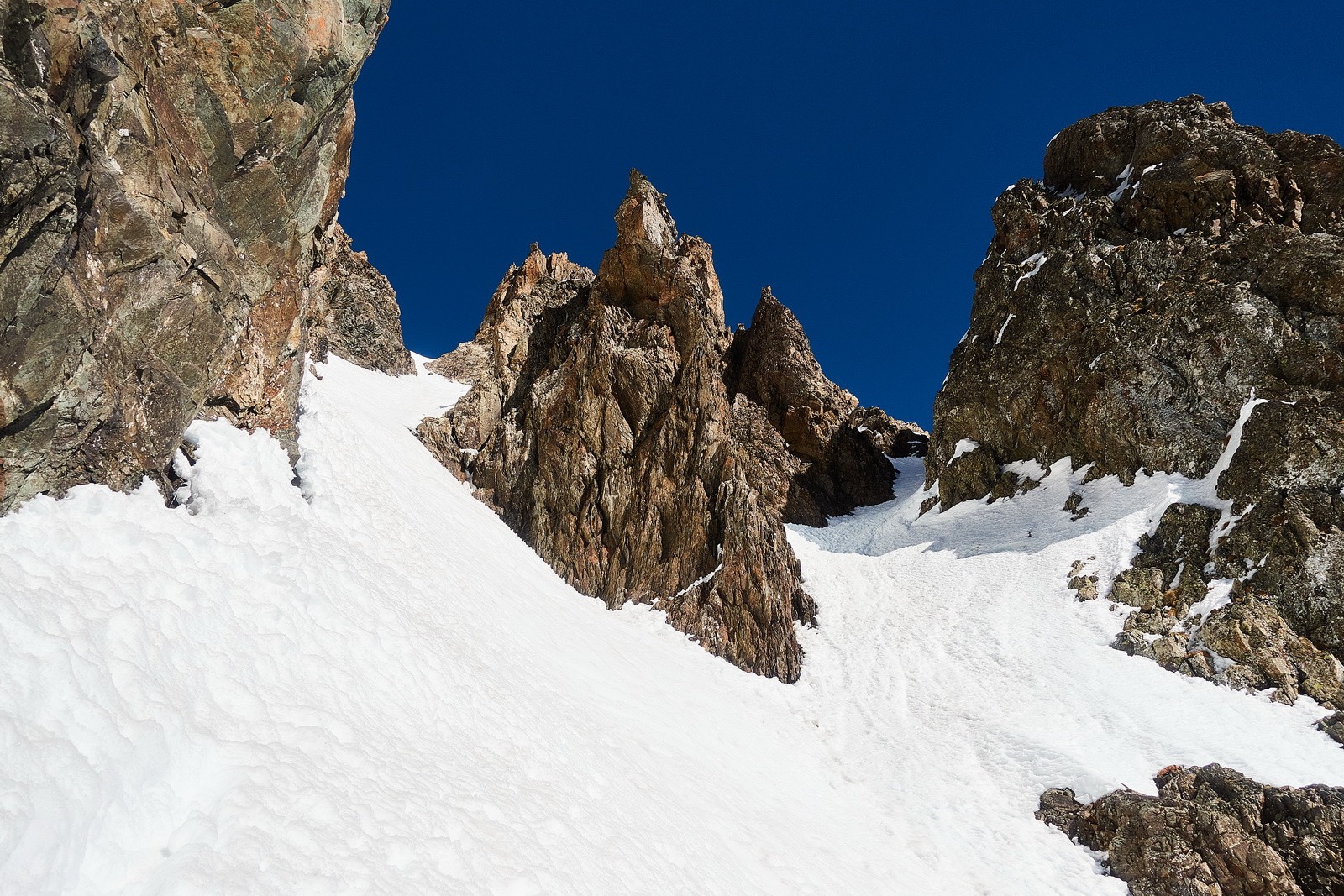 Le couloir supérieur n’est pas en bonnes conditions, râpé sur le haut, aux pentes concaves, avec quelques rochers saillants et un fond resté très dur, notamment sur les rives, malgré l’humidification en surface (sur 1-2 cms seulement).