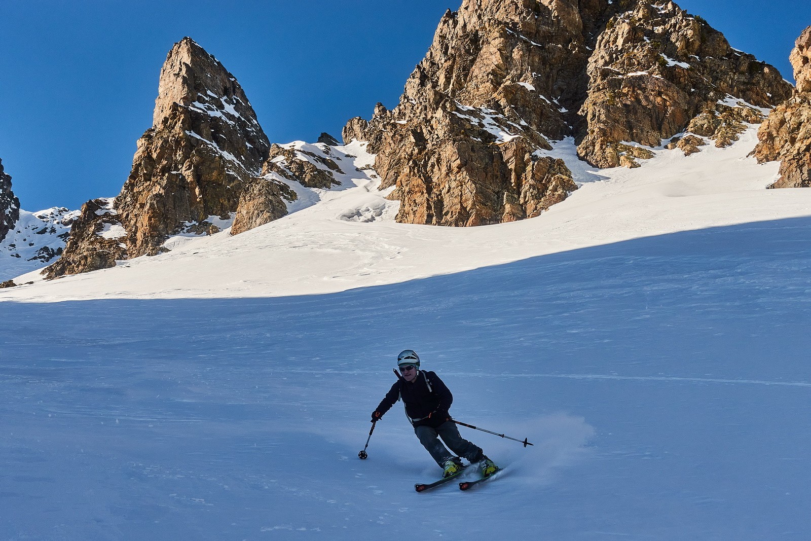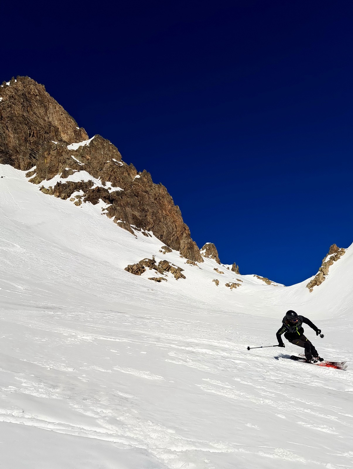 Double Couloir SE : neige assez changeante malgré un décaillage conséquent. Certaines zones compactées restent assez dures et zippantes. De bonnes sections transfo dans la combe suspendue.