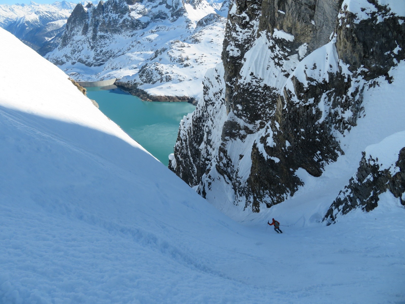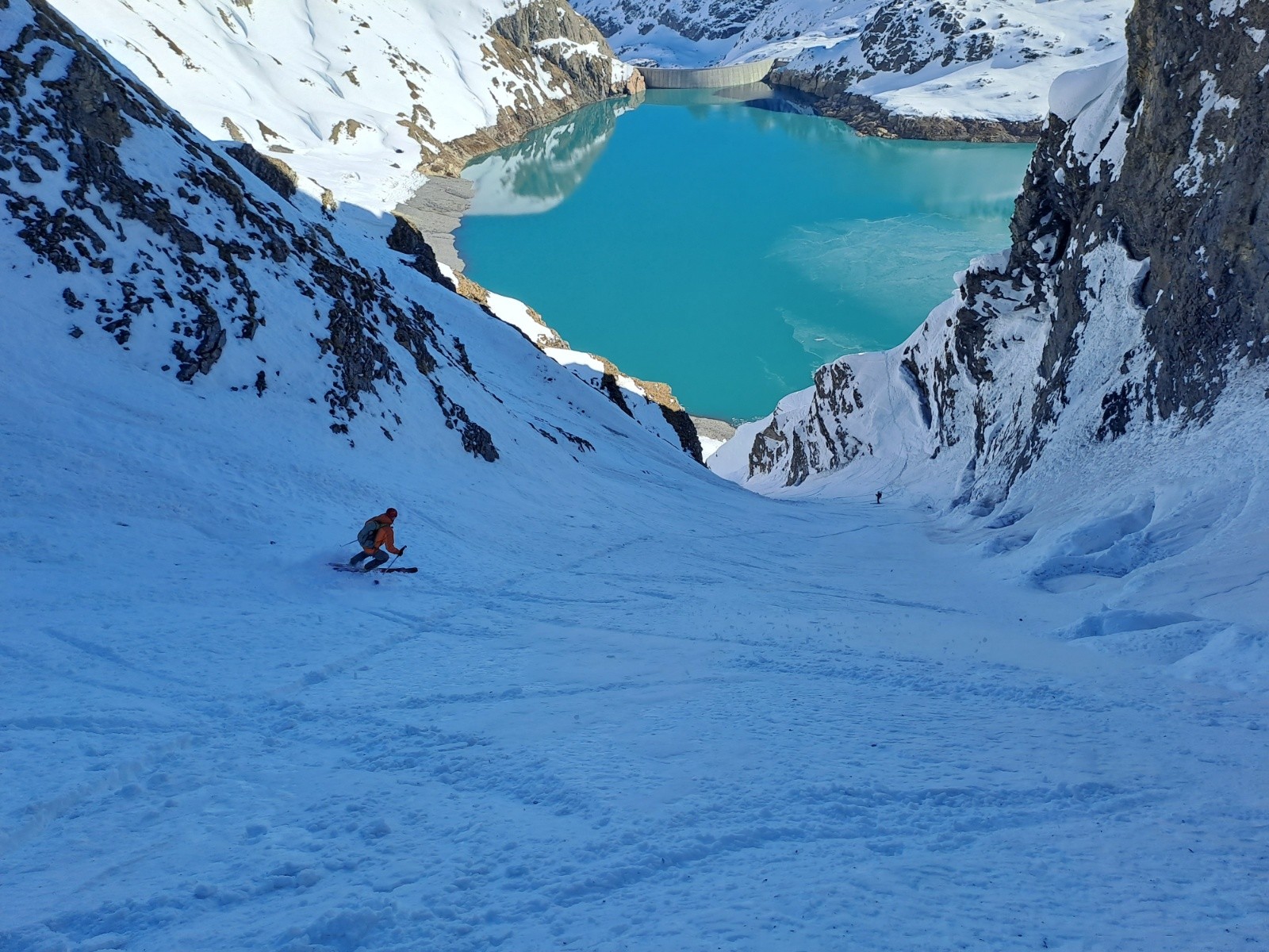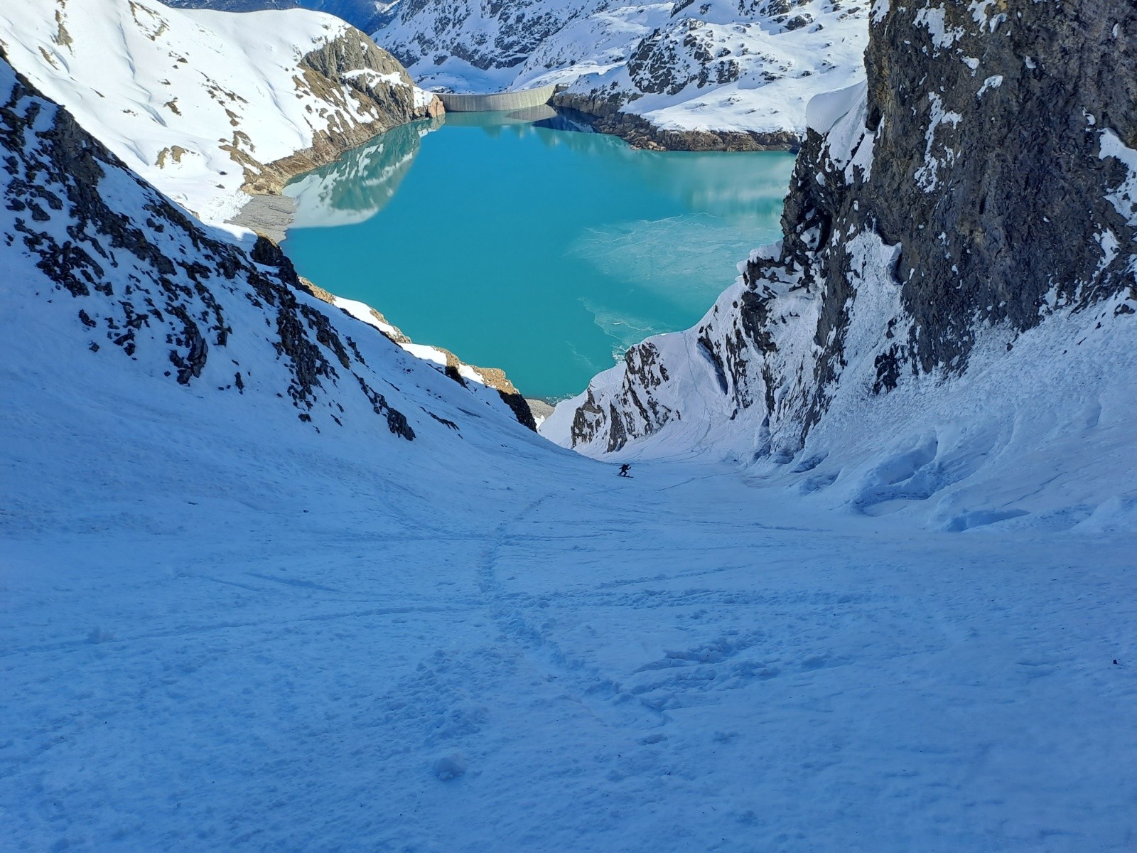 Descente 5***** en poudre tassée jusqu'au lac du Vieux Emosson. Ce dernier émet des bruits, parle, gémit, chante... Le début de la débâcle!