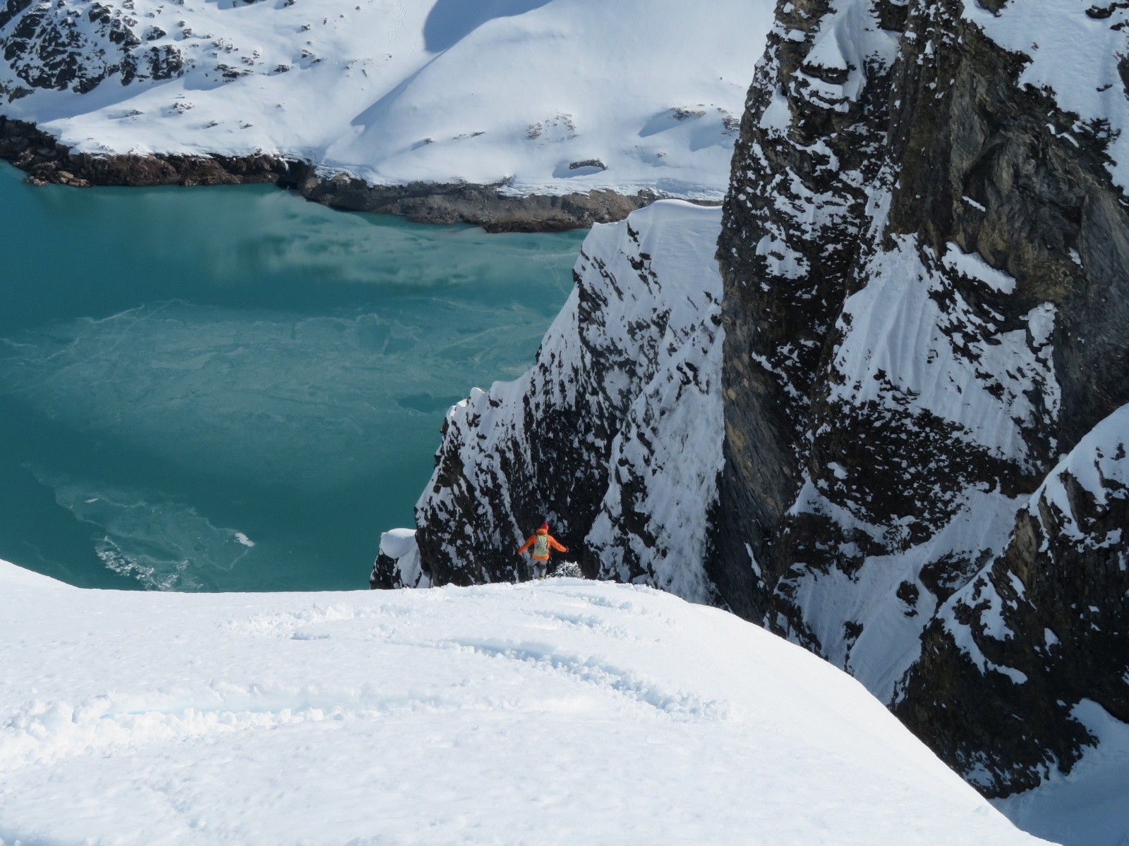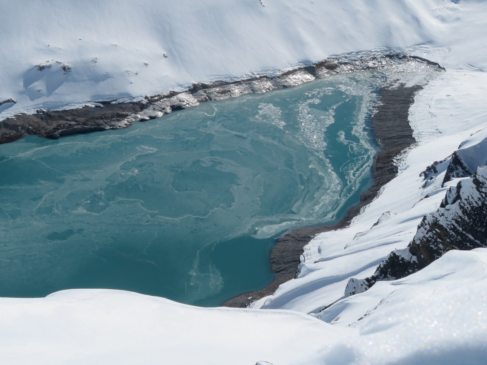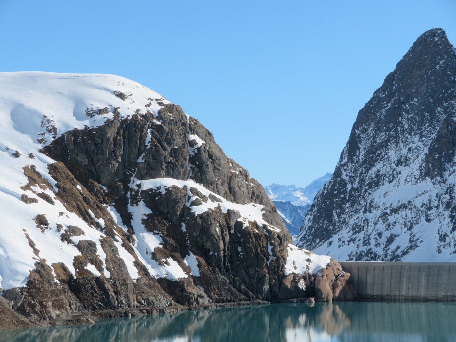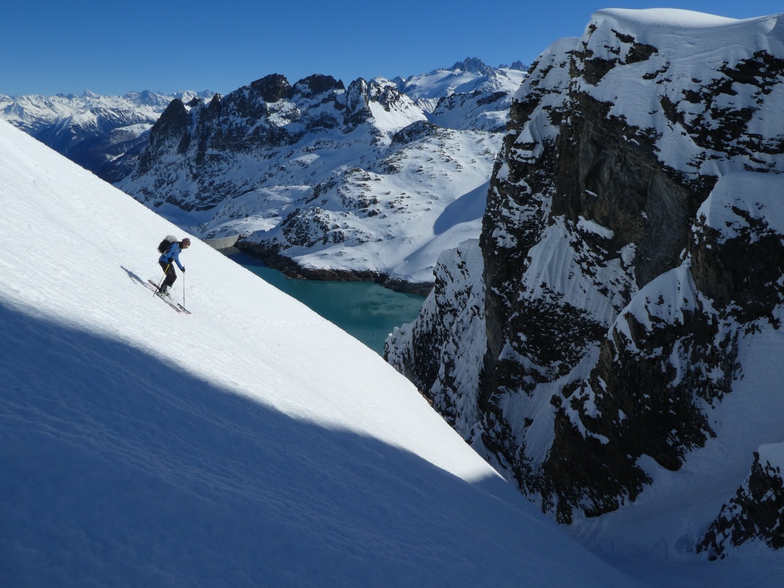 Descente 5***** en poudre tassée jusqu'au lac du Vieux Emosson. Ce dernier émet des bruits, parle, gémit, chante... Le début de la débâcle!