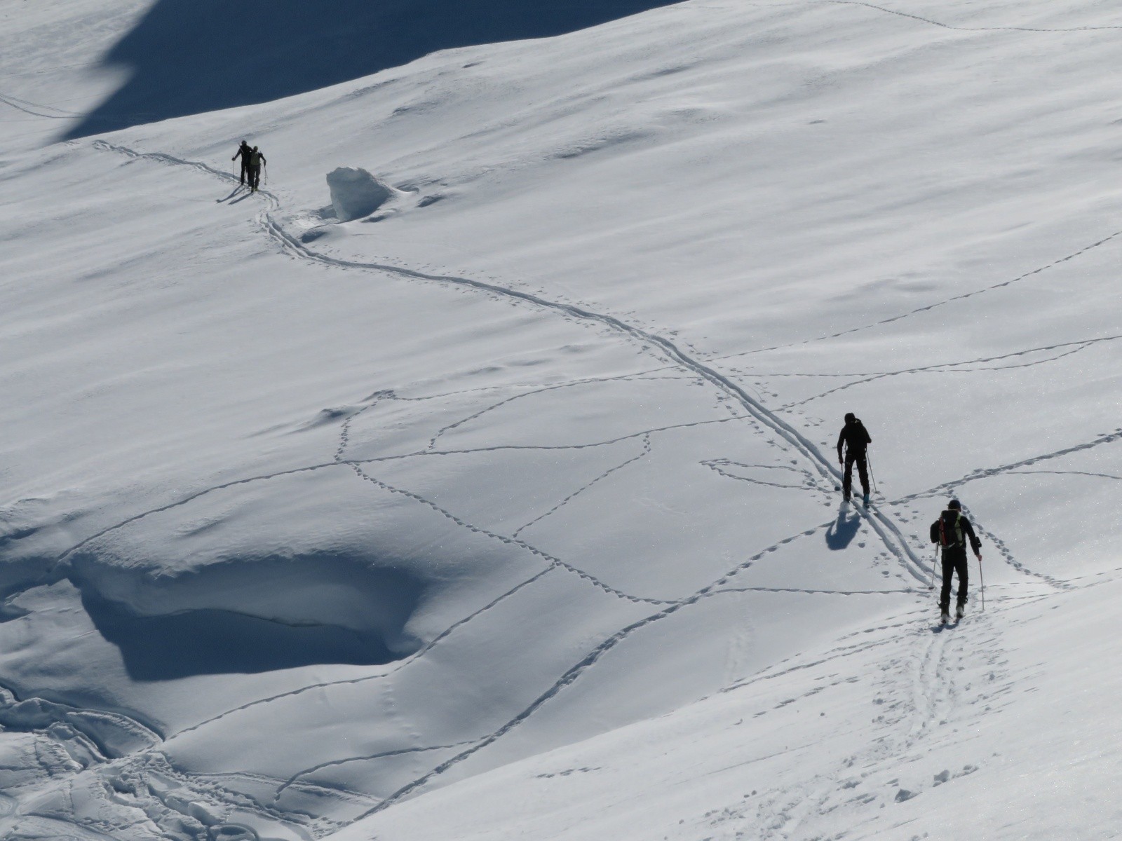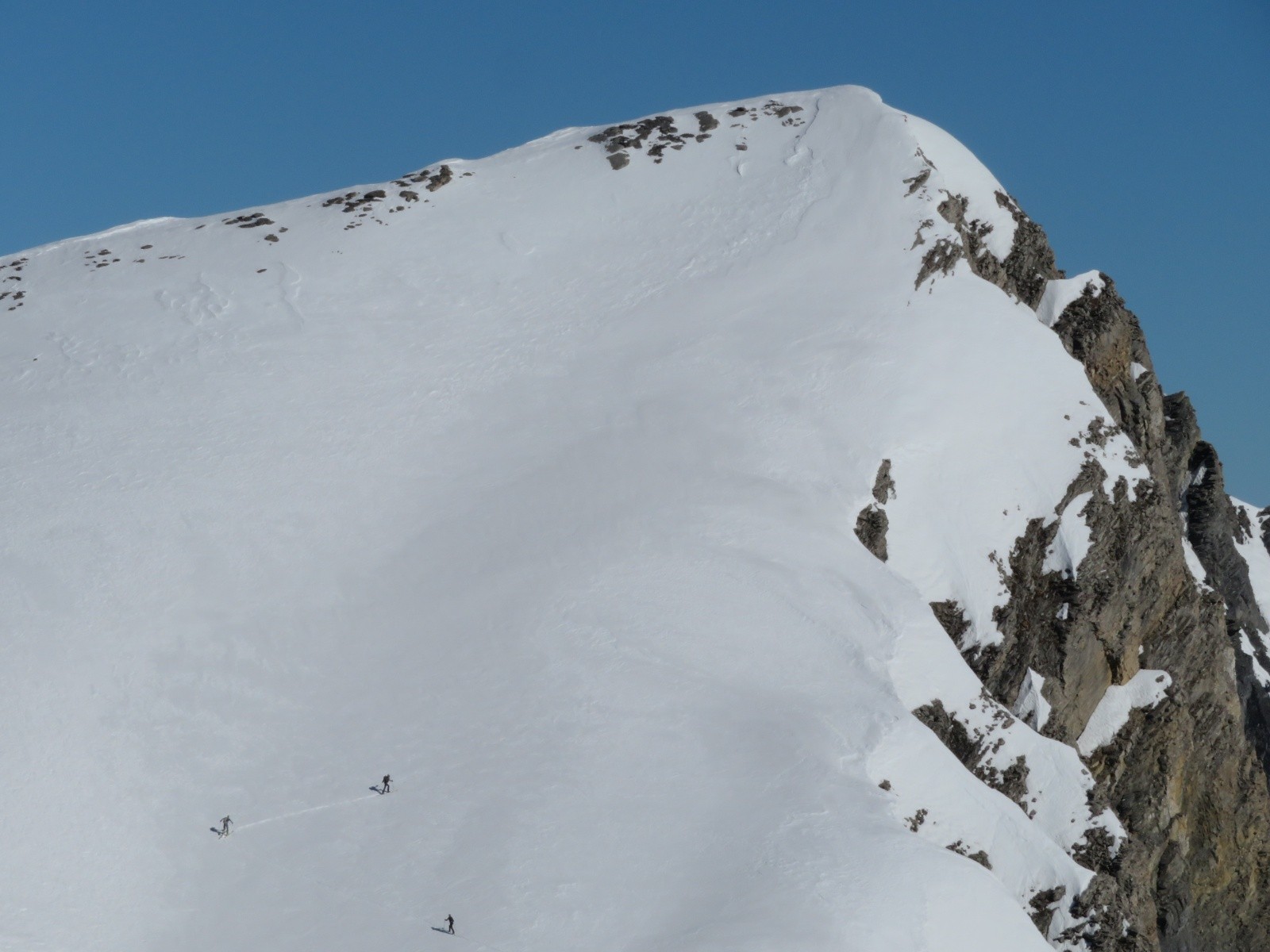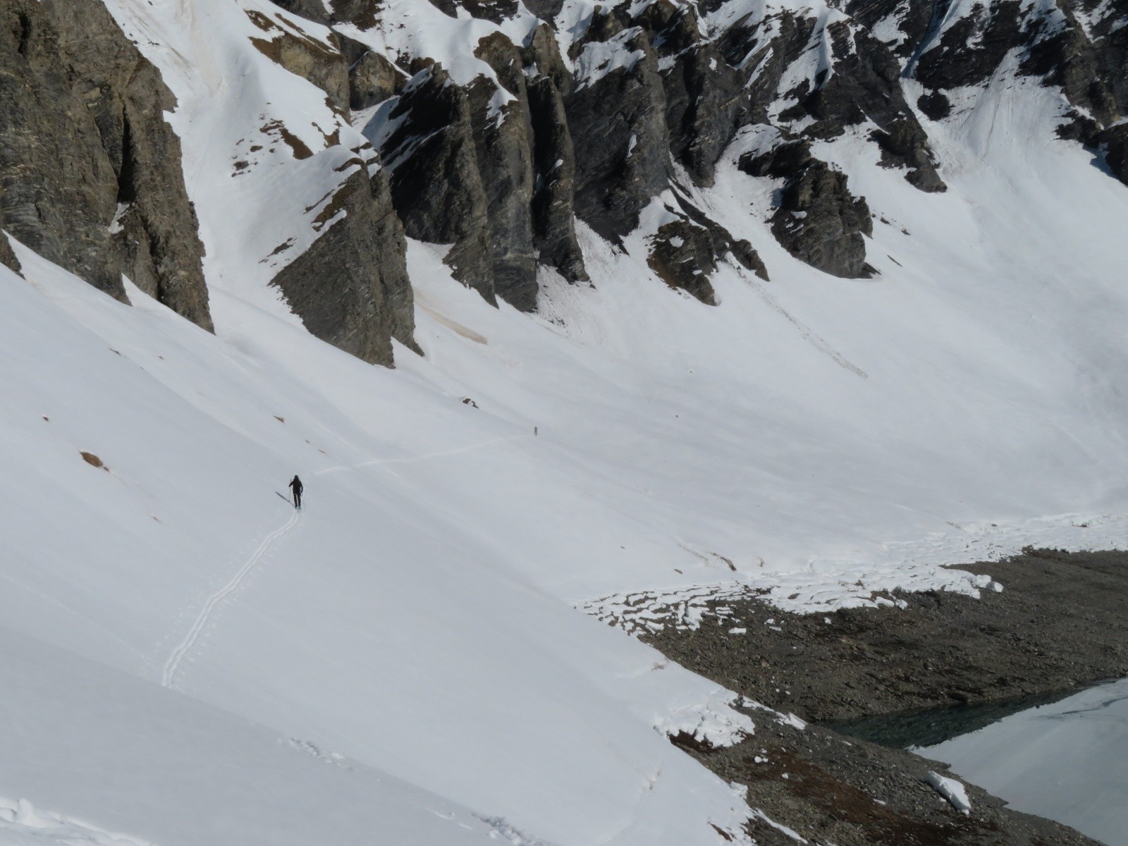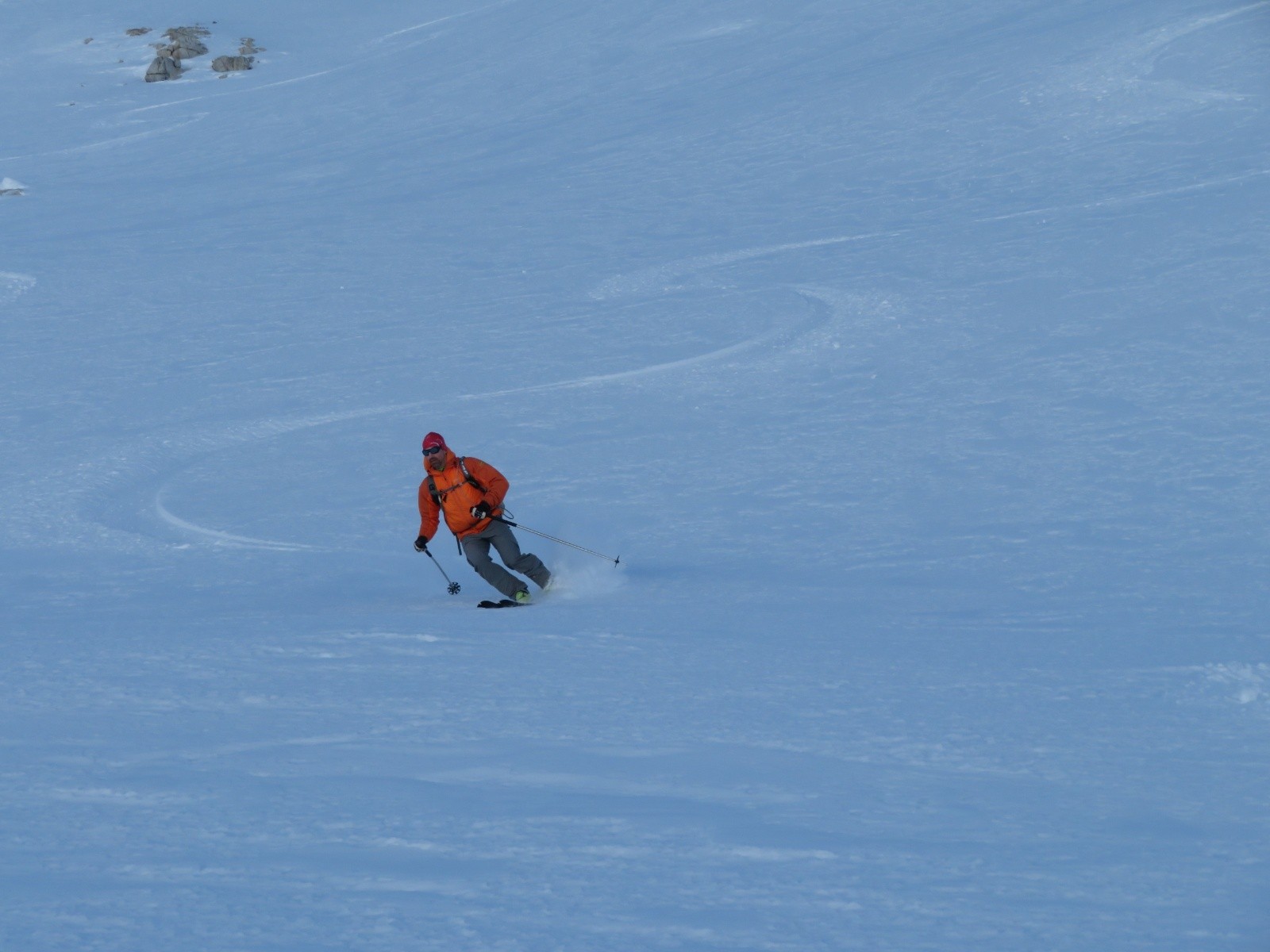 On gagne le pied du couloir de Grenairon, magnifique. La neige est zippante, dure par endroits. Jé fait la trace. Toutes les options sont possibles: montée à skis avec ou sans couteaux, montée à pied sur une section... Depuis qu'on a quitté le col de la Terrasse, on se sent inséré dans un univers sauvage. La descente de la combe N du col du Grenairon est aussi en poudre tassée, excellente à skier. Remontée à la pointe des Cavales. Les potes rajoutent une pointe de la Finive en aller-retour (bonne neige). On revient sur le couloir de Grenairon. Vu d'en haut, on a l'impression d'être en Norvège, dans les fjords...