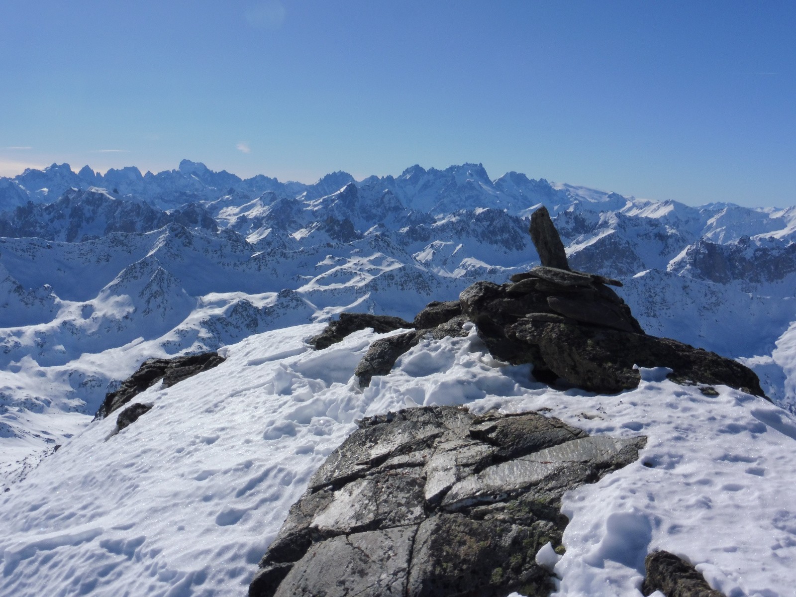 La vue au sommet est incroyable. A 360 degrés : le Mont Thabor (avec le Viso derrière à gauche), la Barre des Ecrins, La Meije, les Aiguilles d'Arves, le Mont Blanc, la Dent Parrachée.