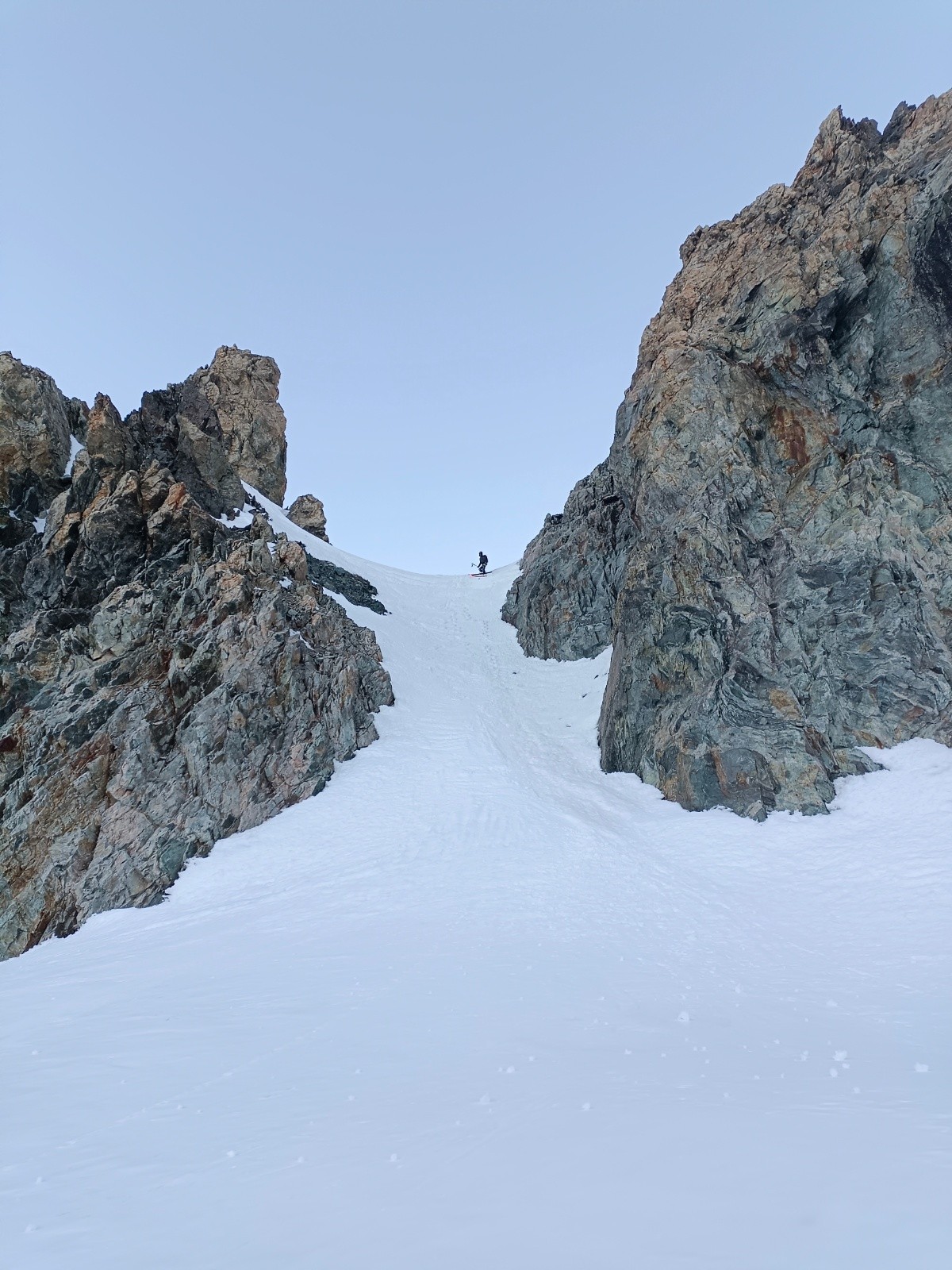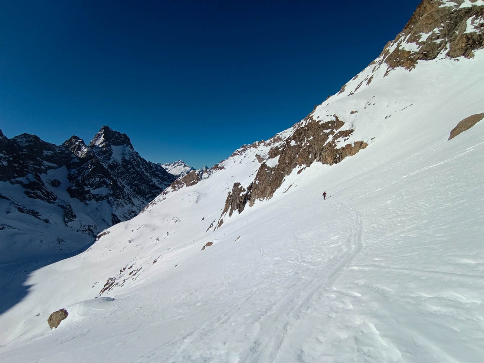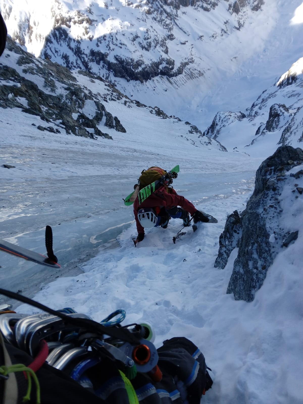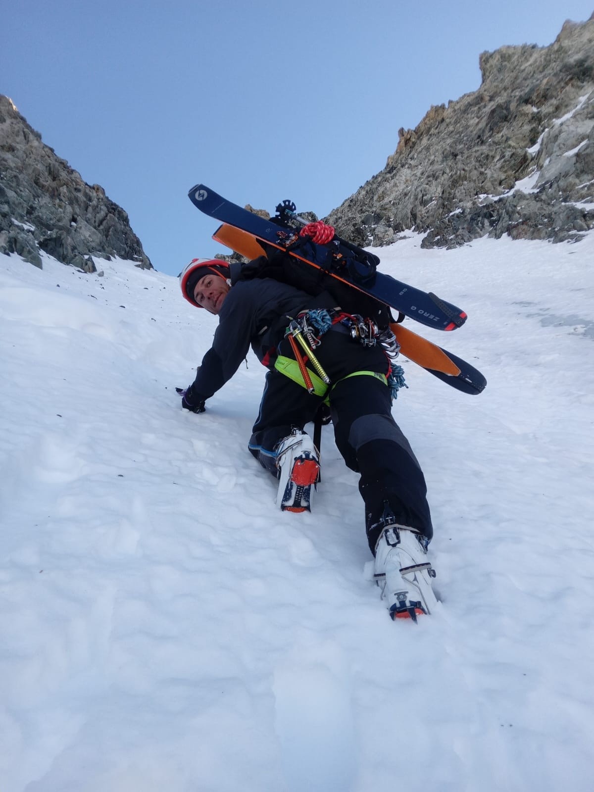 C'est loooong mais c'est bôôô. Couloir de neige dure en bas, croûtée par endroits, légèrement poudreuse à d'autres. Passage expo à la fin, à côté du belle langue de glace noire avec une courte sortie dans du rocher désintégré pour arriver au col, seul endroit où on a sorti la corde. Descente tranquille sur le glacier blanc, relativement bien bouché, comme tous les glaciers que l'on a parcourus. Ski 4x4 jusqu'au pré de Mme Carles. Les genoux couinent, les chaussettes tremblent encore mais quel bel itinéraire, dans un massif sauvage et somptueux.