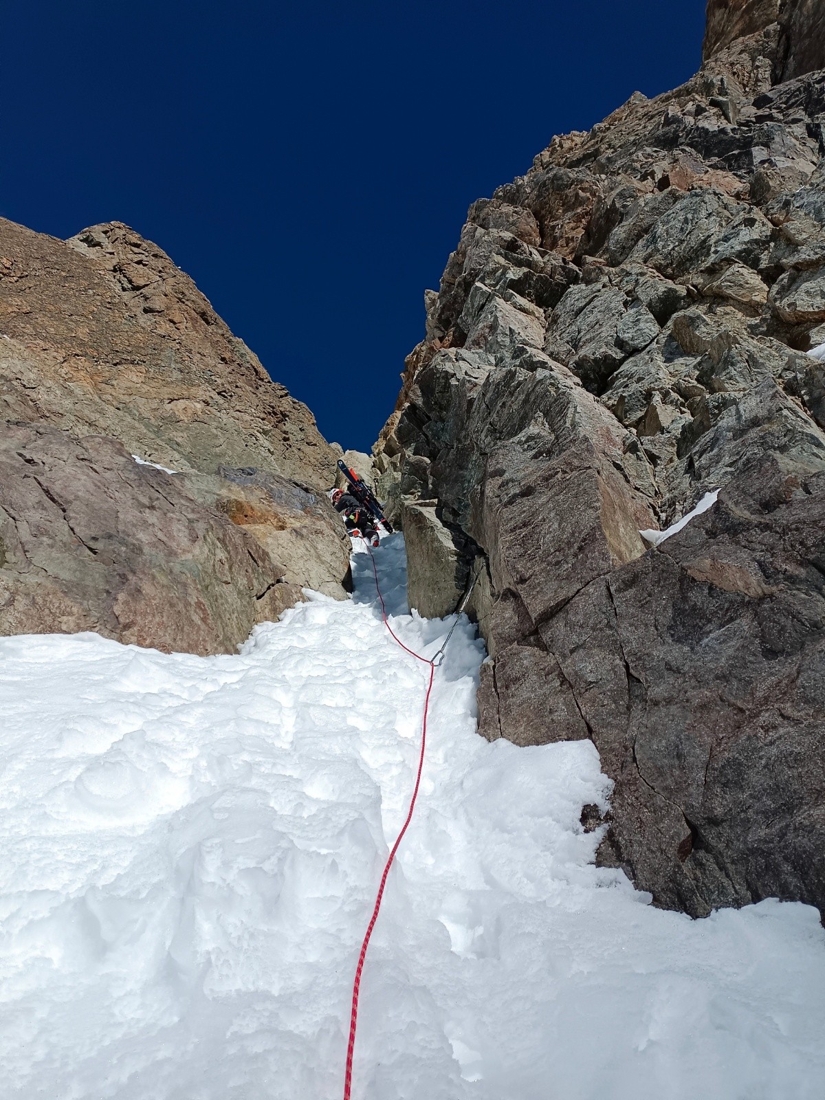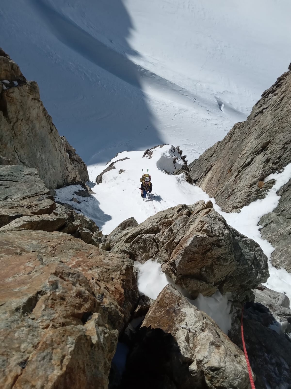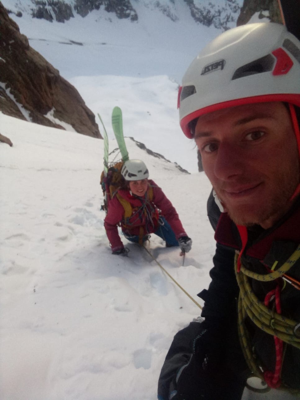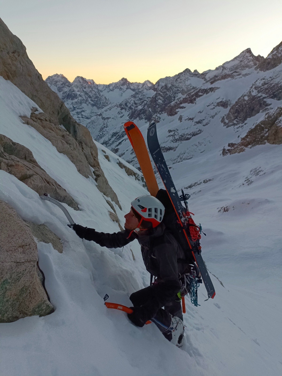 C'est loooong mais c'est bôôô. Couloir de neige dure en bas, croûtée par endroits, légèrement poudreuse à d'autres. Passage expo à la fin, à côté du belle langue de glace noire avec une courte sortie dans du rocher désintégré pour arriver au col, seul endroit où on a sorti la corde. Descente tranquille sur le glacier blanc, relativement bien bouché, comme tous les glaciers que l'on a parcourus. Ski 4x4 jusqu'au pré de Mme Carles. Les genoux couinent, les chaussettes tremblent encore mais quel bel itinéraire, dans un massif sauvage et somptueux.
