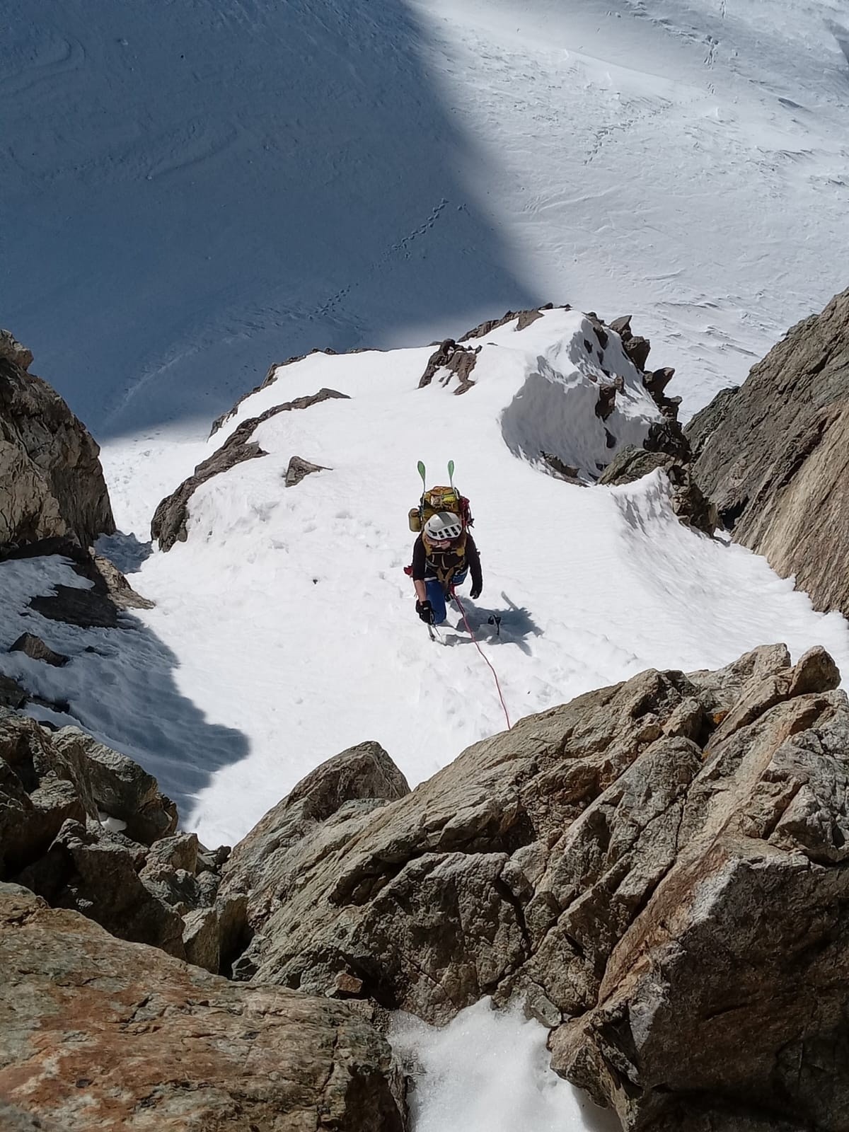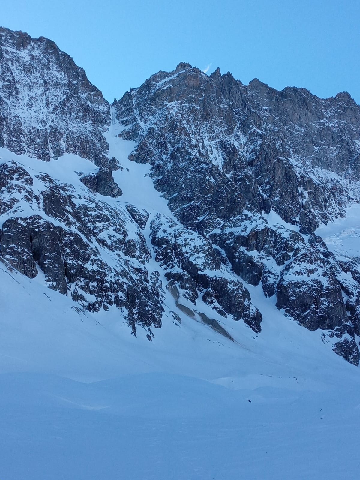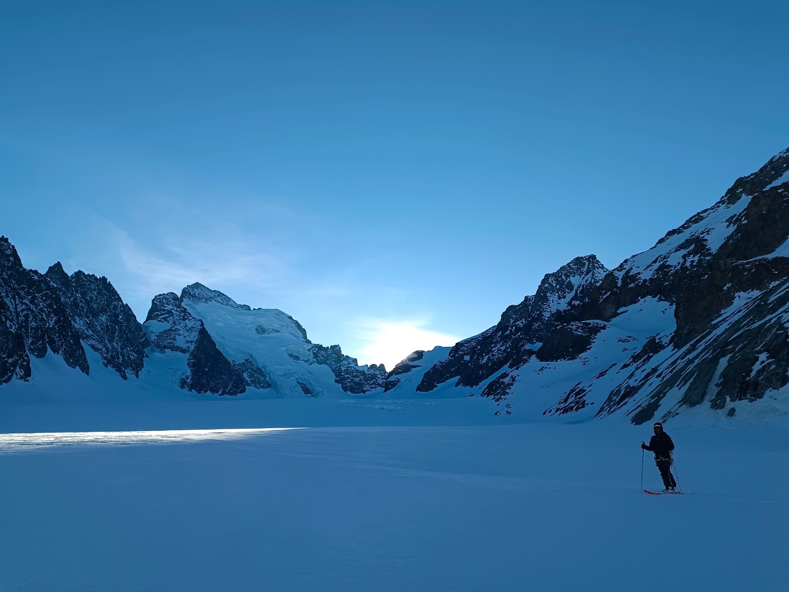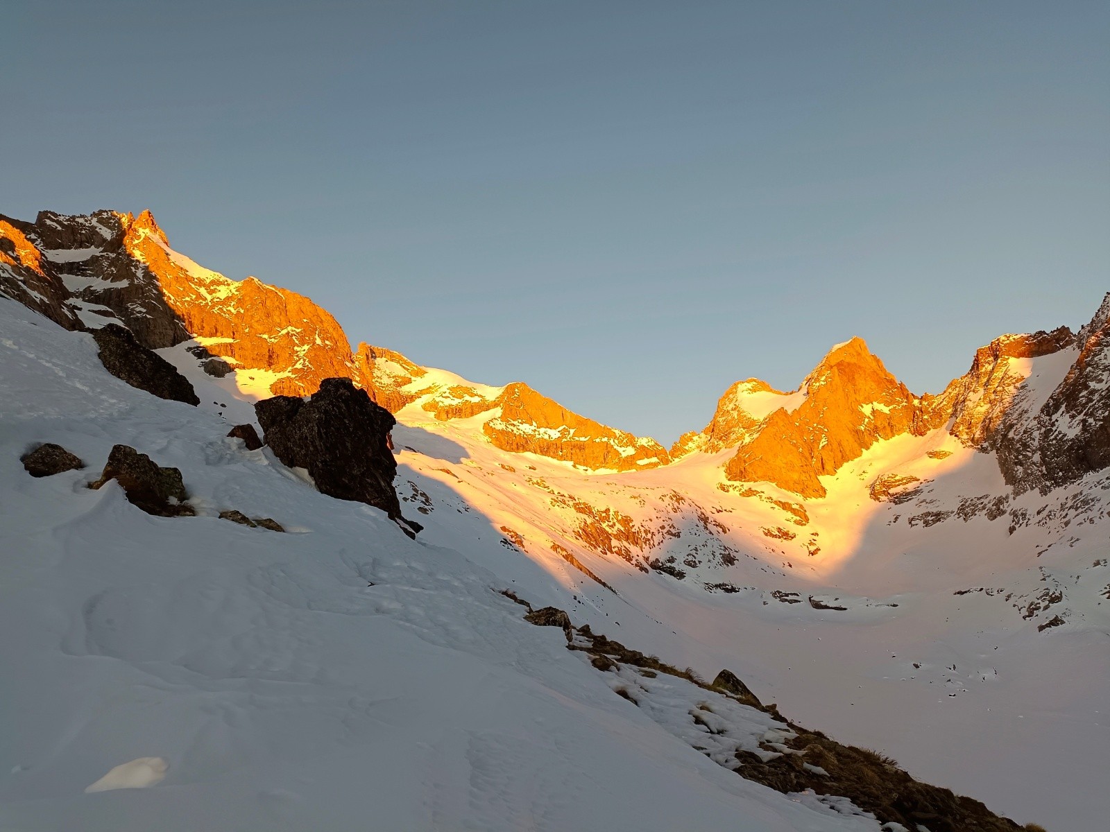 C'est loooong mais c'est bôôô. Couloir de neige dure en bas, croûtée par endroits, légèrement poudreuse à d'autres. Passage expo à la fin, à côté du belle langue de glace noire avec une courte sortie dans du rocher désintégré pour arriver au col, seul endroit où on a sorti la corde. Descente tranquille sur le glacier blanc, relativement bien bouché, comme tous les glaciers que l'on a parcourus. Ski 4x4 jusqu'au pré de Mme Carles. Les genoux couinent, les chaussettes tremblent encore mais quel bel itinéraire, dans un massif sauvage et somptueux.