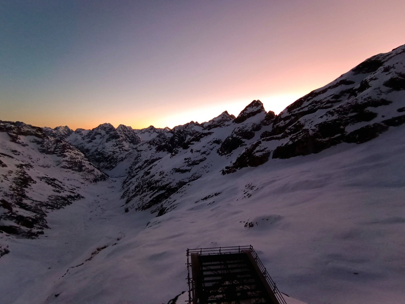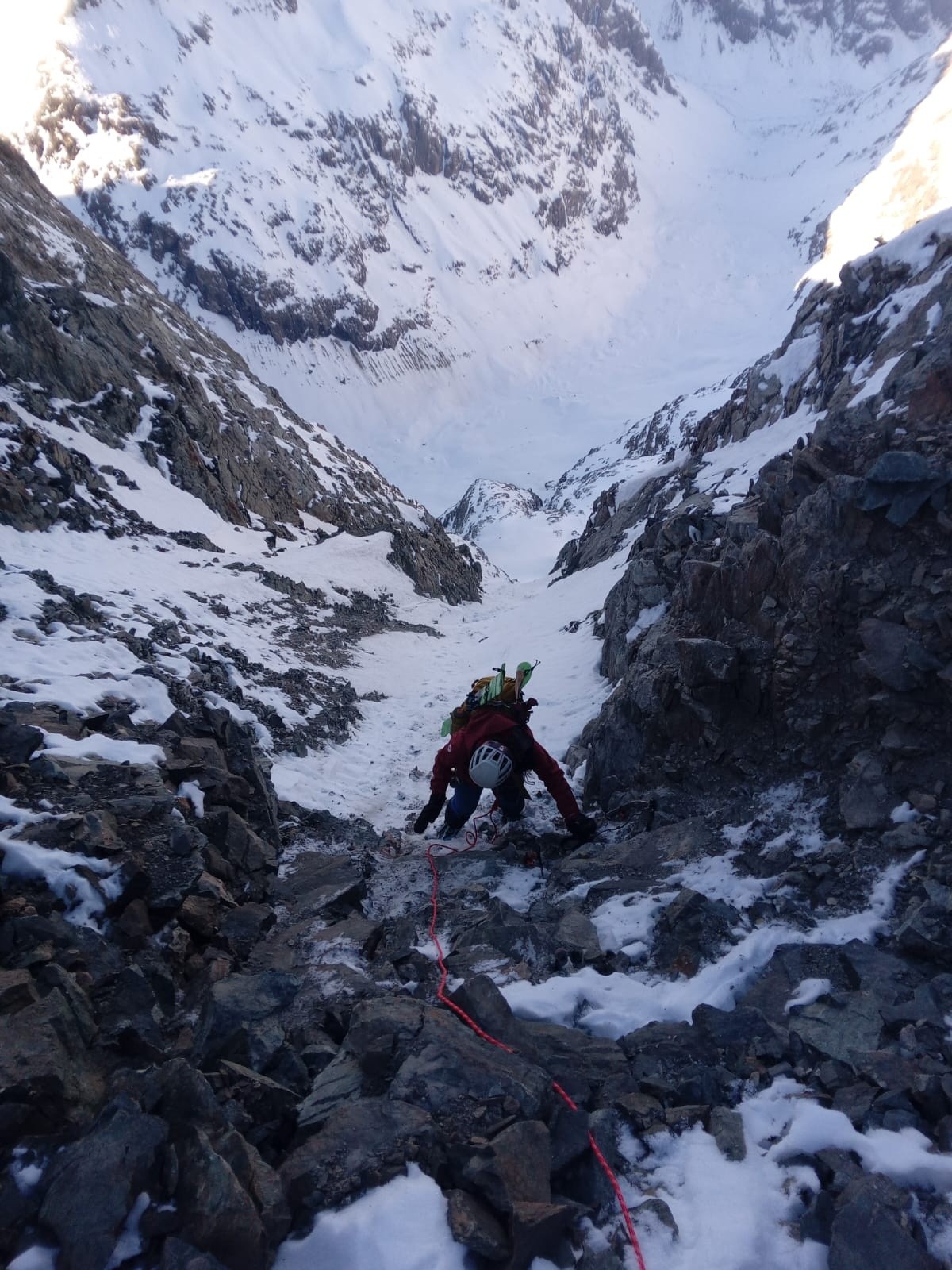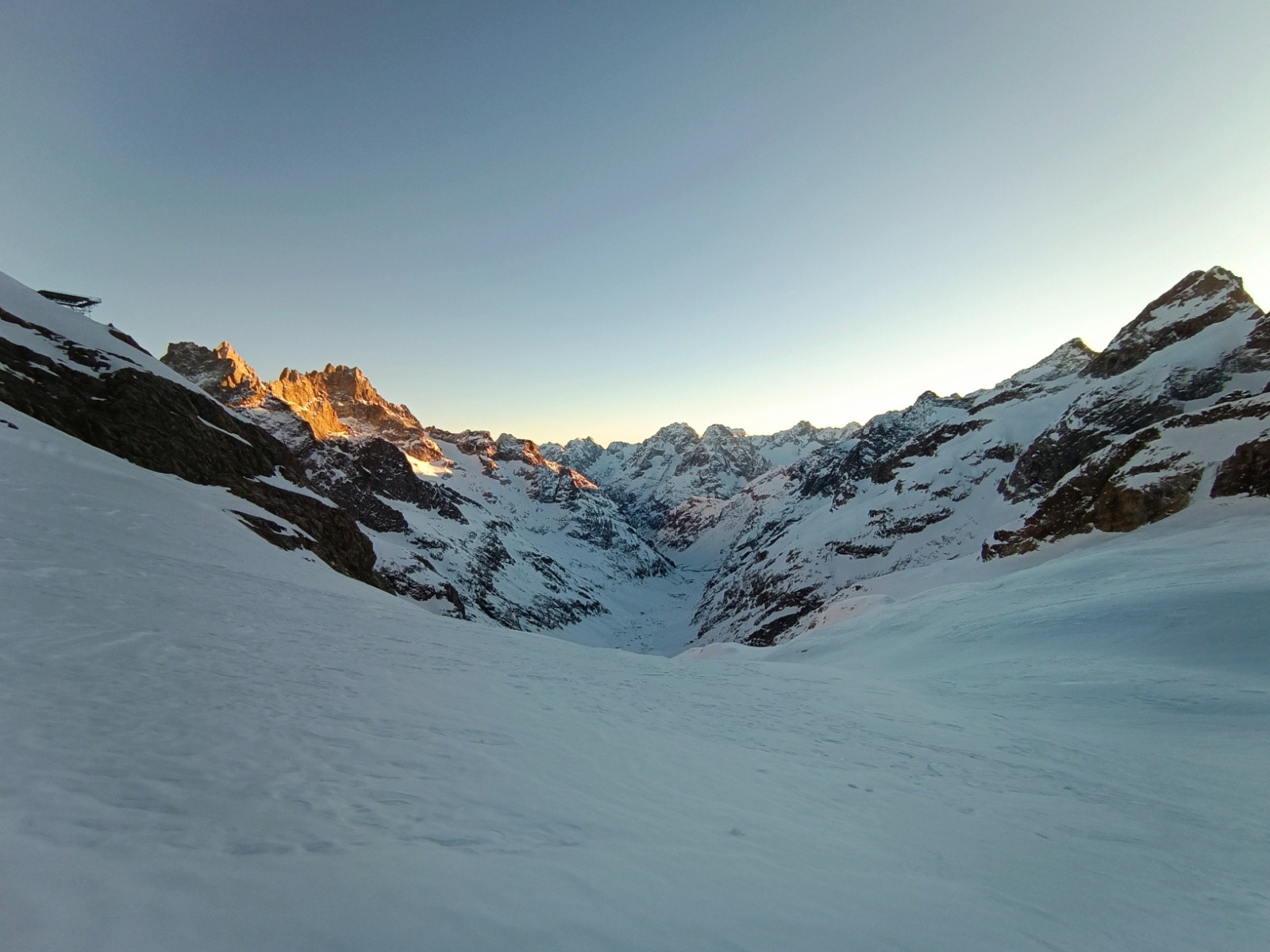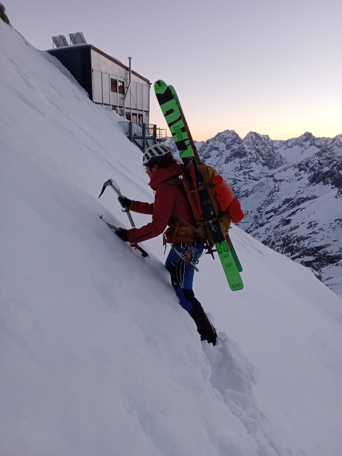 C'est loooong mais c'est bôôô. Couloir de neige dure en bas, croûtée par endroits, légèrement poudreuse à d'autres. Passage expo à la fin, à côté du belle langue de glace noire avec une courte sortie dans du rocher désintégré pour arriver au col, seul endroit où on a sorti la corde. Descente tranquille sur le glacier blanc, relativement bien bouché, comme tous les glaciers que l'on a parcourus. Ski 4x4 jusqu'au pré de Mme Carles. Les genoux couinent, les chaussettes tremblent encore mais quel bel itinéraire, dans un massif sauvage et somptueux.