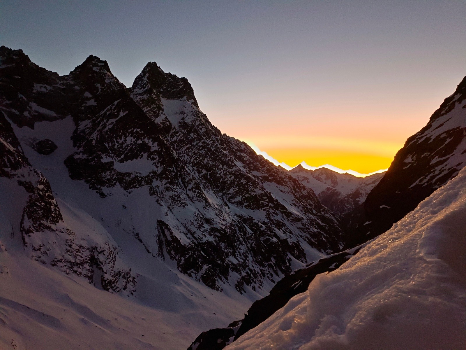 Le PG nous cherche : " Vous êtes morts ? Vos proches pensent que vous êtes morts. " Non mais ma mère refuse de croire qu'on n'ait pas de réseau dans les Écrins... Objectif col des Chamois, le type du PG déconseille : " C'est sec les Chamois, pas sûr que ça passe. ". On nous recommande le col du Pavé mais fait tellement chaud qu'après 200m de d+ on décide finalement de dépeauter pour aller attaquer le couloir qui mène au col des Chamois : " Au moins on sera à l'ombre ! " Et ça passe après quelques heures à bourriner, deux longueurs en mixte ou Alexis bricole en tête et fait des allers retours pour récupérer son sac (c'est lourd 5 jours d'autonomie + matos d'alpi + skis). Moi en second je médite sur la pratique de l'alpinisme, tout un art. Partis un peu tard (on craignait que ça soit trop gelé, bonne blague), on arrive au col à la tombée de la nuit. Descente au pavé dans une neige pourrie et changeante et puis trop crevés pour aller jusqu'à l'Alpe du Villard, dodo dans le baraquement du Pavé.