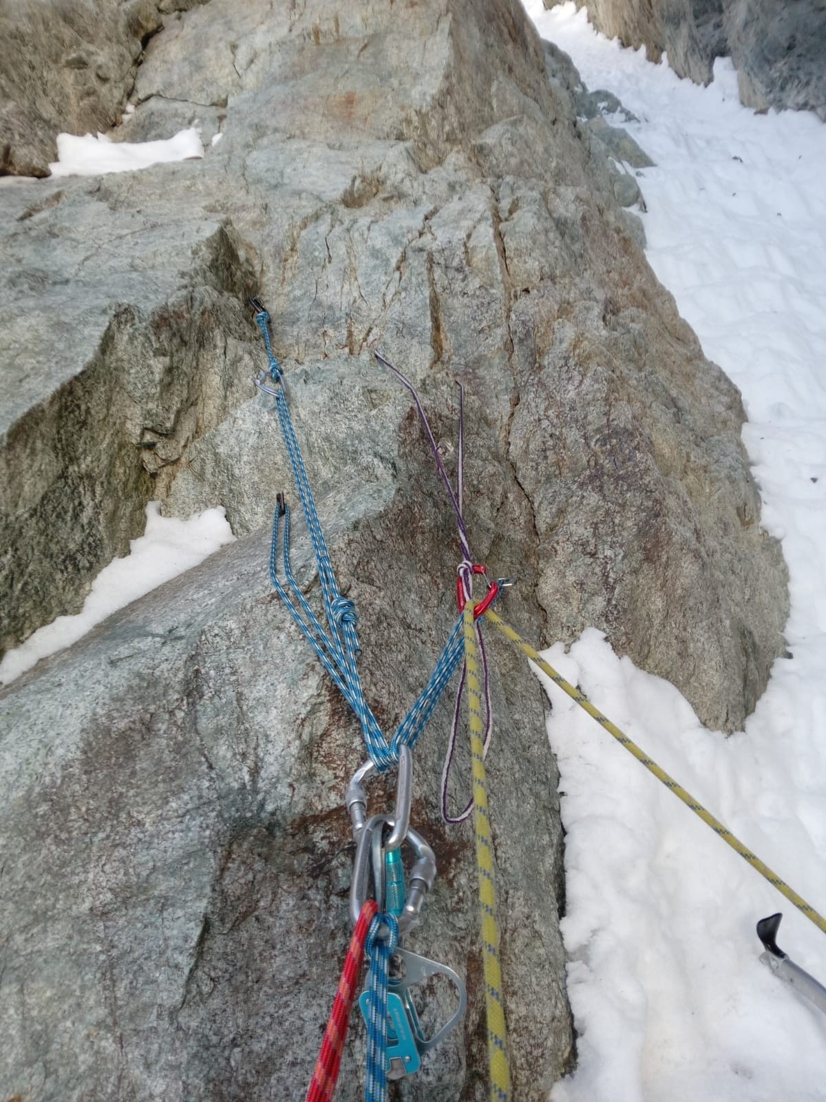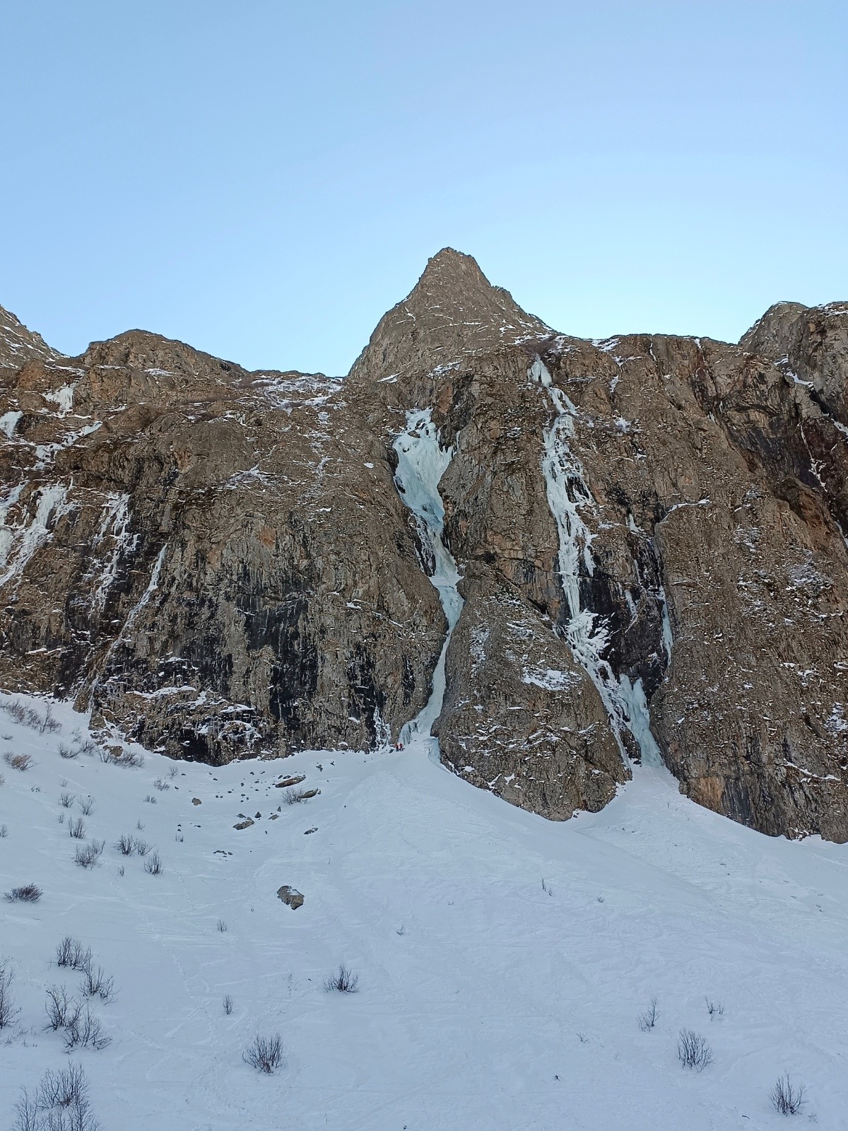 Itinéraire bordé par les cascades de glace, on monte avec la bave au coin des lèvres mais on est trop short en broches.