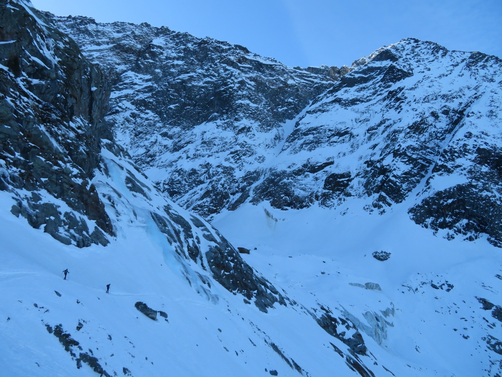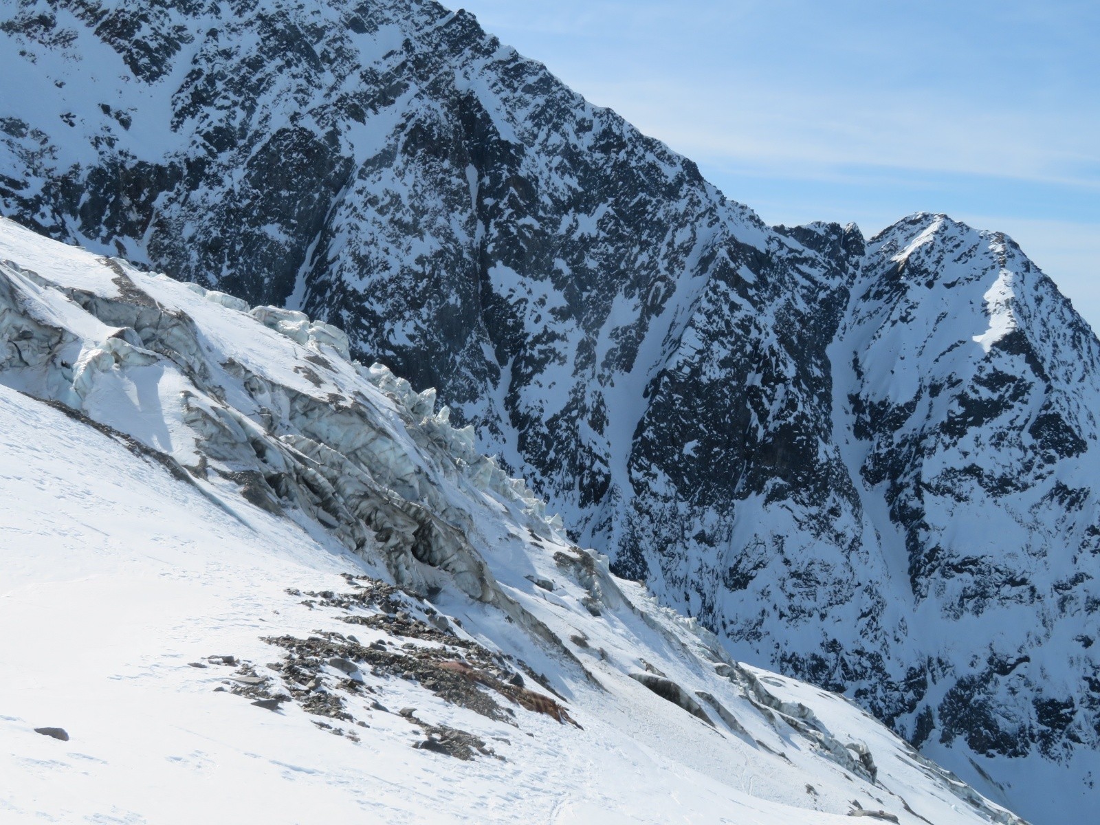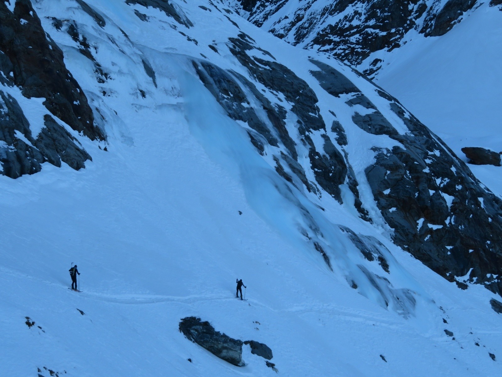 Descente par le vallon W/SW sous le refuge, puis on rejoint le glacier par des pentes S. ça commence à décailler sur les contrepentes bien exposées. Neige changeante plus bas. La descente en rive gauche, à la fin du glacier paraît peu enneigée, on opte par une redescente par l'itinéraire de montée, en franchissant à nouveau la moraine.